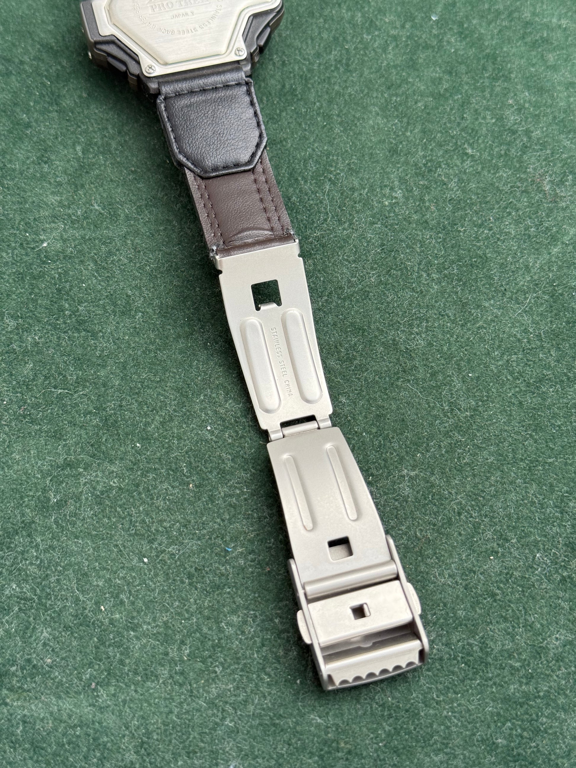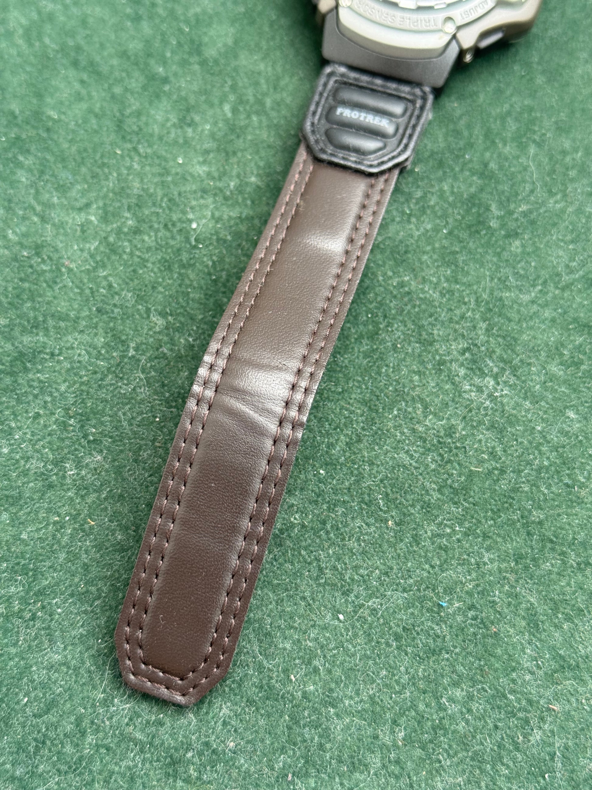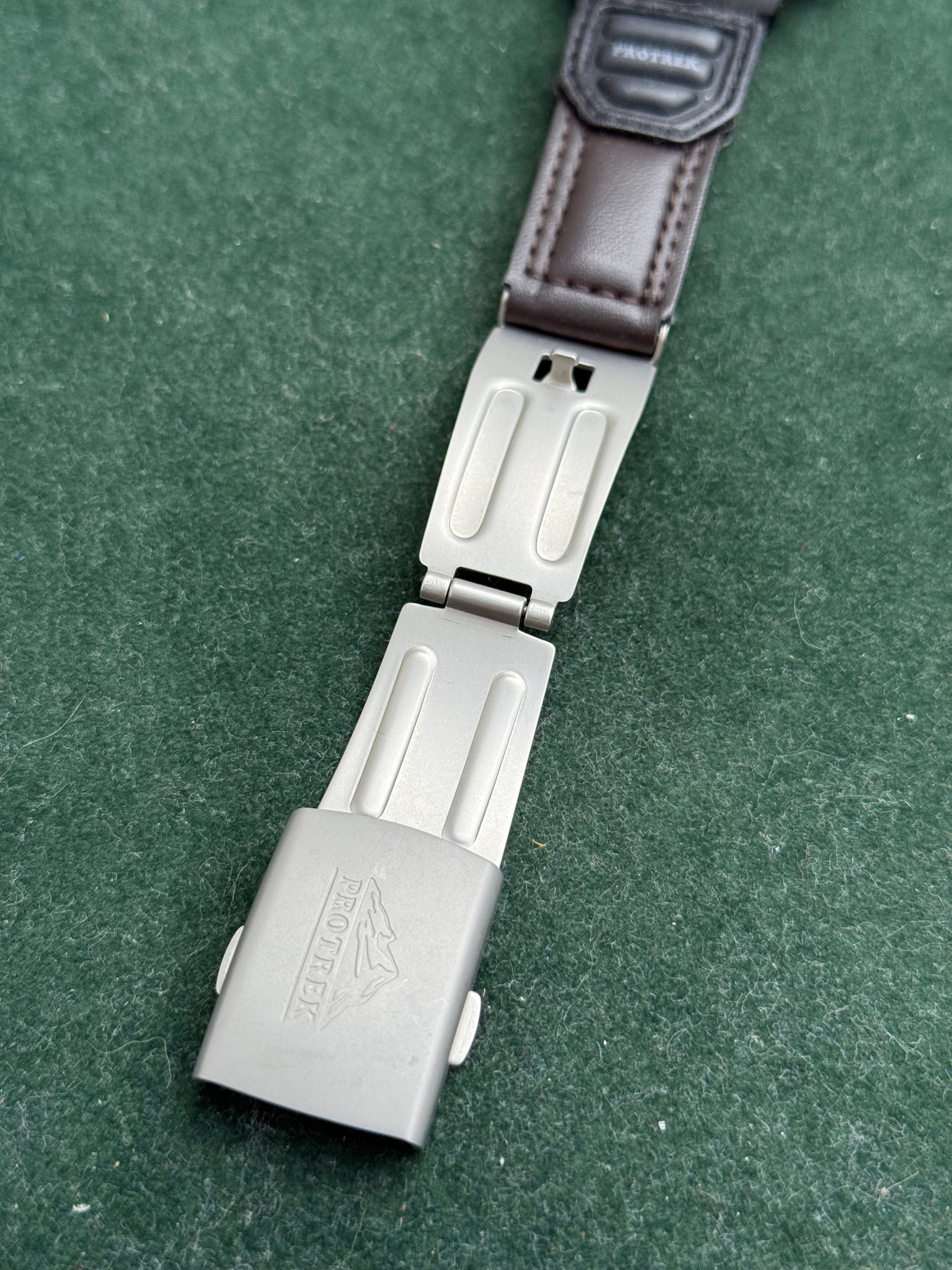 • Band: Original Pro Trek leather/nylon hybrid strap with signed clasp