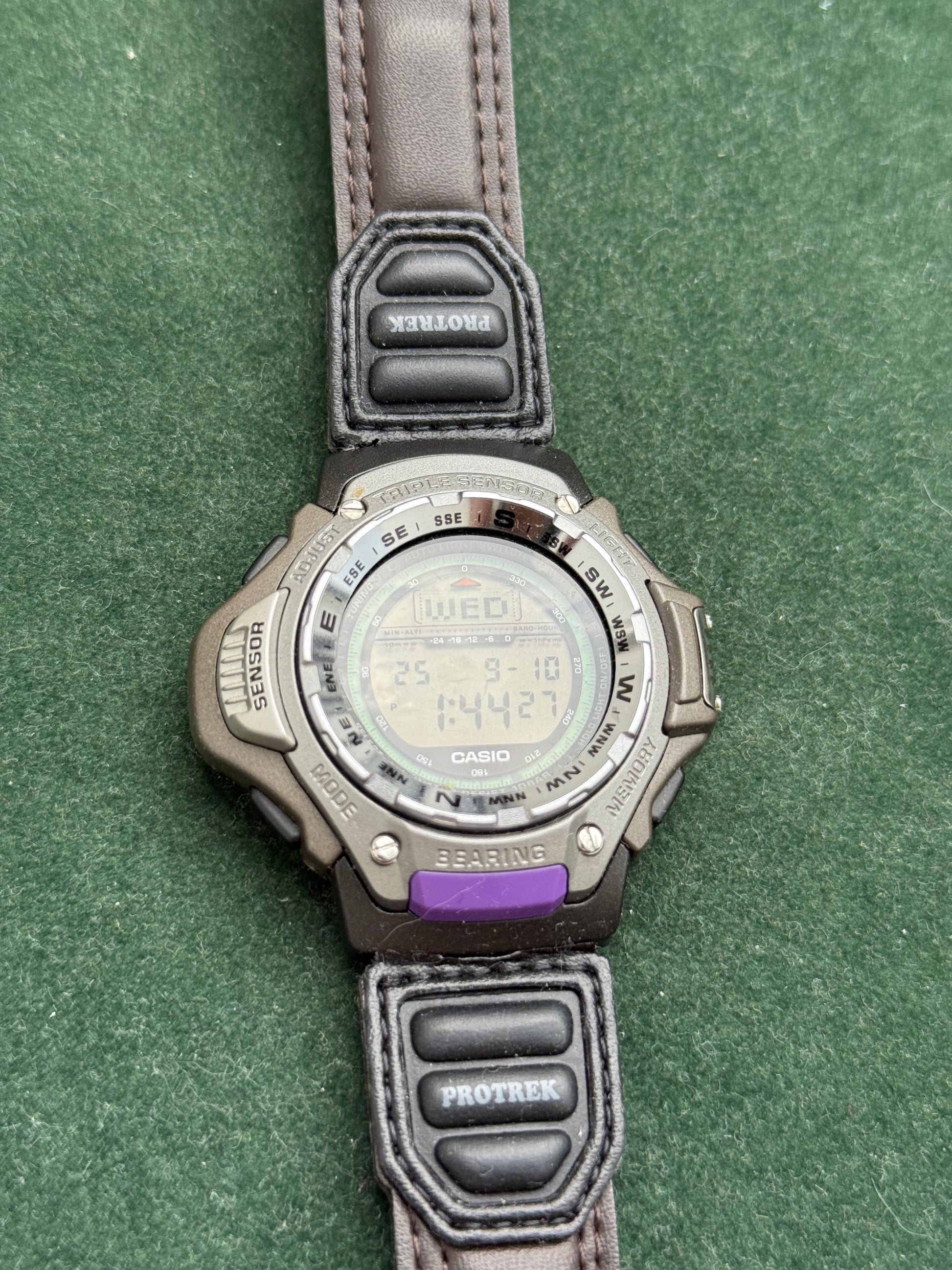 Equipped with Triple Sensor technology (compass, altimeter, barometer, thermometer), this model is a rugged tool watch for adventurers and a collectible piece for vintage Casio enthusiasts.