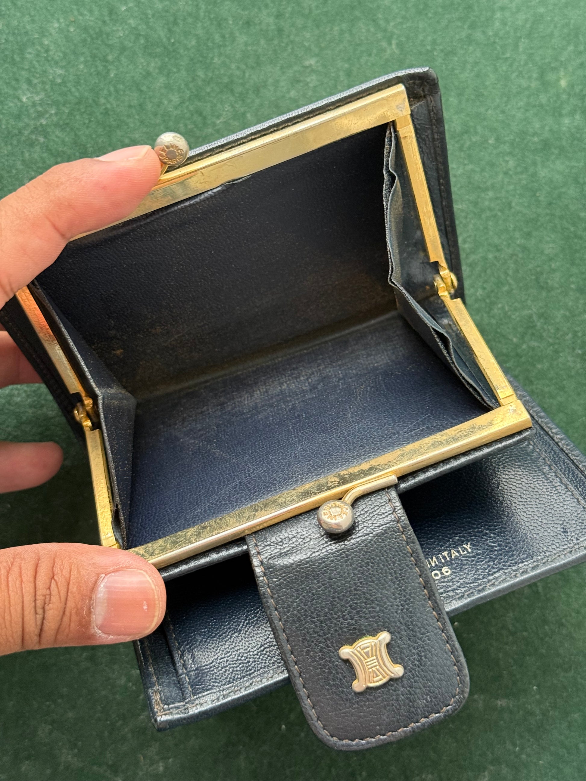 Classic navy/black leather finish with fold-over snap button closure, bill compartment, card slots, and a kiss-lock coin purse.