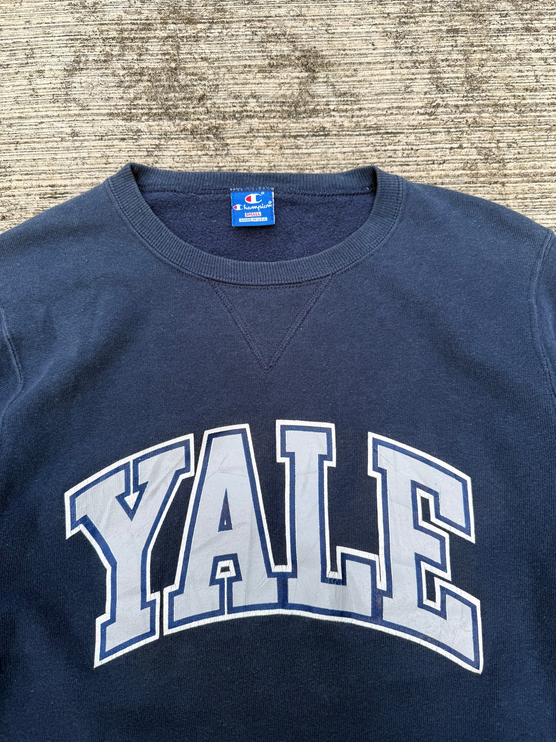 Authentic vintage 1990s Champion crewneck sweatshirt featuring bold YALE collegiate lettering across the chest. Classic navy blue with ribbed cuffs and hem, and a V-stitch detail under the collar for that timeless athletic look. Made in the USA with Champion’s iconic Reverse Weave quality, this piece captures the spirit of Ivy League heritage and vintage sportswear style.