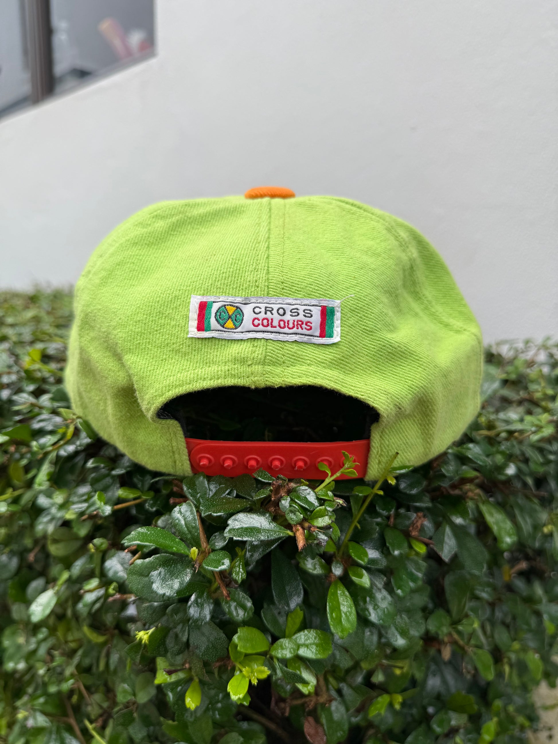 Original vintage Cross Colours snapback cap, featuring bold embroidery with “4 The Sisterhood” logo on lime green crown and vibrant orange brim. Backside carries the iconic Cross Colours woven tag, paired with a red snapback closure stamped Made in USA.