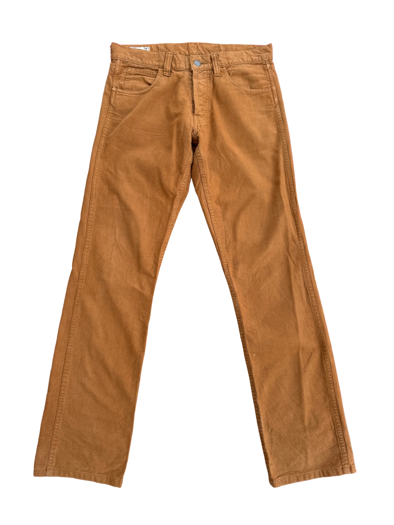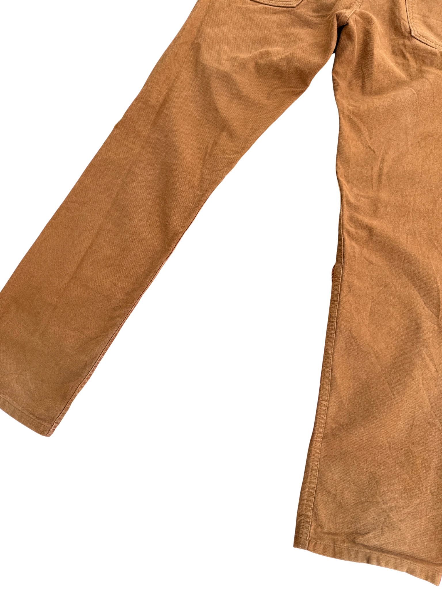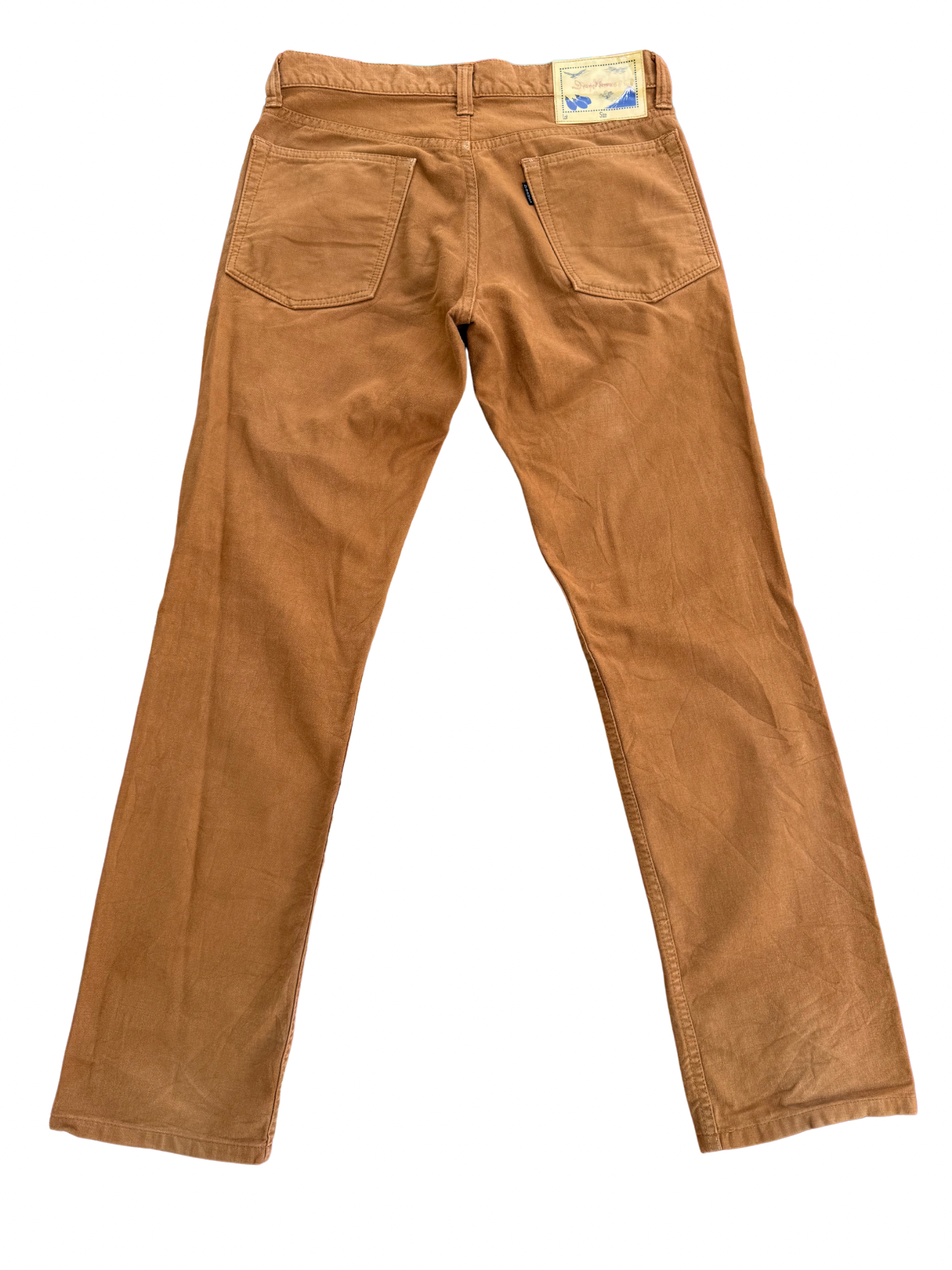 Authentic Dry Bones Japan slim work pants in caramel brown, made from 100% cotton twill. Features full button fly closure with custom “Dry Bones Japan” hardware, high-quality Japanese construction, and minimal back-pocket branding.