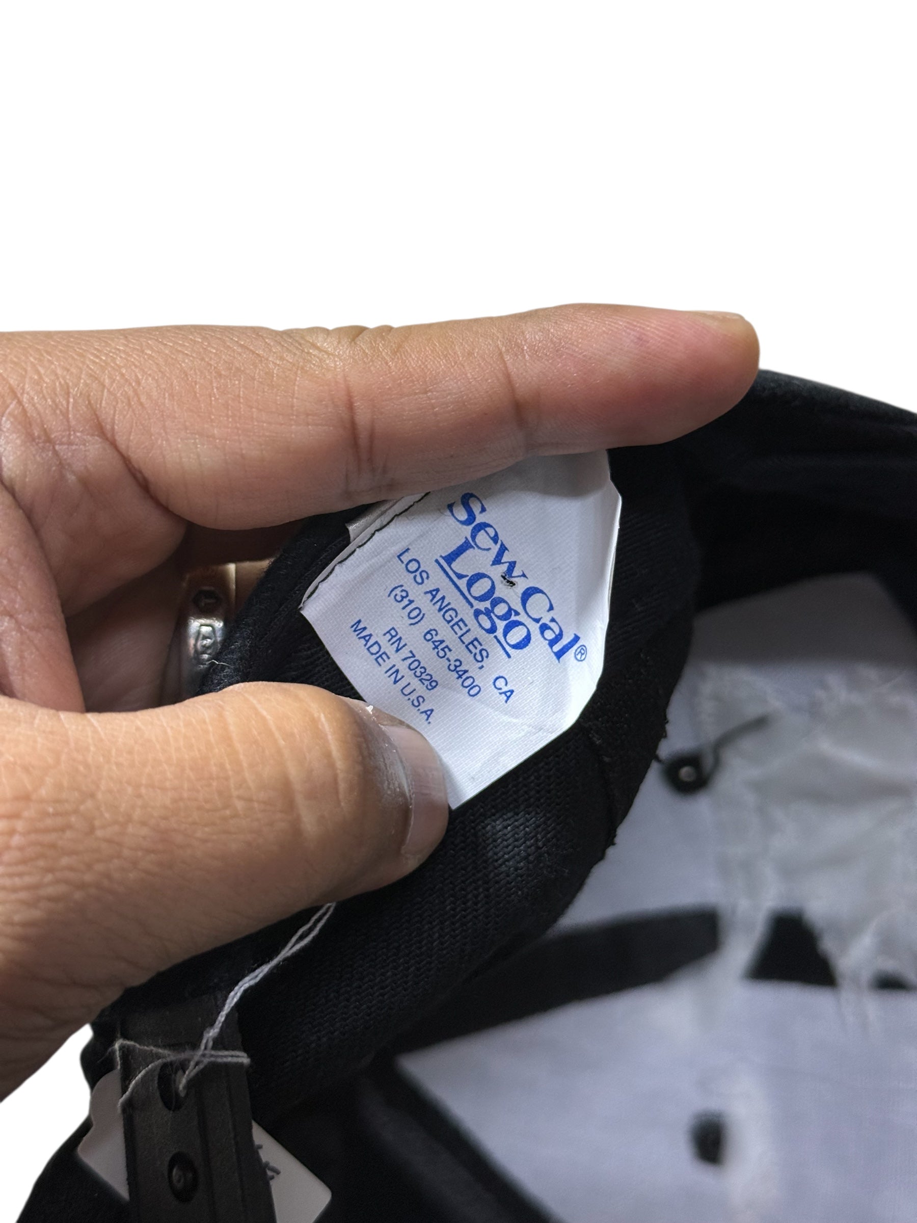 Vintage snapback cap featuring embroidered “Eaters of the Dead” text at the back. Black structured 6-panel cap with flat brim and adjustable snapback closure. Made in USA by Sew Cal Logo. Novel / pop-culture themed cap with strong 90s aesthetic.