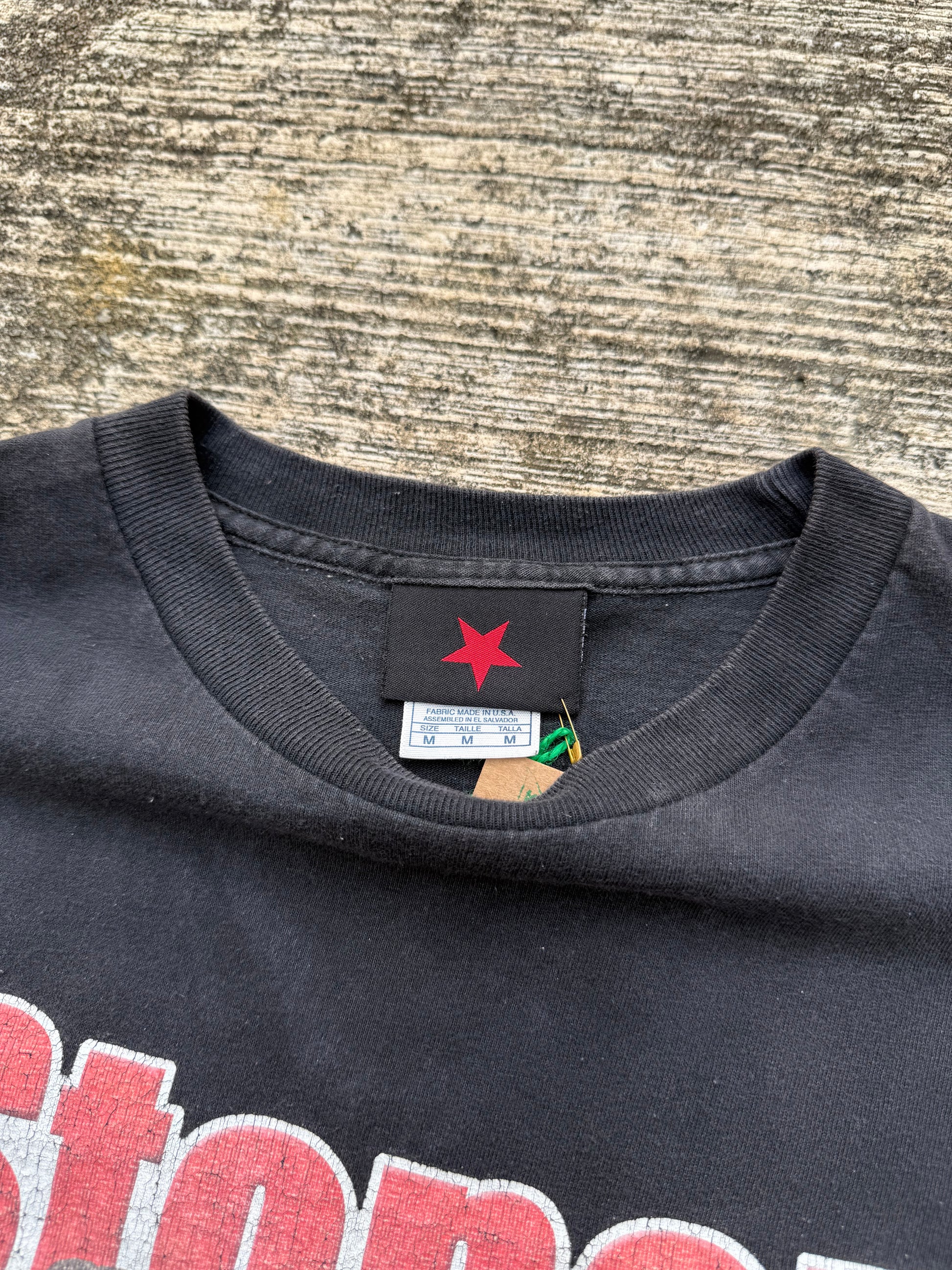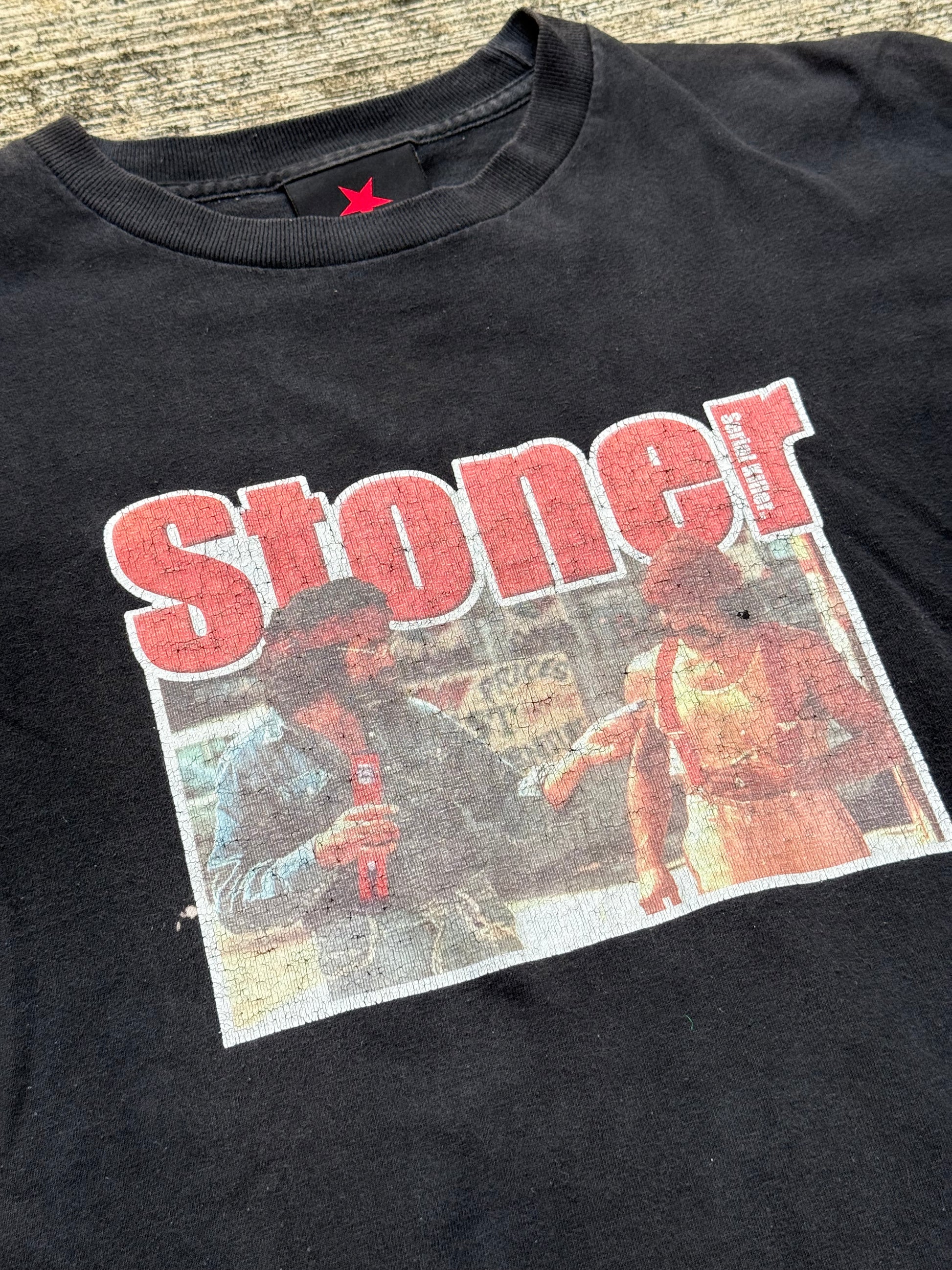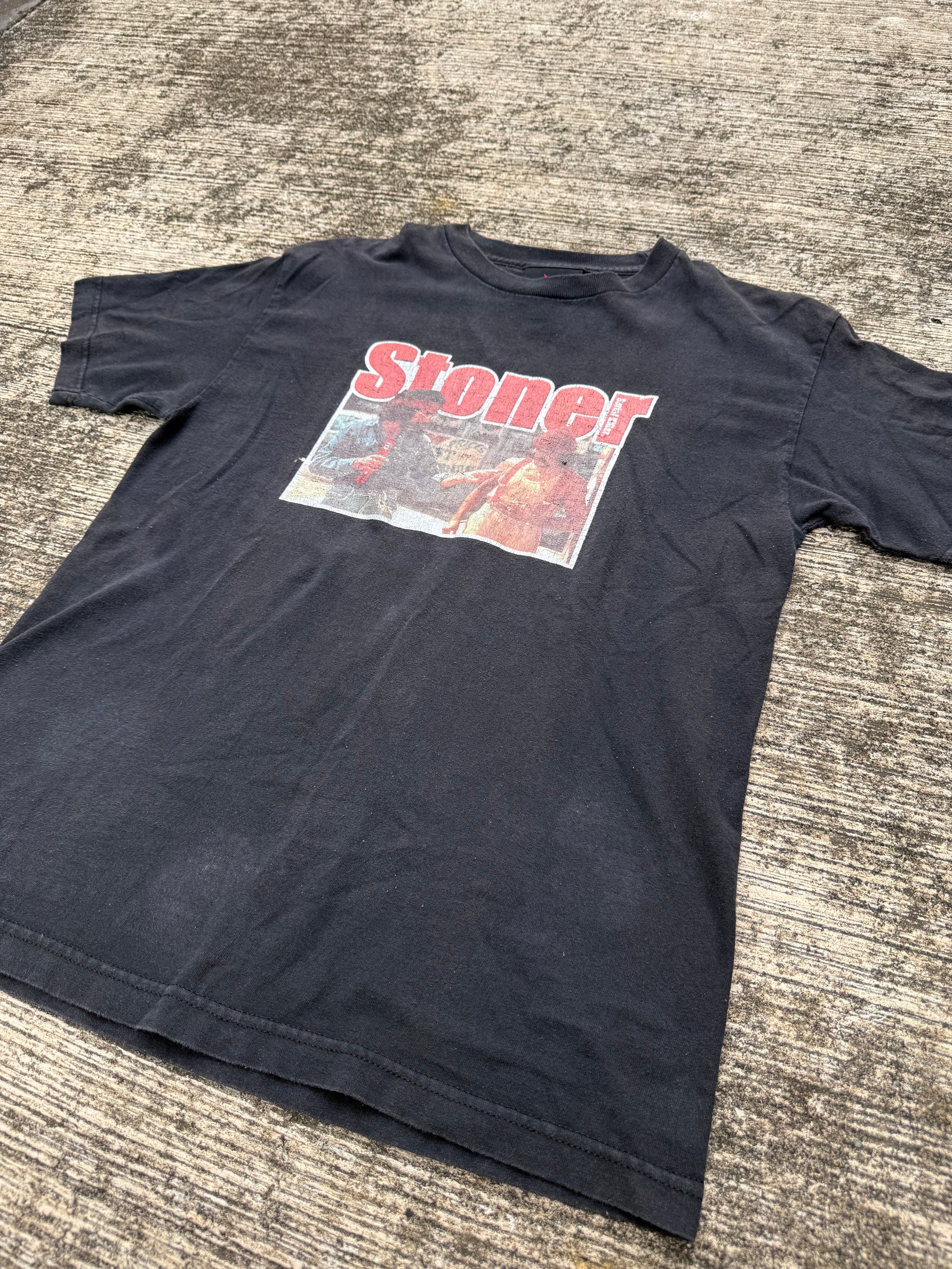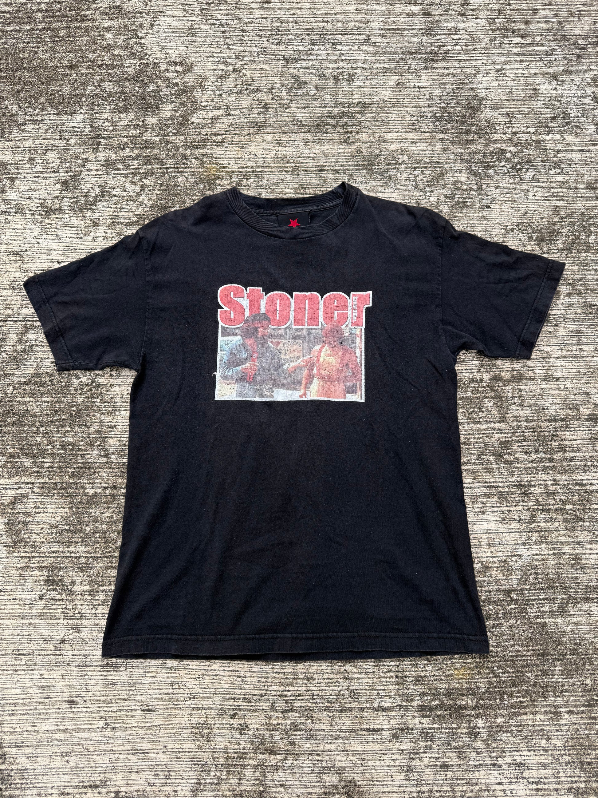 Original Serial Killer “Stoner” tee featuring parody-style graphic inspired by classic Cheech & Chong stoner culture. Black cotton shirt with bold red “Stoner” text and photo print. Cult streetwear and pop culture piece from the early 2000s era.