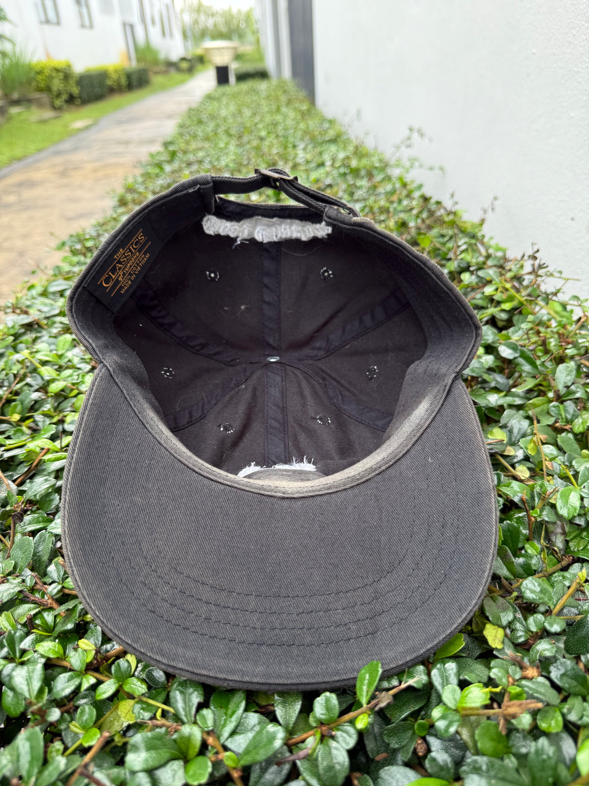 Authentic vintage Good Charlotte cap in distressed black cotton with naturally faded wear, adding character and true Y2K nostalgia. Features white embroidered GC crest with laurel wreath on the front and “Good Charlotte” gothic script across the back. Adjustable strap for a custom fit.