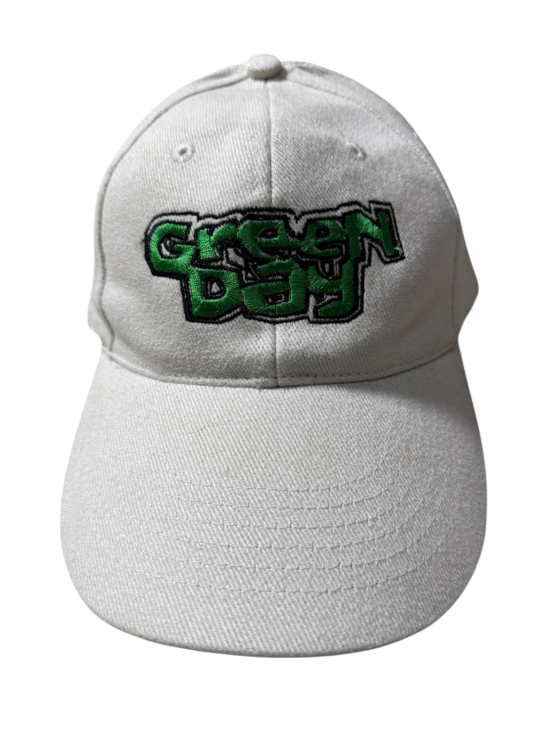 Vintage Green Day band cap featuring embroidered logo on the front. White cotton cap with adjustable strapback closure. Clean 90s alternative punk rock merchandise.