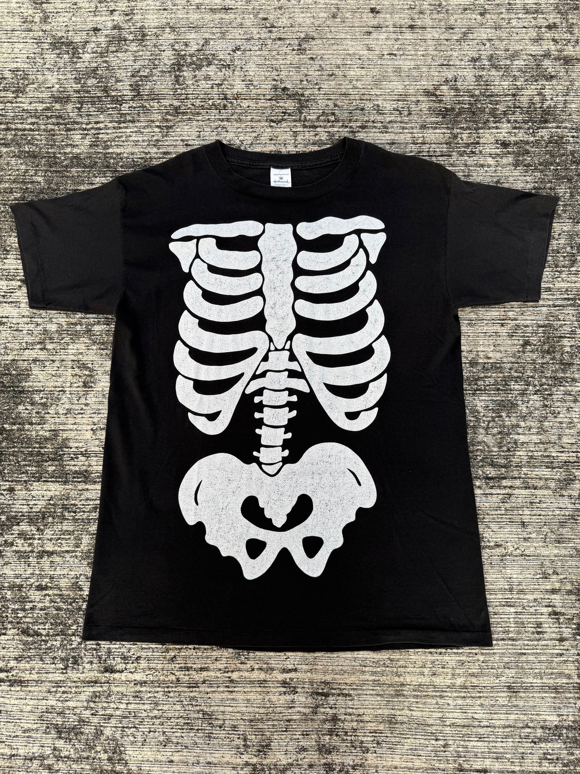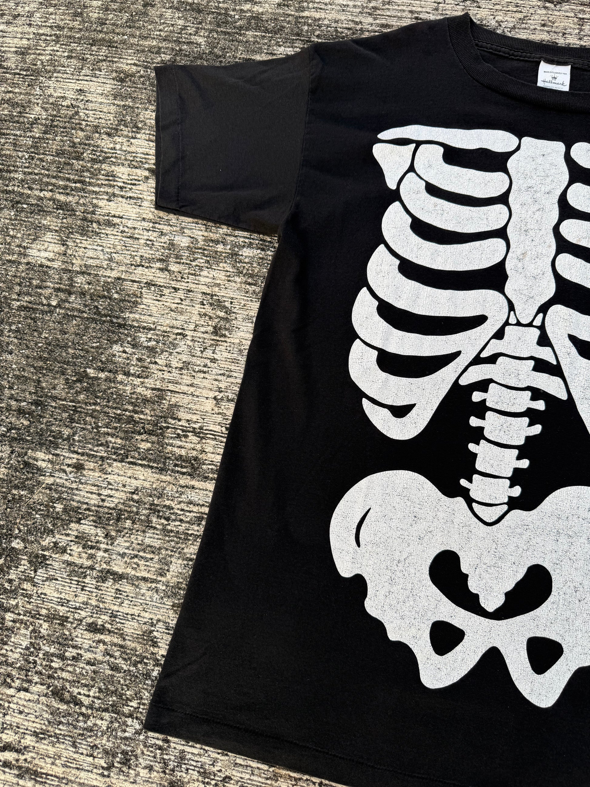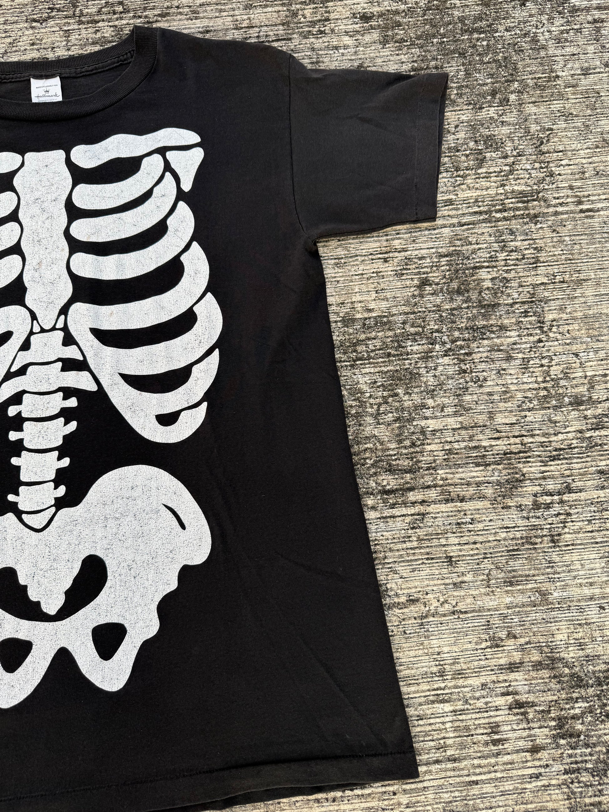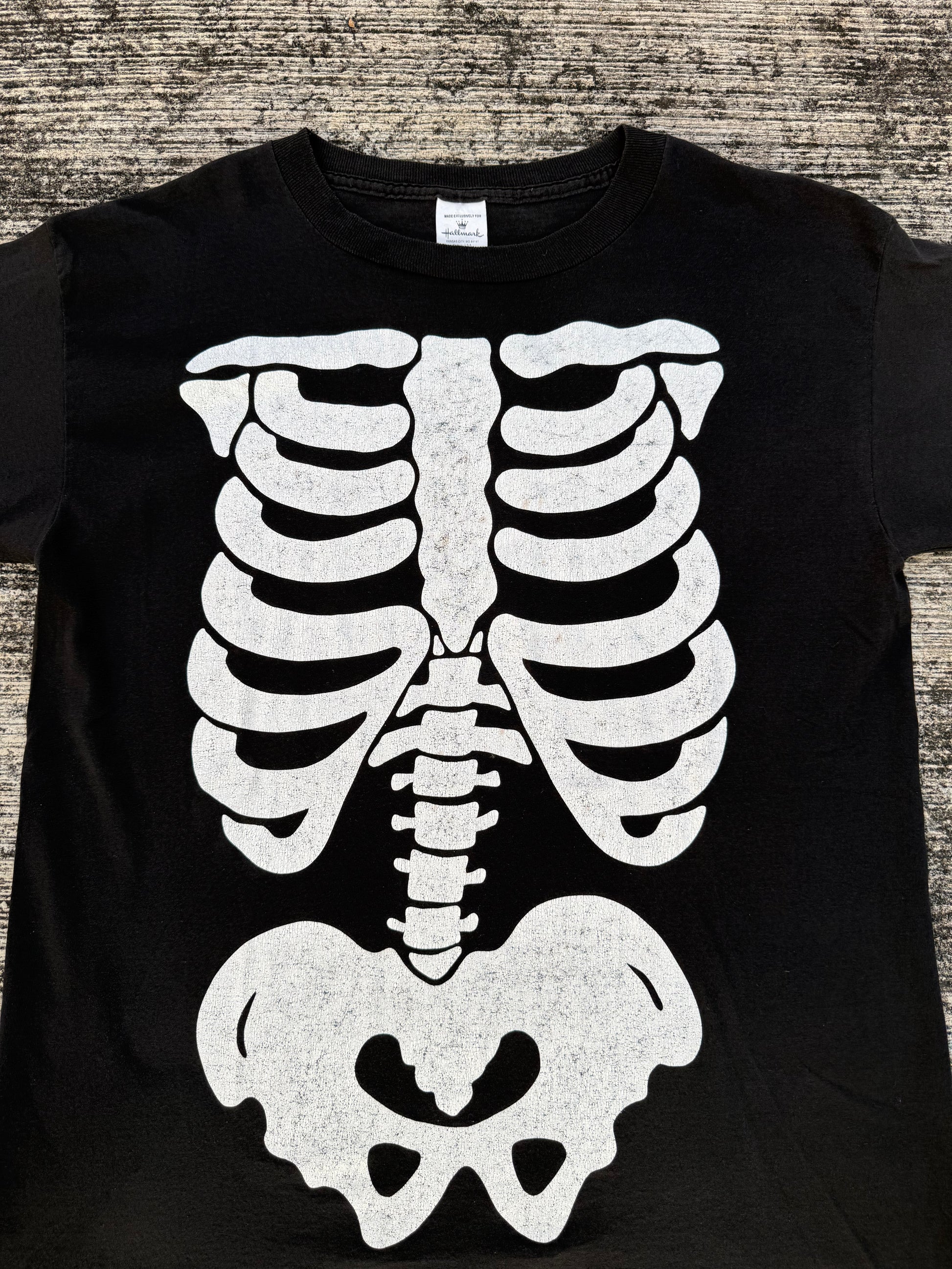 Rare vintage Hallmark skeleton graphic t-shirt from the 1990s, featuring bold full-front ribcage and pelvis bone print in white against a solid black body. Classic Halloween collectible tee with true vintage single-stitch construction and soft cotton/poly blend fabric. Originally made exclusively for Hallmark, USA.