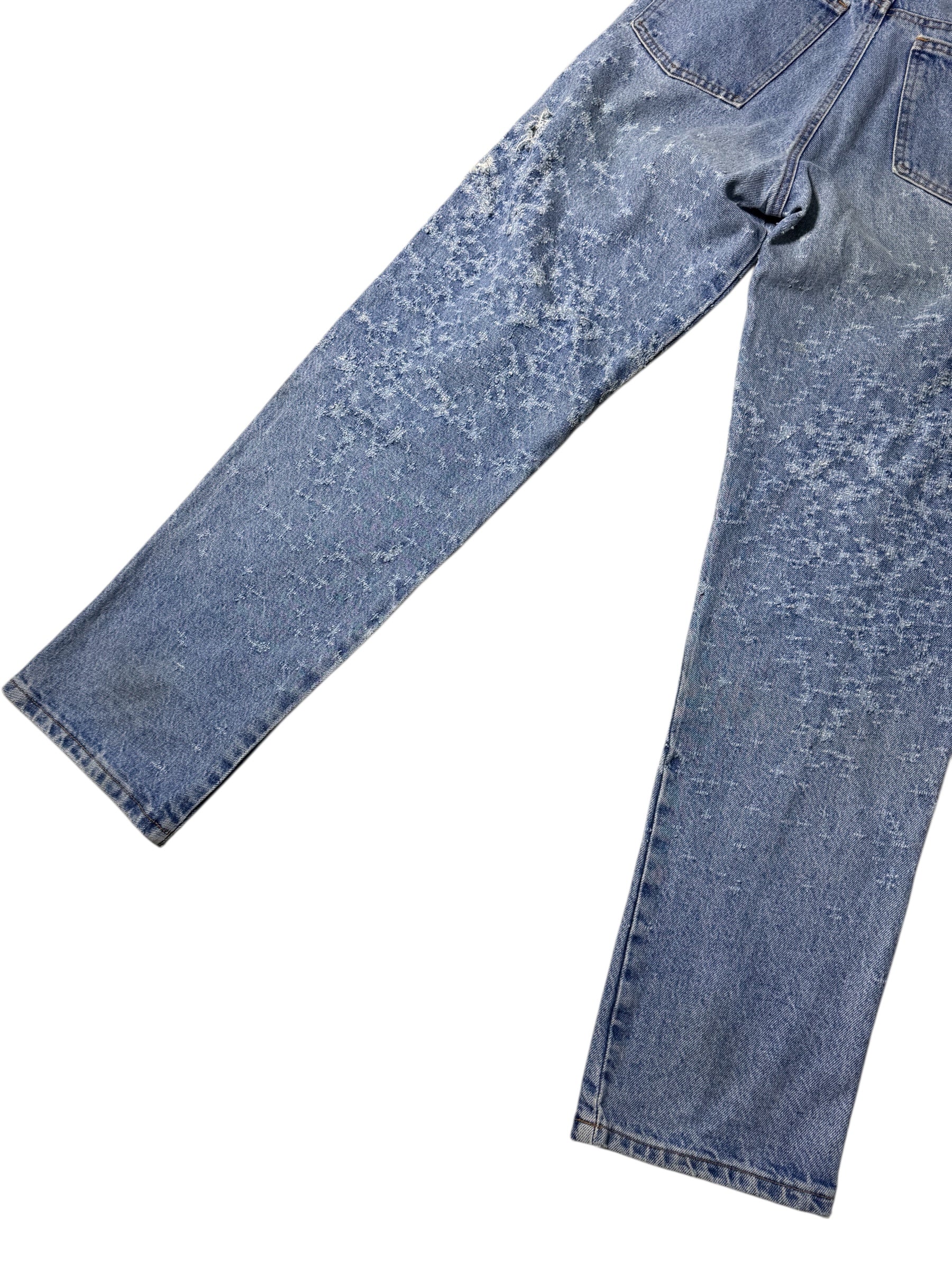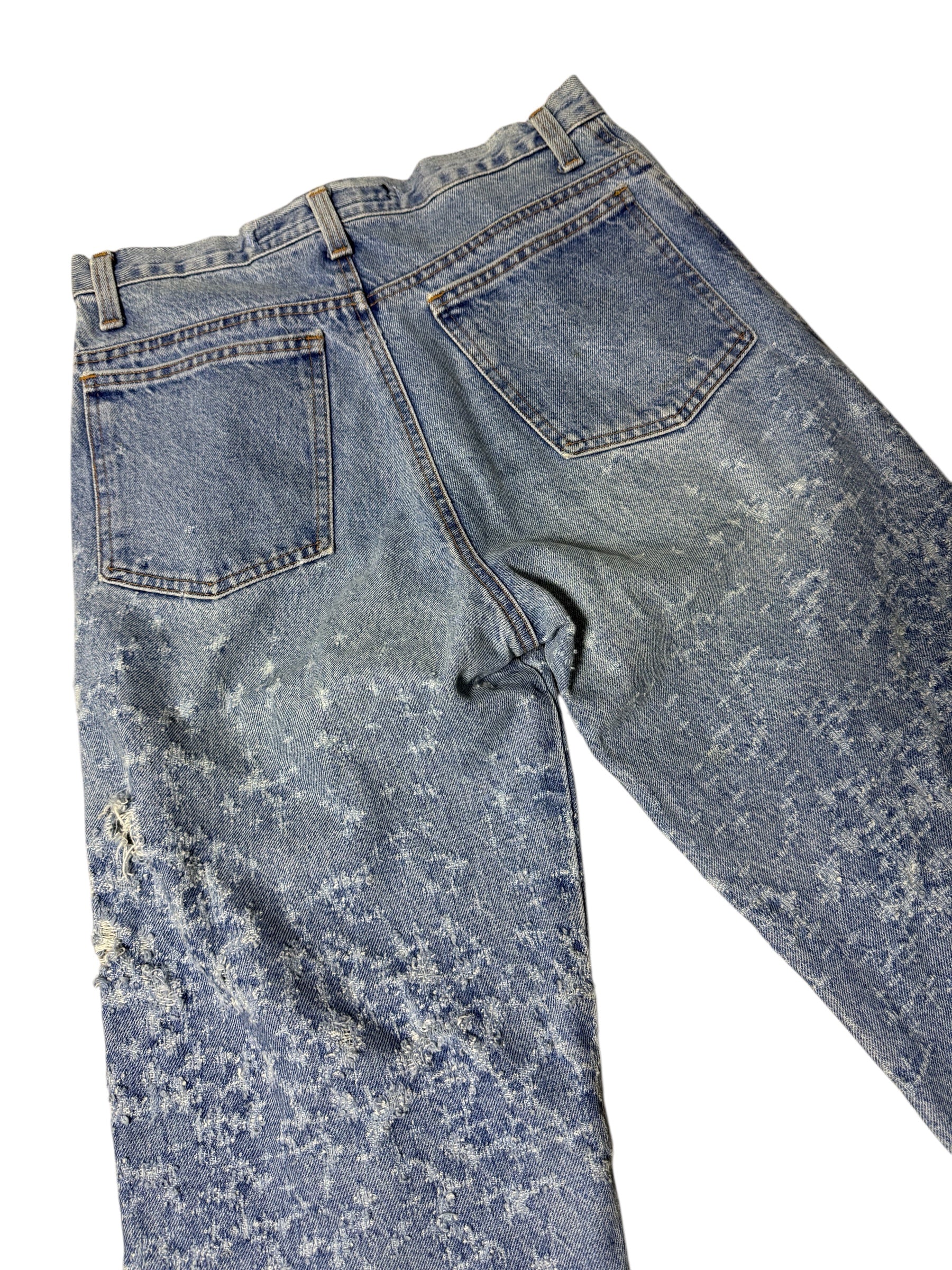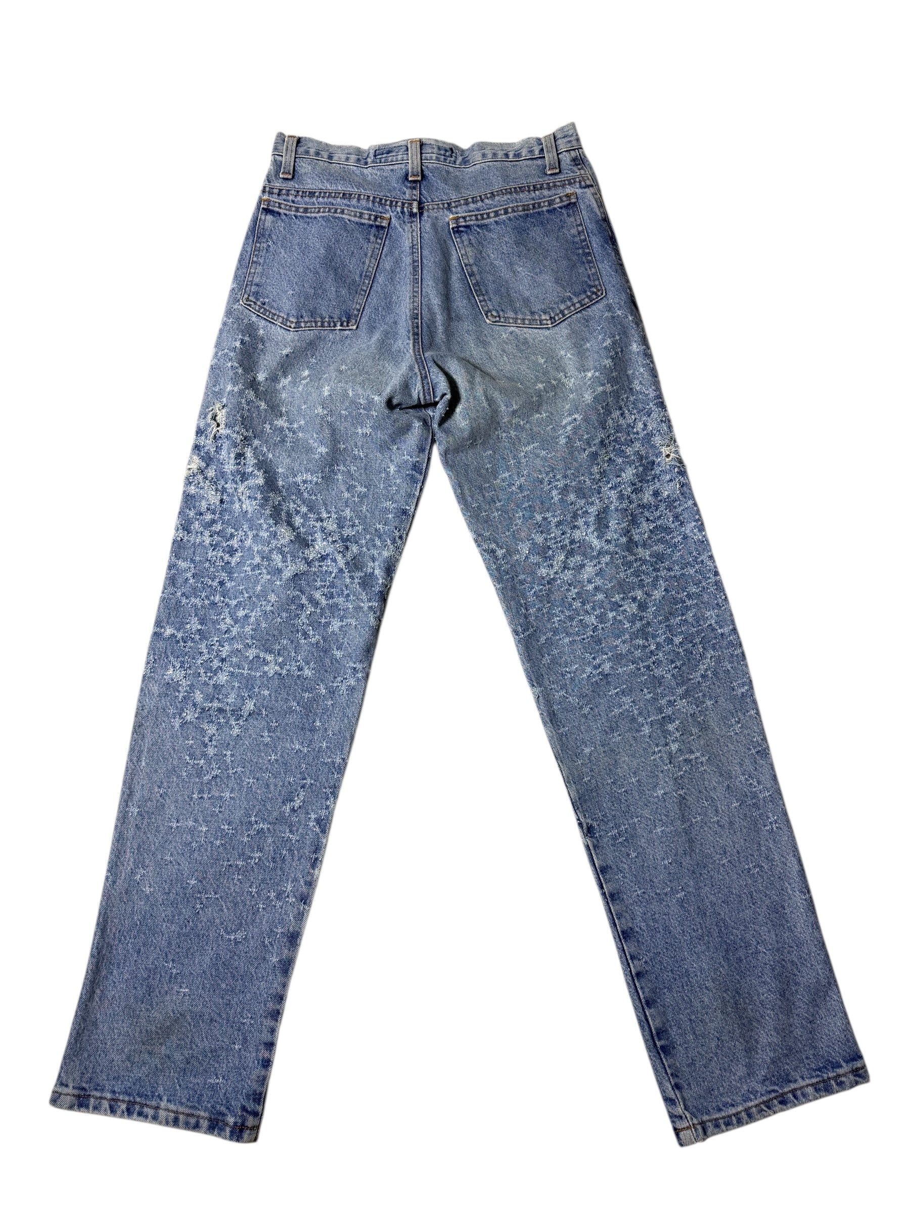 Late 80s–Early 90s Jensen Smith denim jeans made in USA with a unique all-over “snowflake” distress pattern. Straight leg silhouette, mid-rise, and sturdy 100% cotton denim.