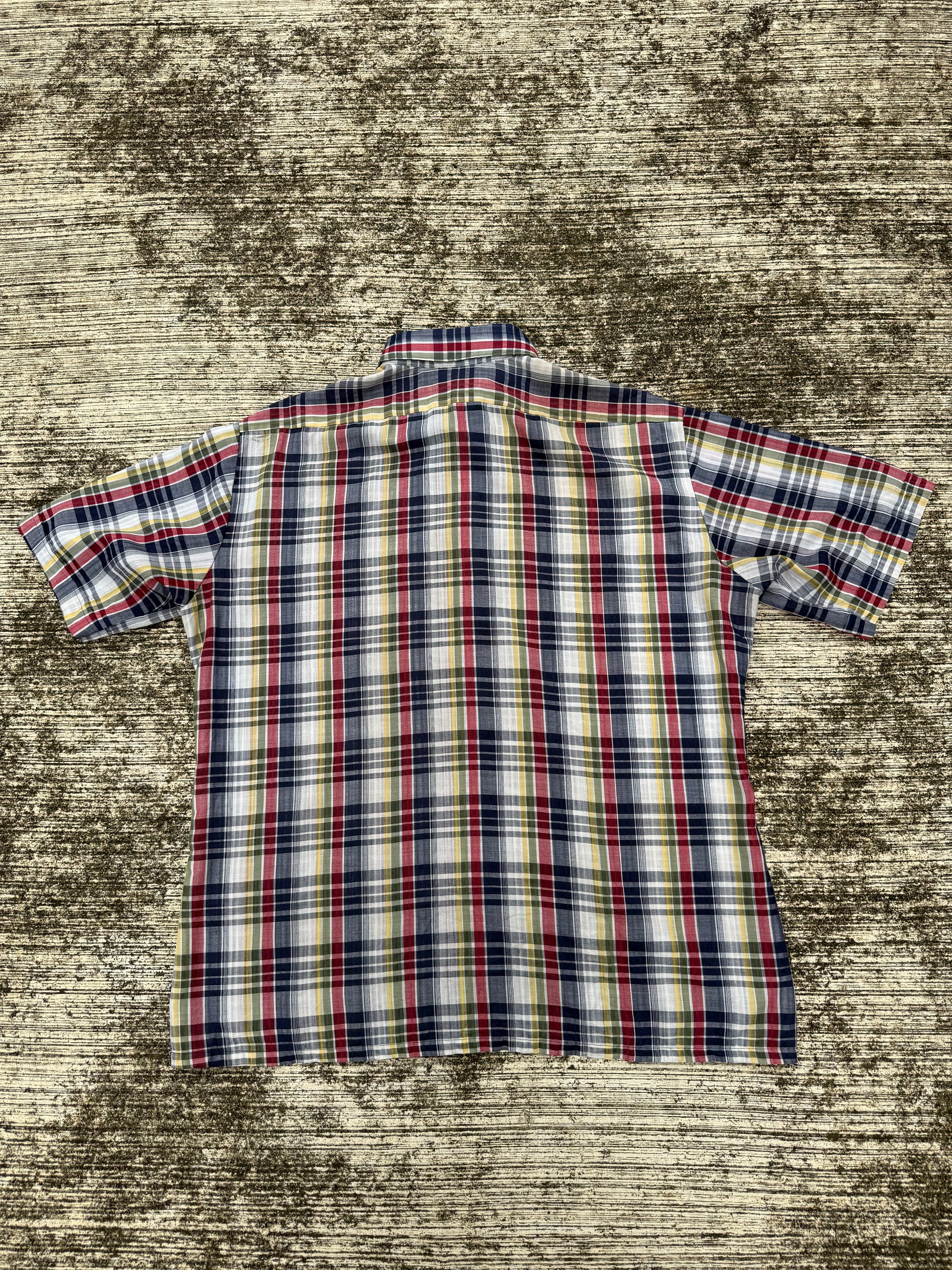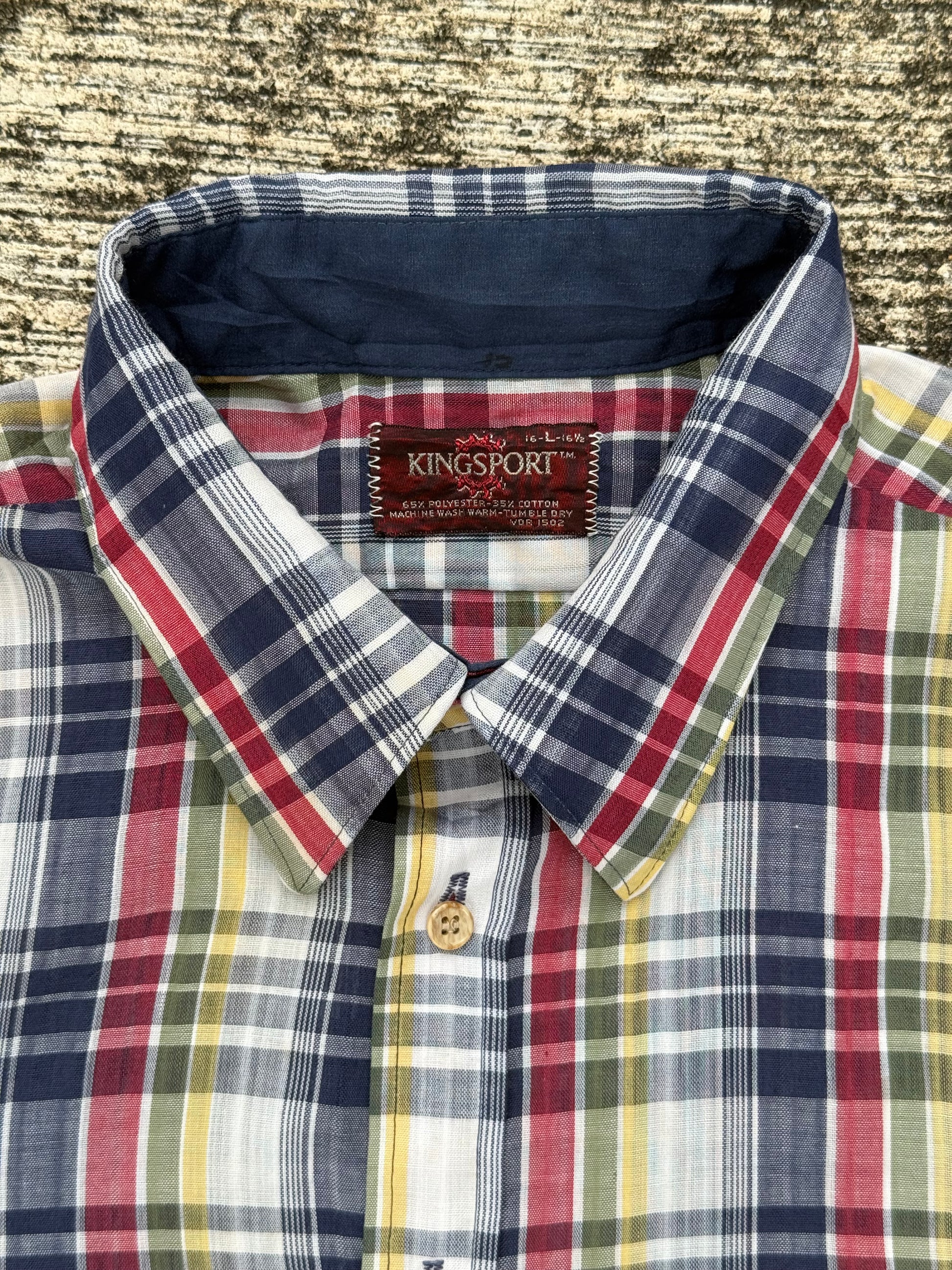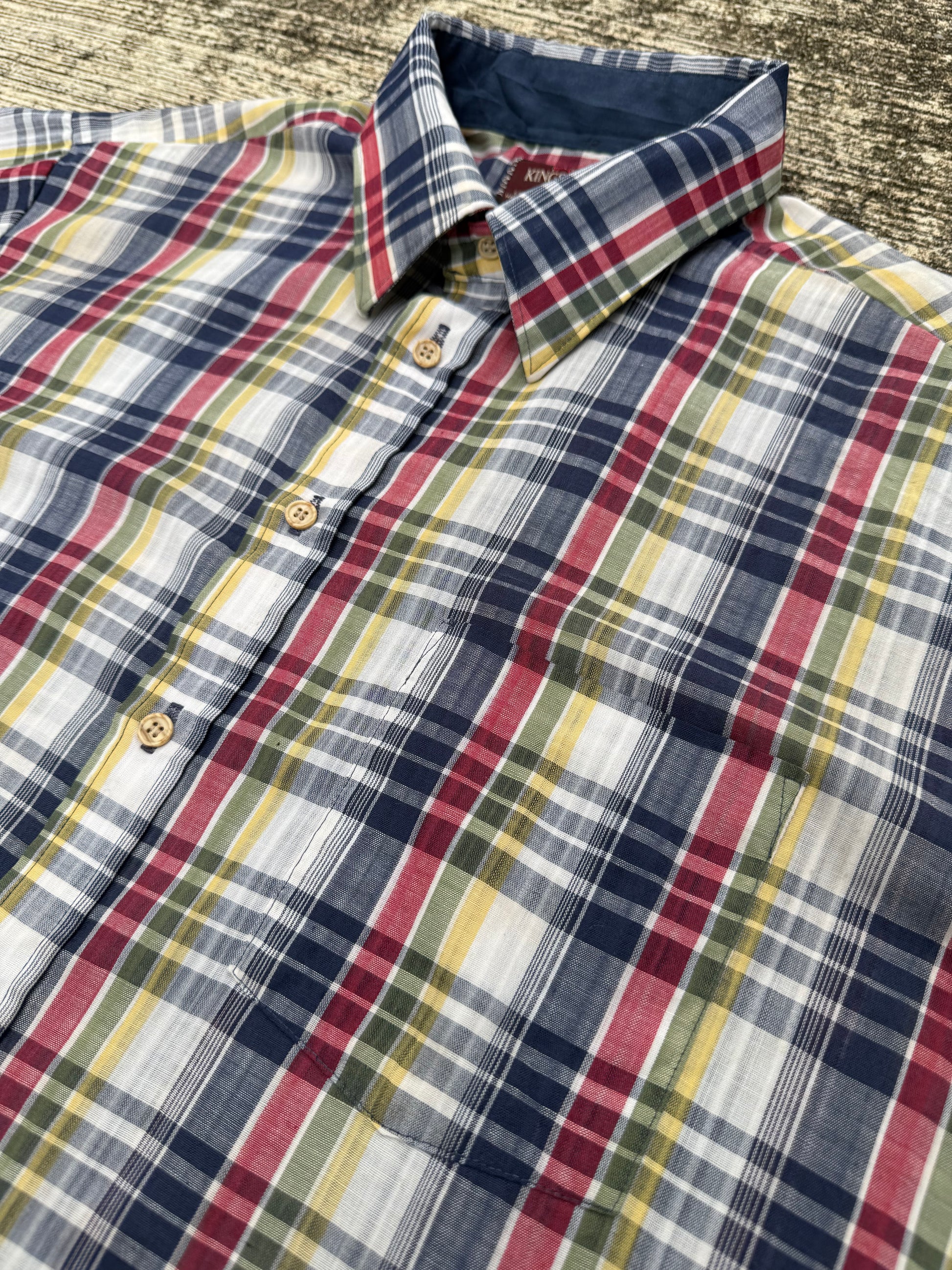 Vintage Kingsport short sleeve shirt with multicolor plaid (red, navy, yellow, green). Lightweight poly-cotton blend, button-down front, single chest pocket. Easy casual style, perfect for summer wear.