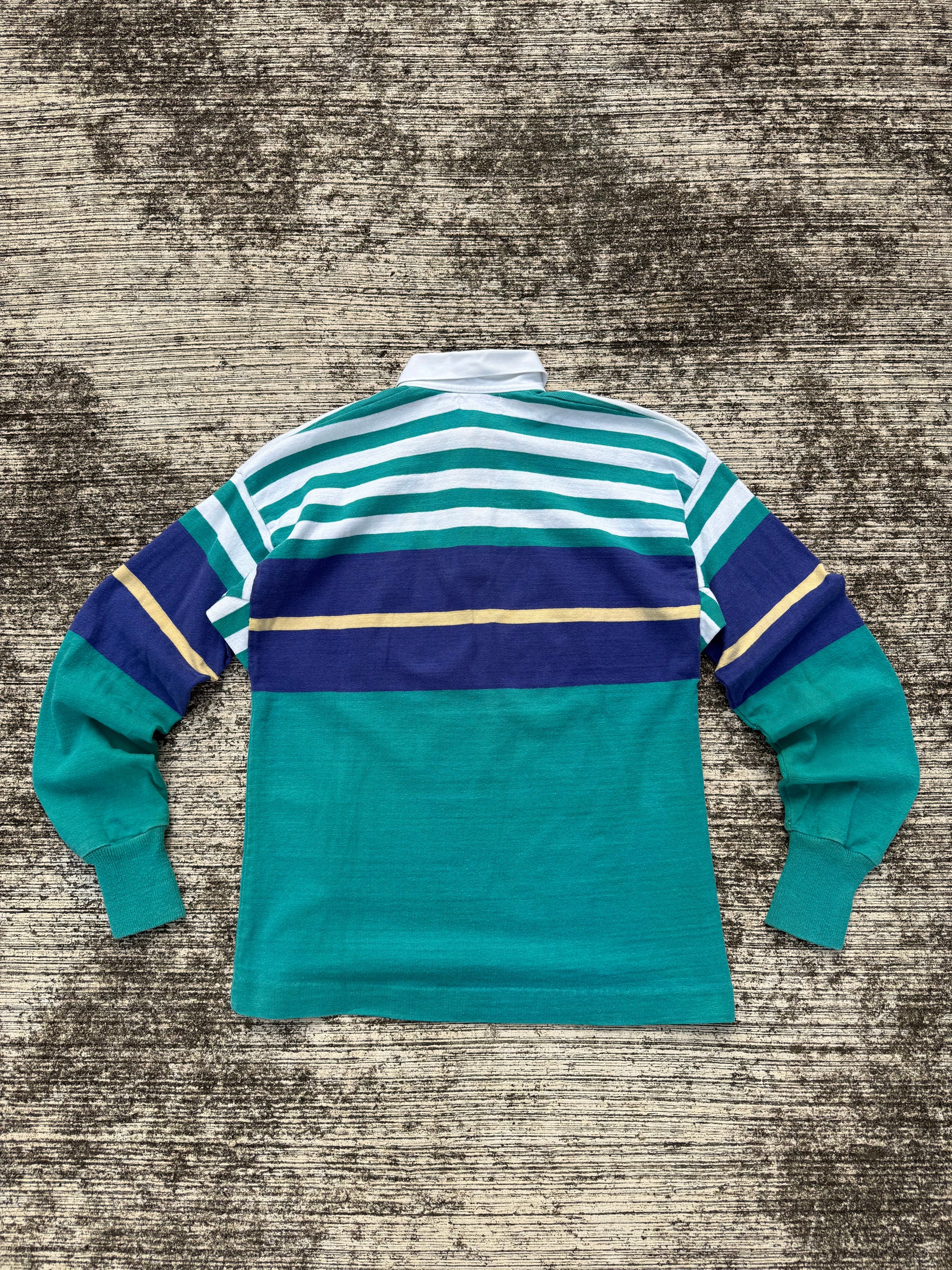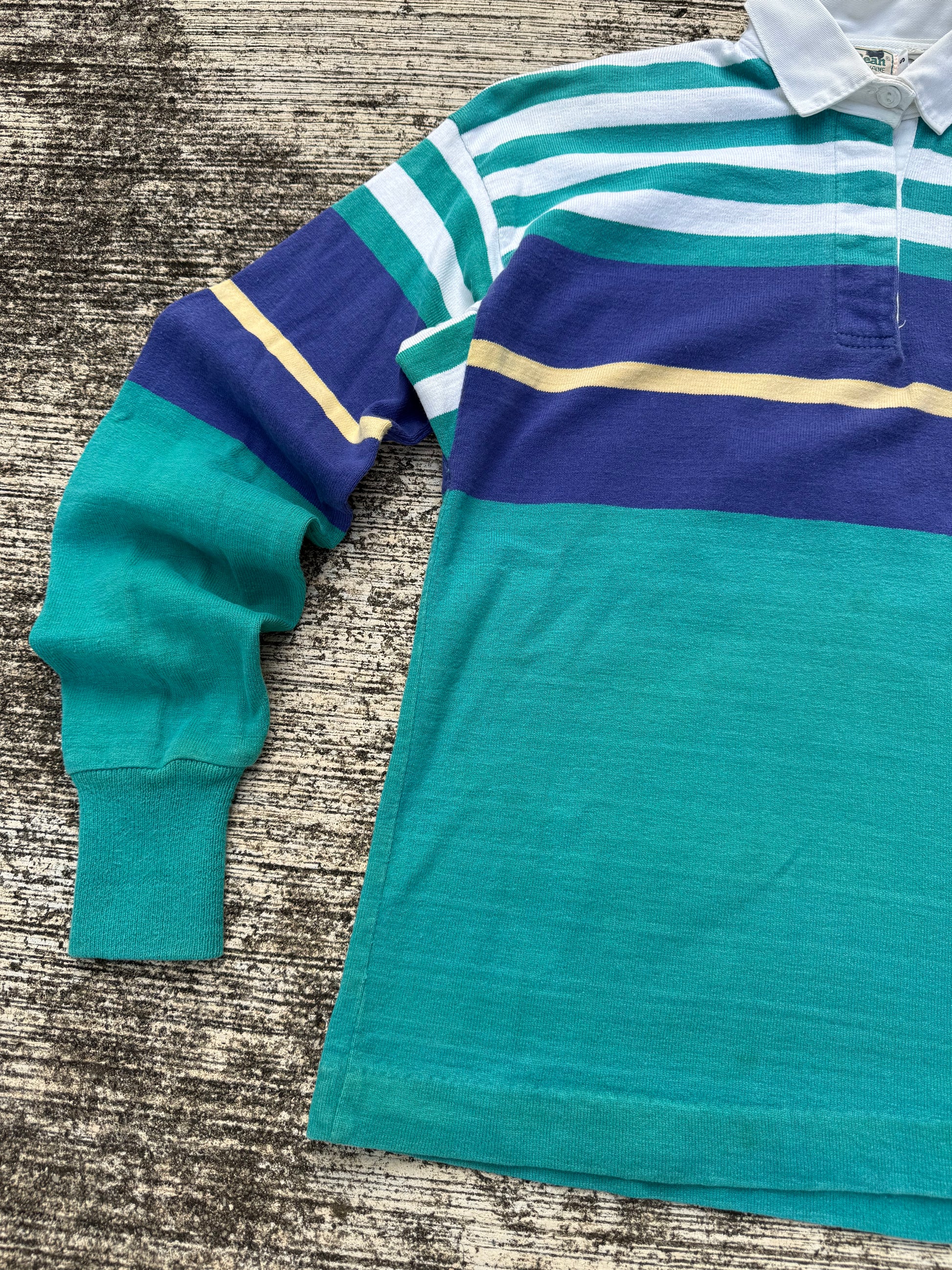 Vintage L.L. Bean long sleeve rugby shirt with teal, navy, and white stripe pattern plus yellow accent line. Classic white twill collar and heavyweight cotton knit.