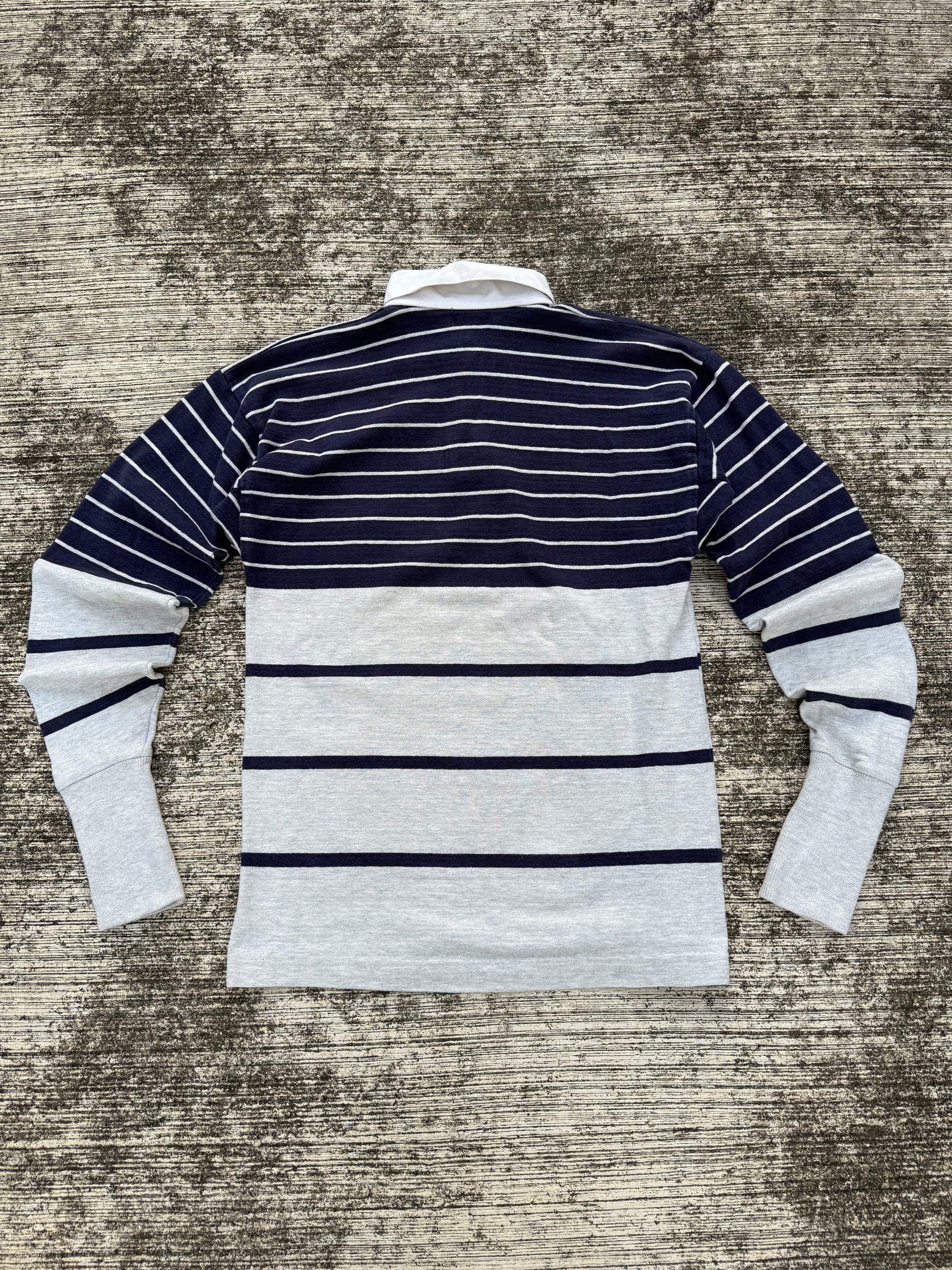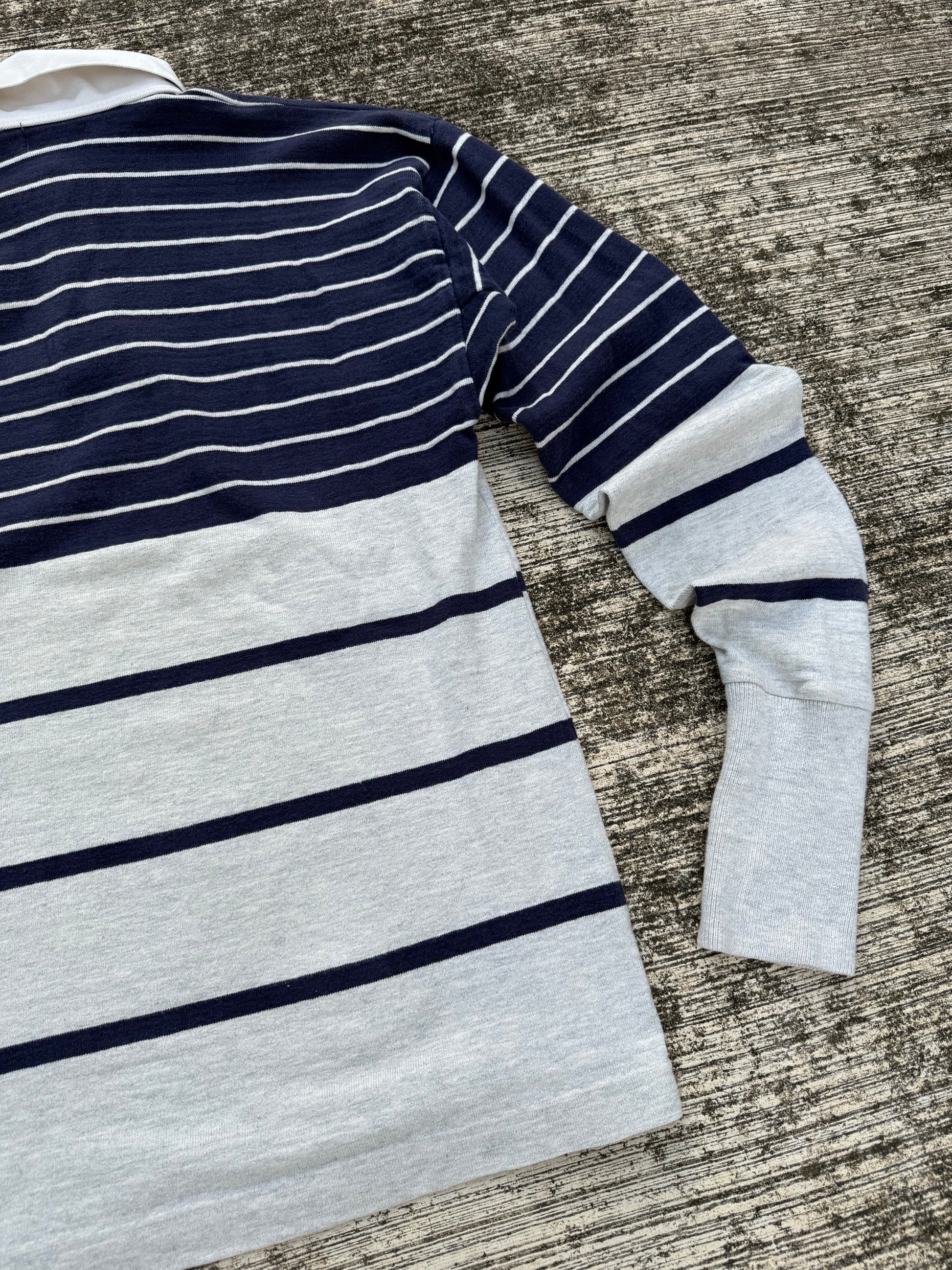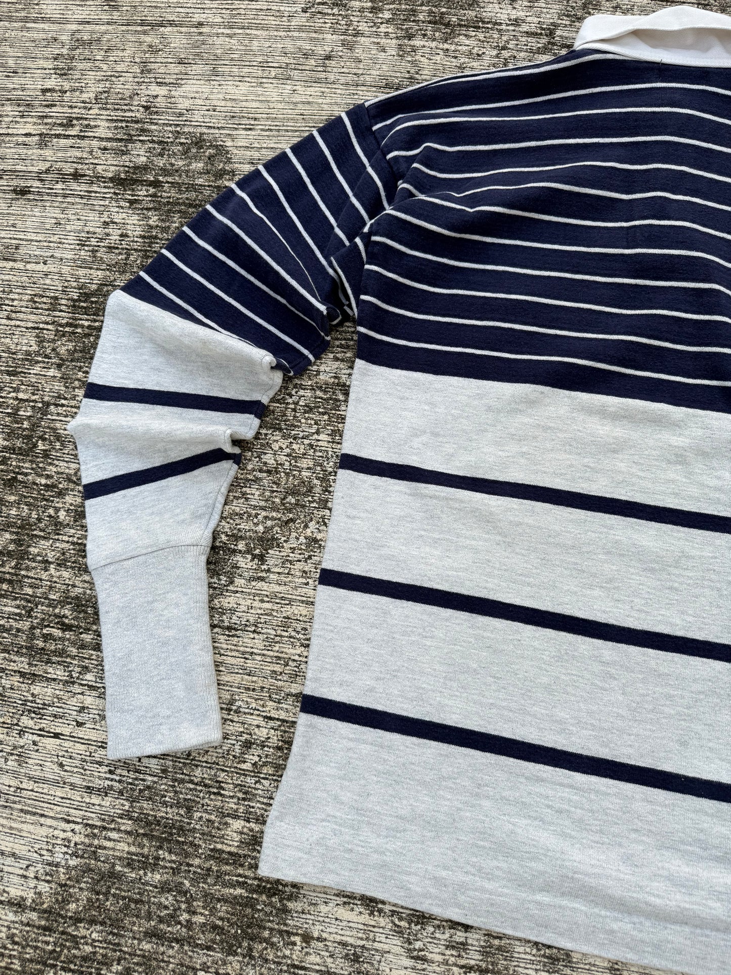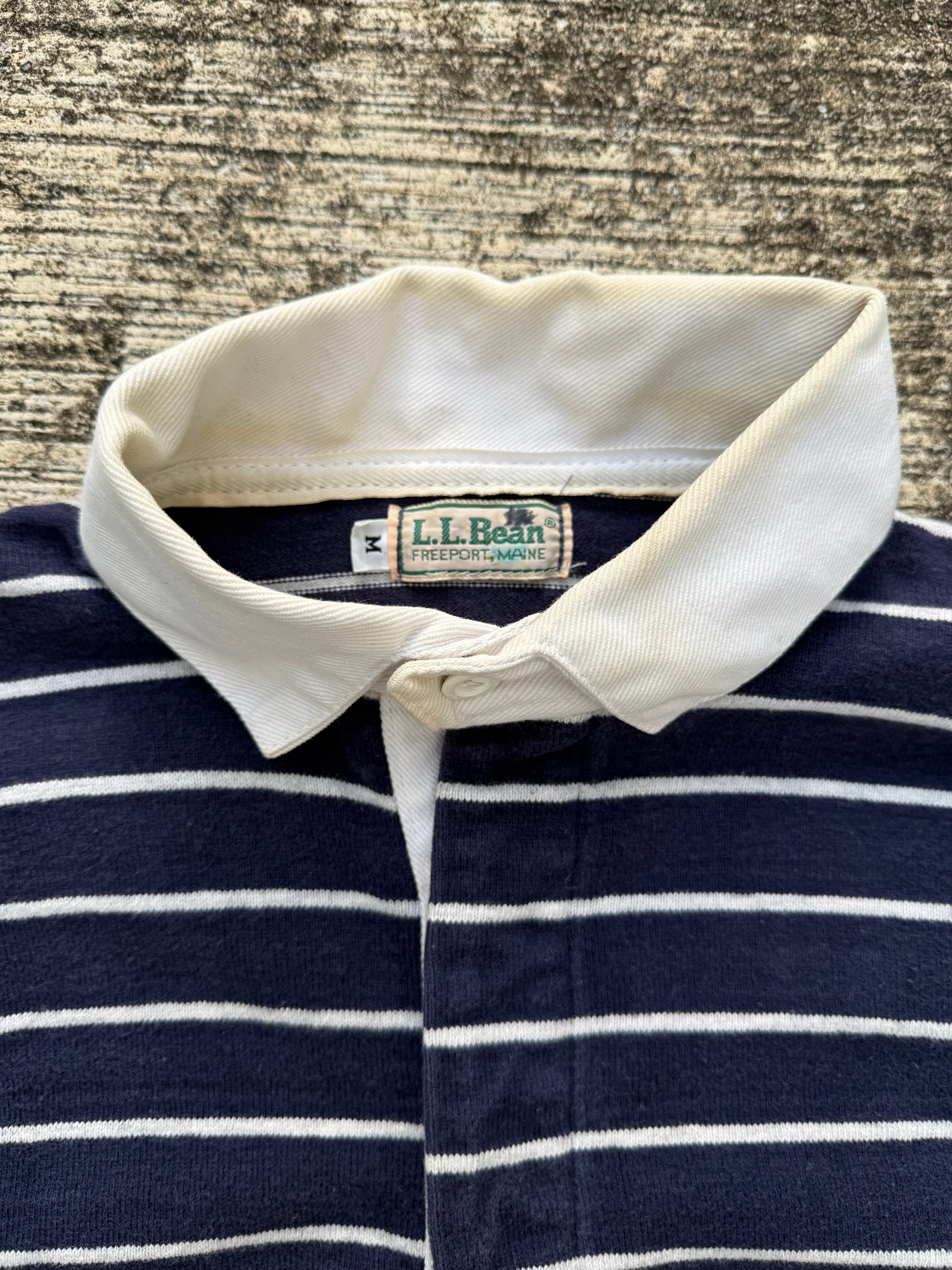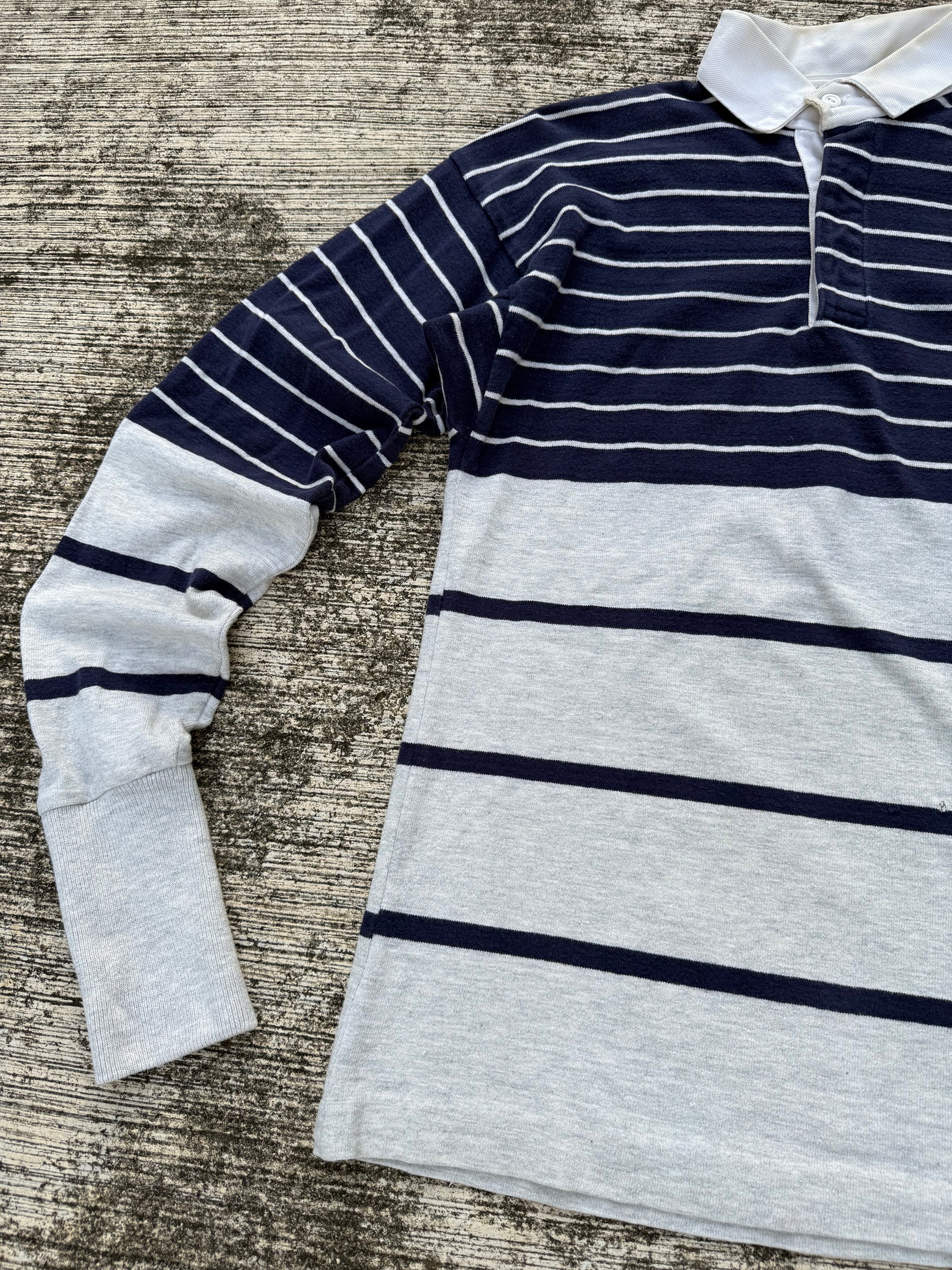Vintage L.L. Bean long sleeve rugby shirt with navy and grey horizontal stripe design. White twill collar and soft midweight cotton knit.