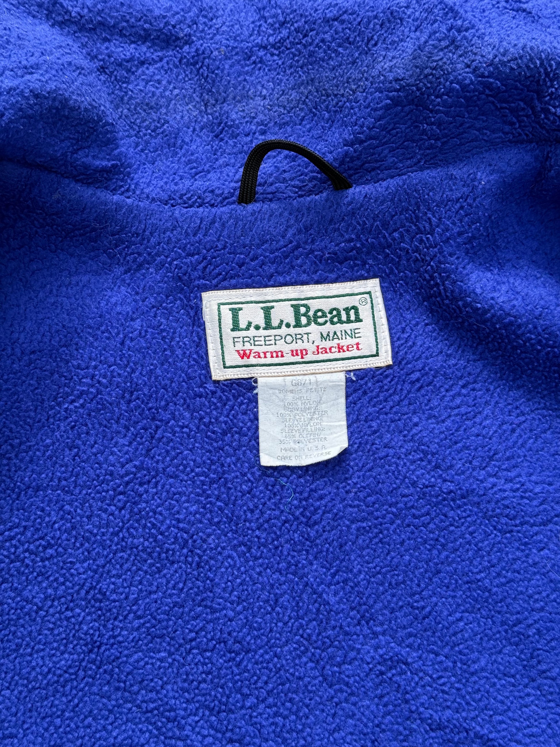 Rare vintage L.L.Bean Warm-Up Jacket, made in USA. Classic late 80s–90s outdoor style featuring teal nylon shell with contrast navy rib cuffs and hem, fully lined with soft royal blue fleece for warmth. Zip front closure, two zippered hand pockets, and embroidered L.L.Bean Freeport, Maine label.