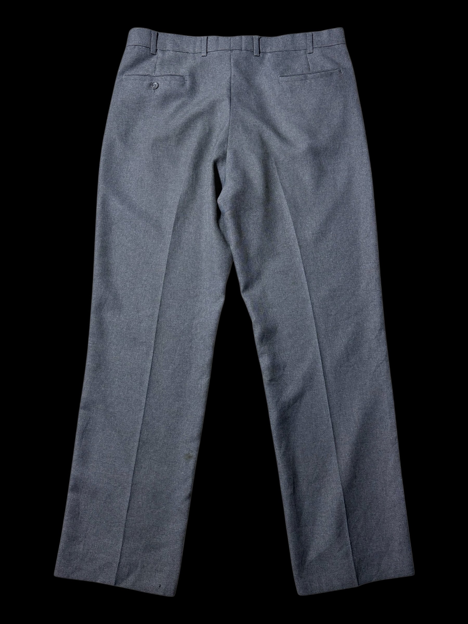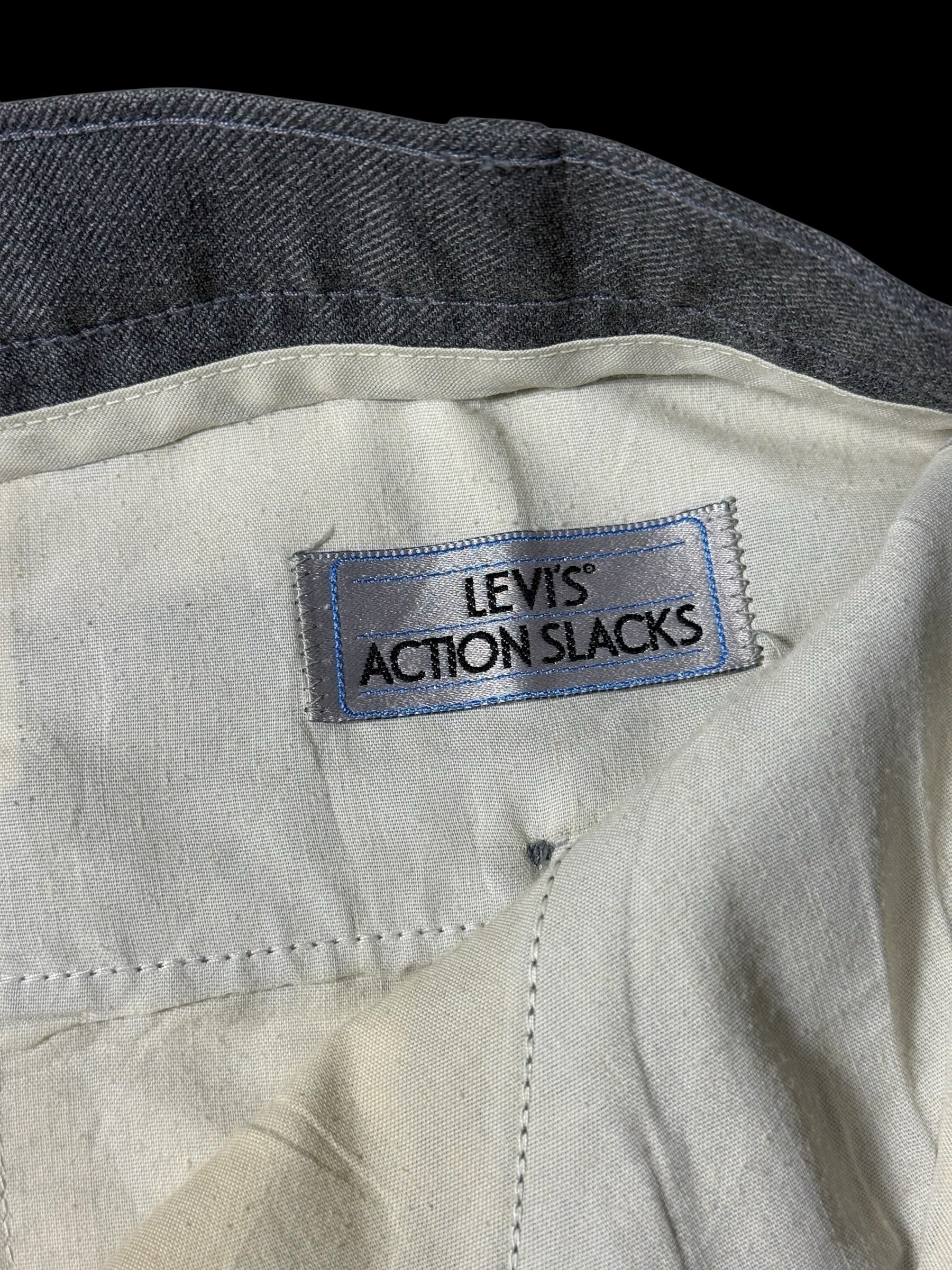 Authentic vintage Levi’s Action Slacks dress trousers in a classic grey tone. Features a clean tailored silhouette with a mid-to-high rise, zip fly closure, belt loops, and rear buttoned pockets. Minimalist design with sharp lines, reflecting the timeless appeal of Levi’s vintage dress slacks.