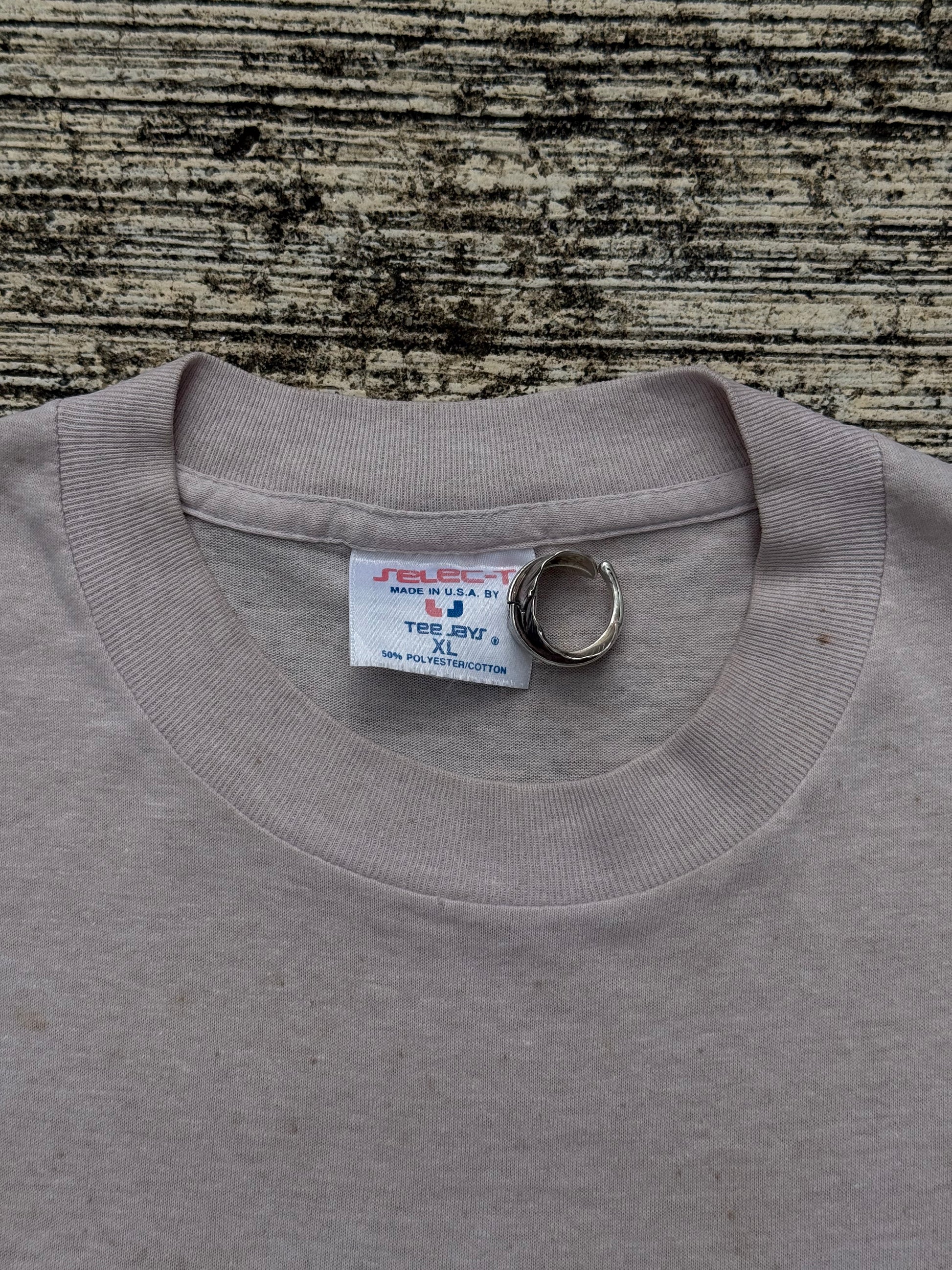 Original 1980s Myrtle Beach souvenir tee. Features big “SUN STATION” graphic with colorful retro summer blocks. Soft 50/50 poly-cotton blend, Made in USA by Tee Jays. Perfect faded look with some vintage stains for authentic character.