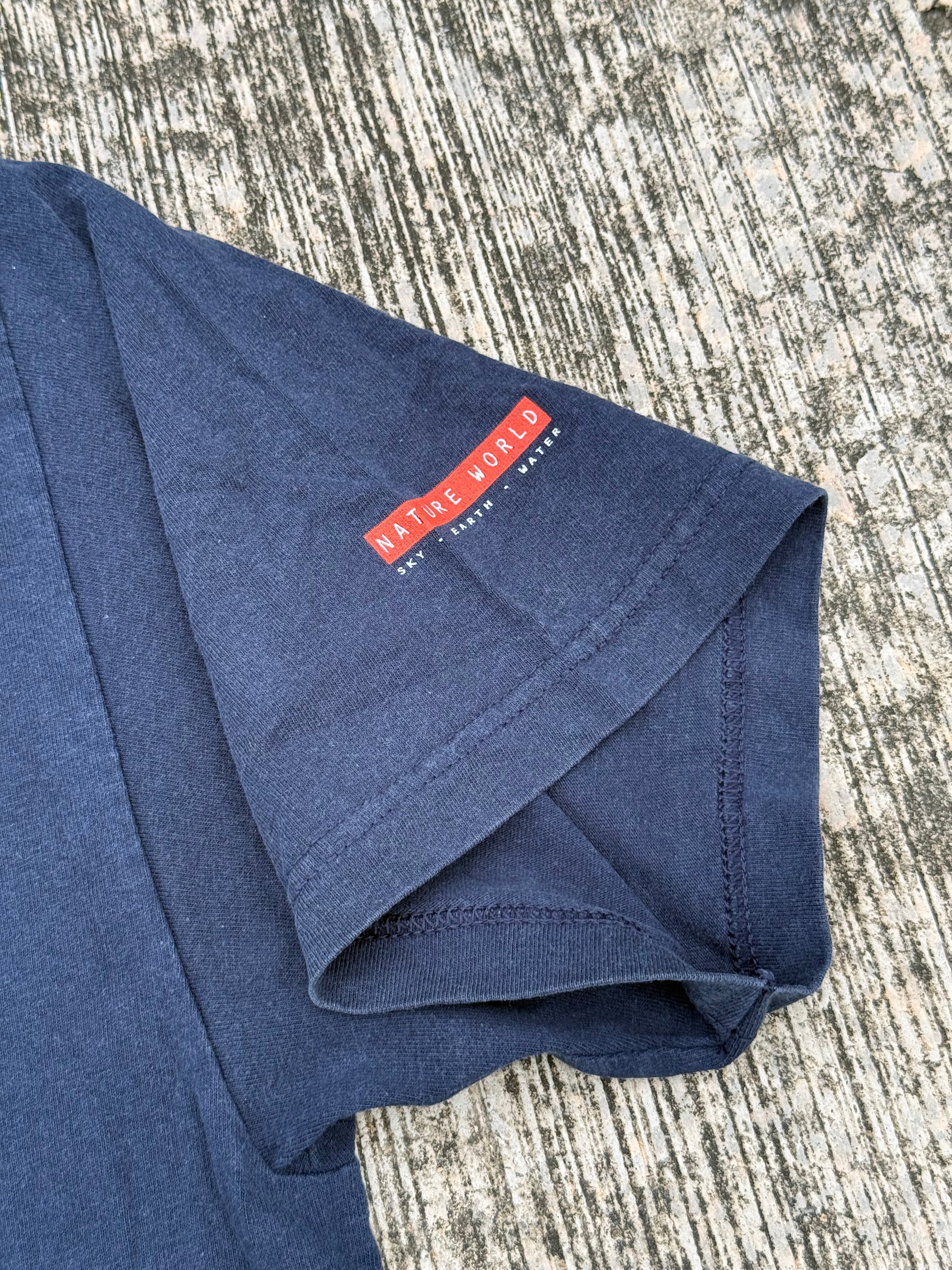 Vintage 1990s Nature World tee featuring minimal globe logo print on chest and scenic nature photo graphic on the back. Clean outdoor aesthetic with subtle branding and quality USA-made cotton. A great piece for collectors of 90s outdoor/streetwear crossover.