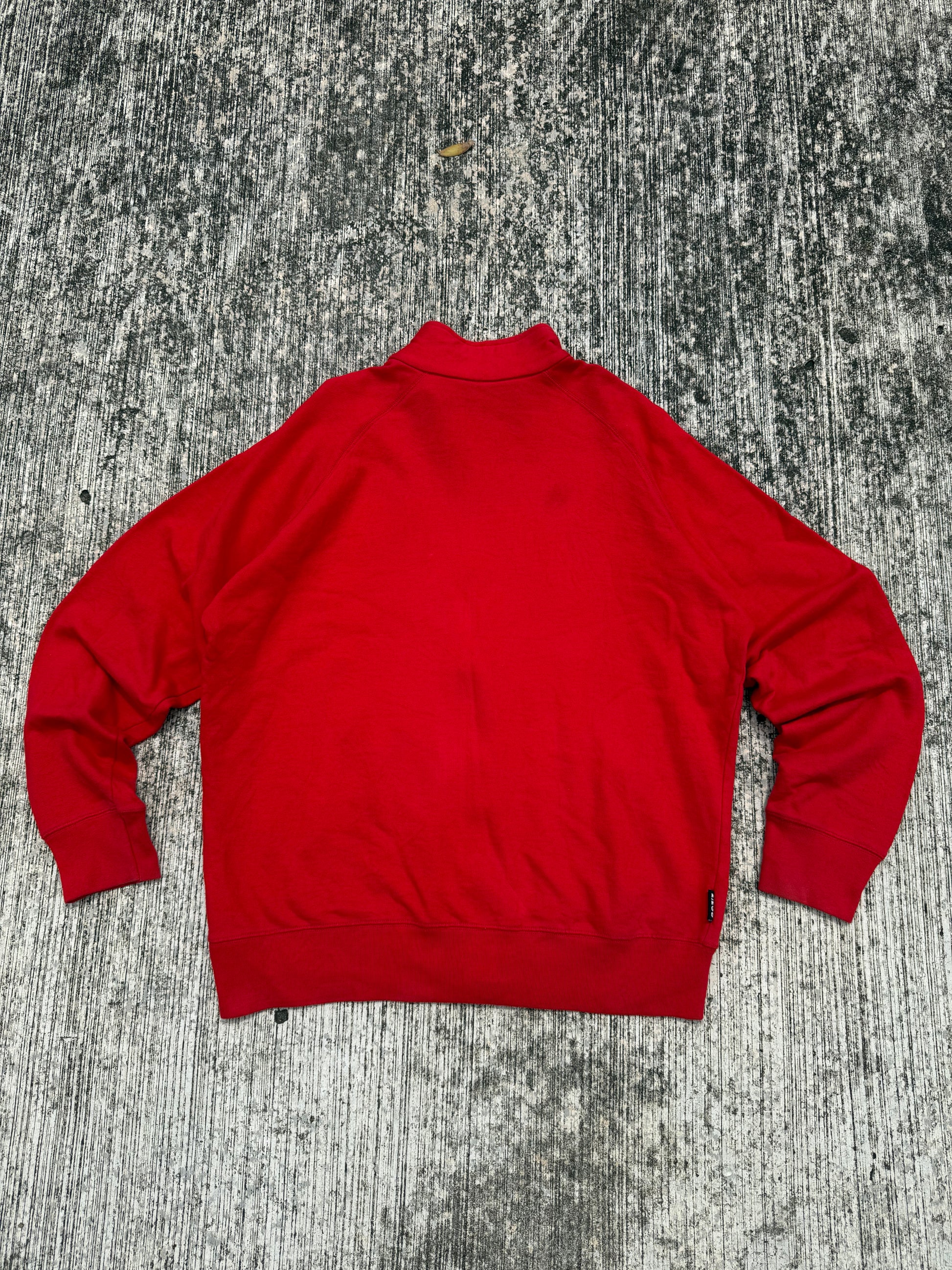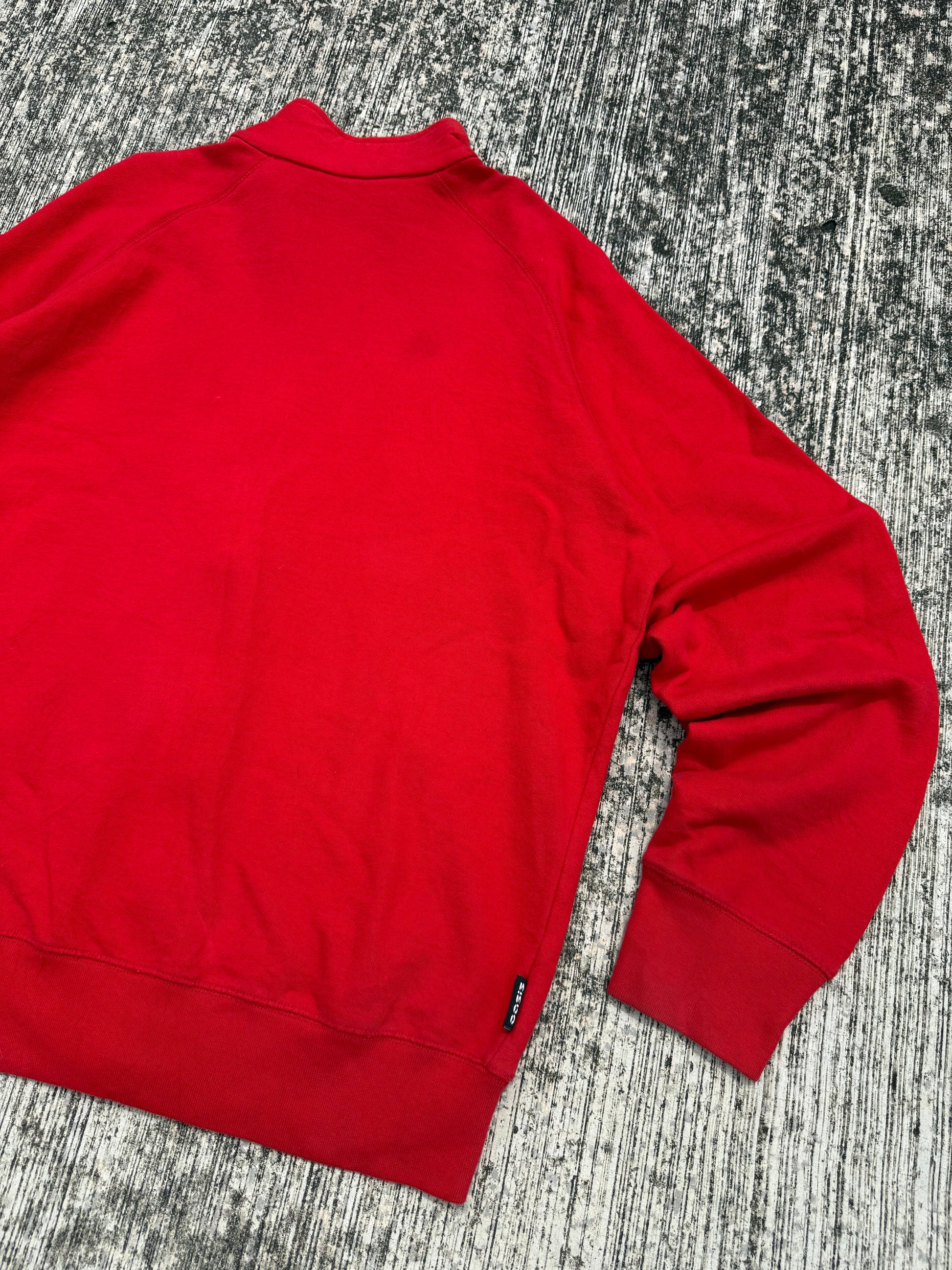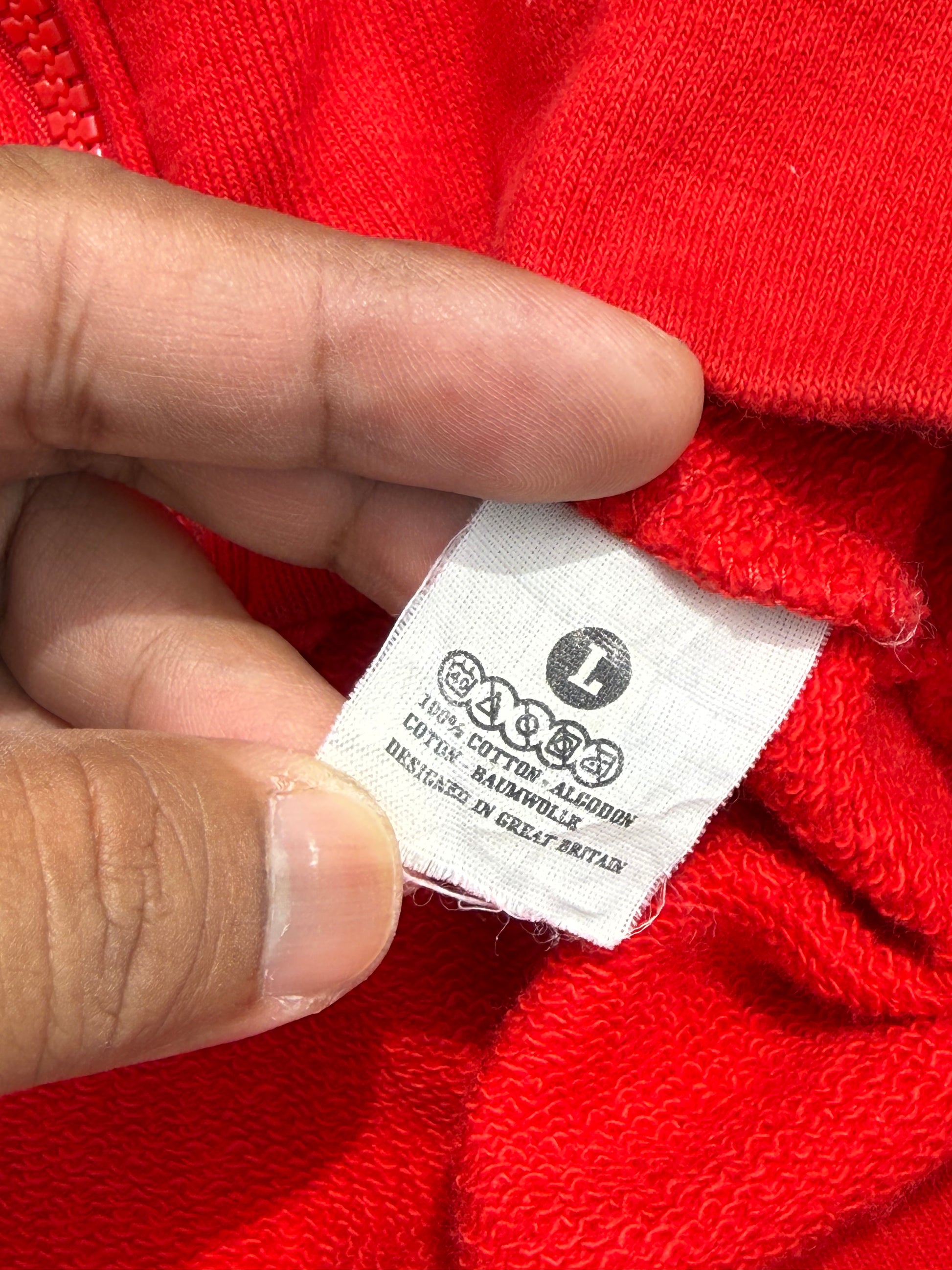 Original Oasis full zip track jacket designed in Great Britain. Bright red cotton blend with embroidered Oasis logo featuring Union Jack-inspired stars motif on chest and woven side tag. Ribbed cuffs and hem, ring pull zipper, and soft loopback interior.