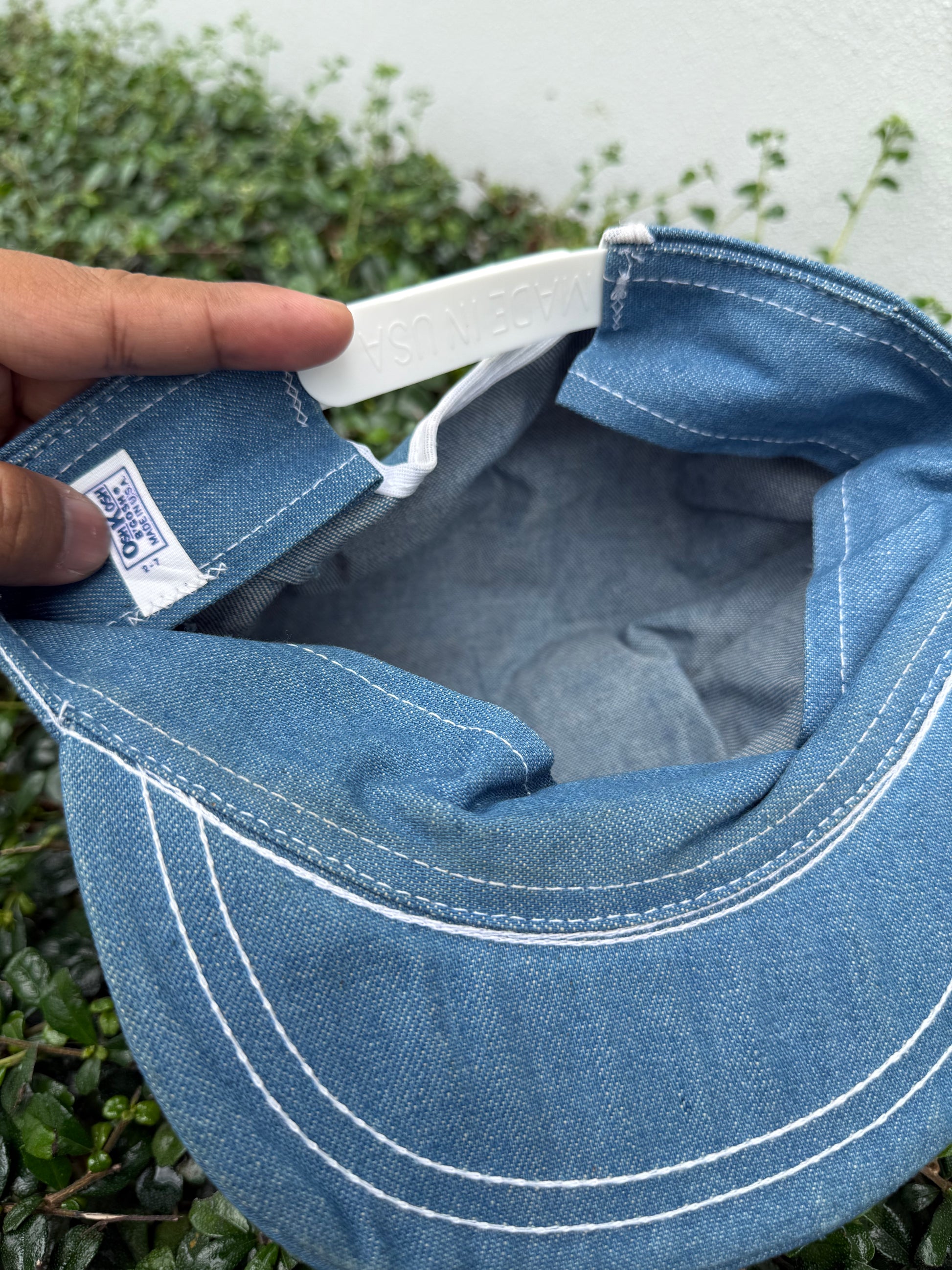 Vintage OshKosh B’Gosh kids cap in chambray/light denim blue. Features woven “The Genuine Article” label on front, contrast white stitching, and adjustable white snapback marked Made in USA. A classic American workwear-inspired kids cap, collectible and wearable.