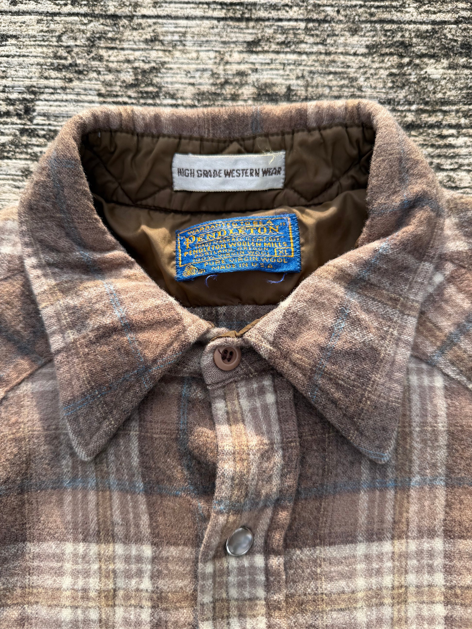 Classic vintage Pendleton High Grade Western Wear wool shirt in earthy brown plaid tones with subtle cream and blue accents. Features Western styling with pointed yokes, two flap chest pockets, and snap button front closure. Quilted inner yoke lining adds comfort and warmth.