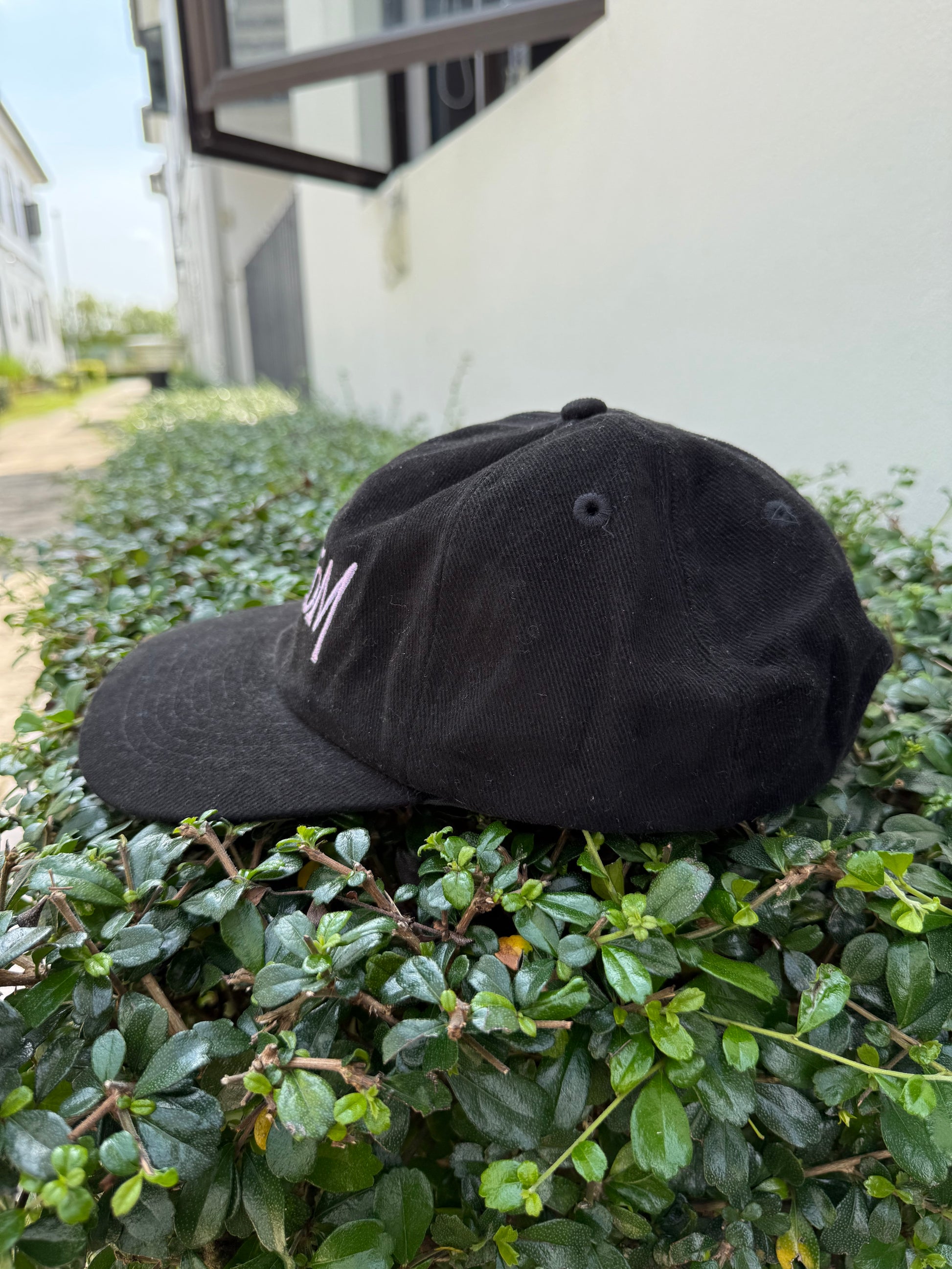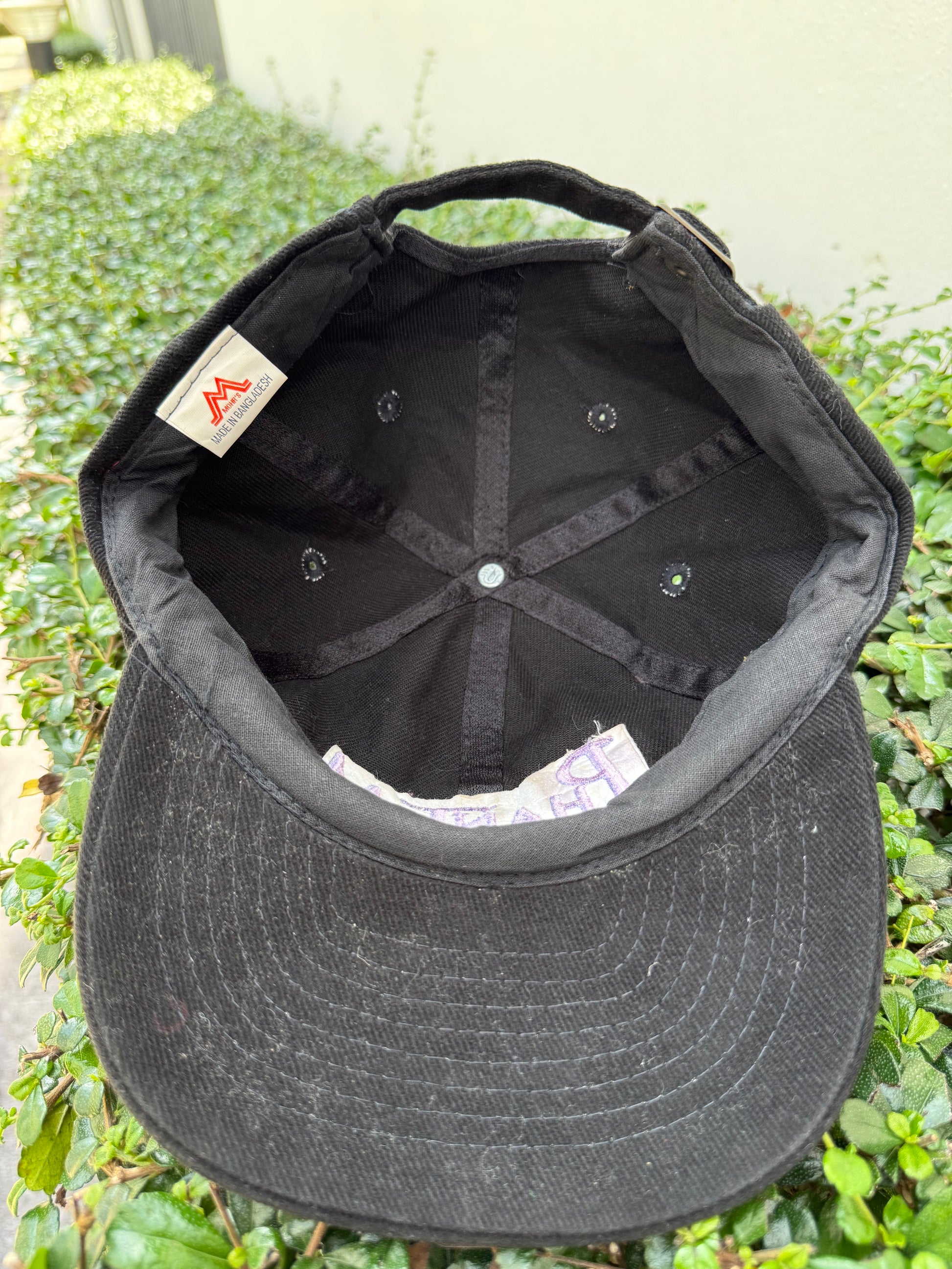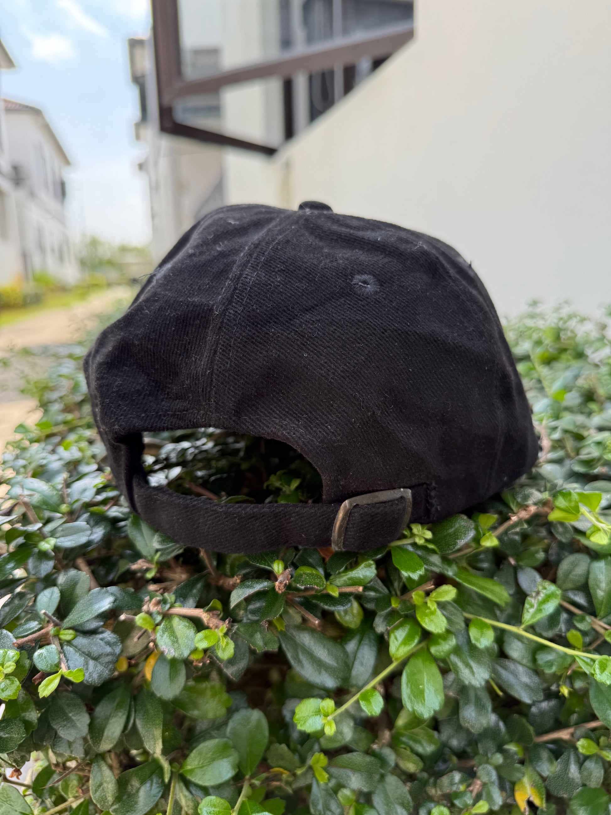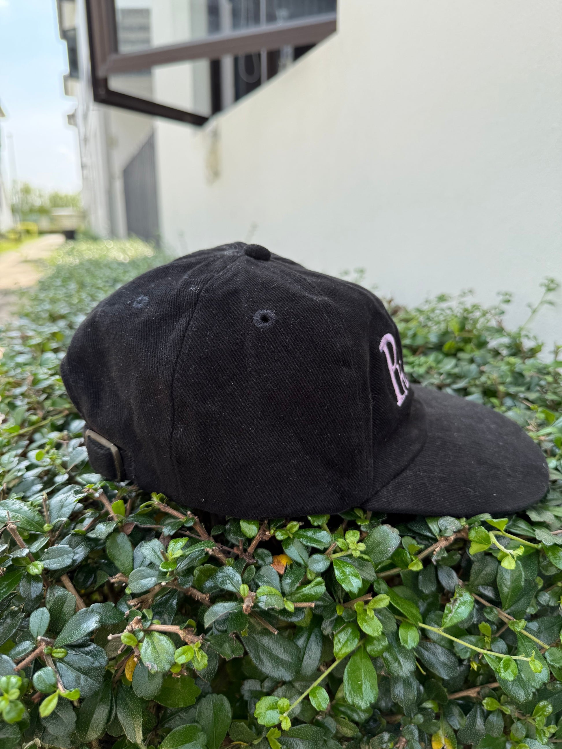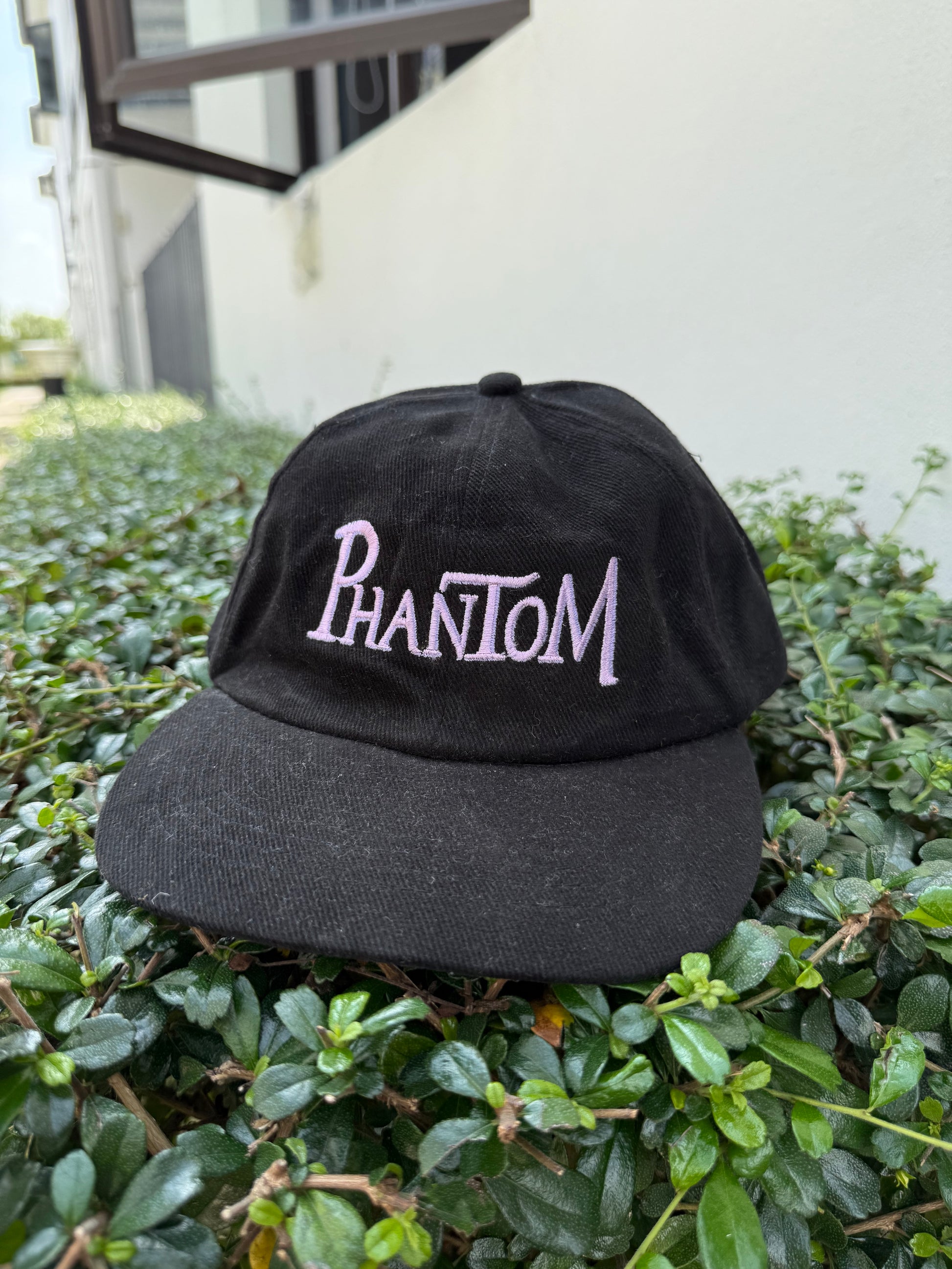 Black strapback cap featuring bold Phantom embroidery across the front panel in light lavender thread. A mysterious and minimalist piece of vintage streetwear, this cap carries an understated yet striking presence.