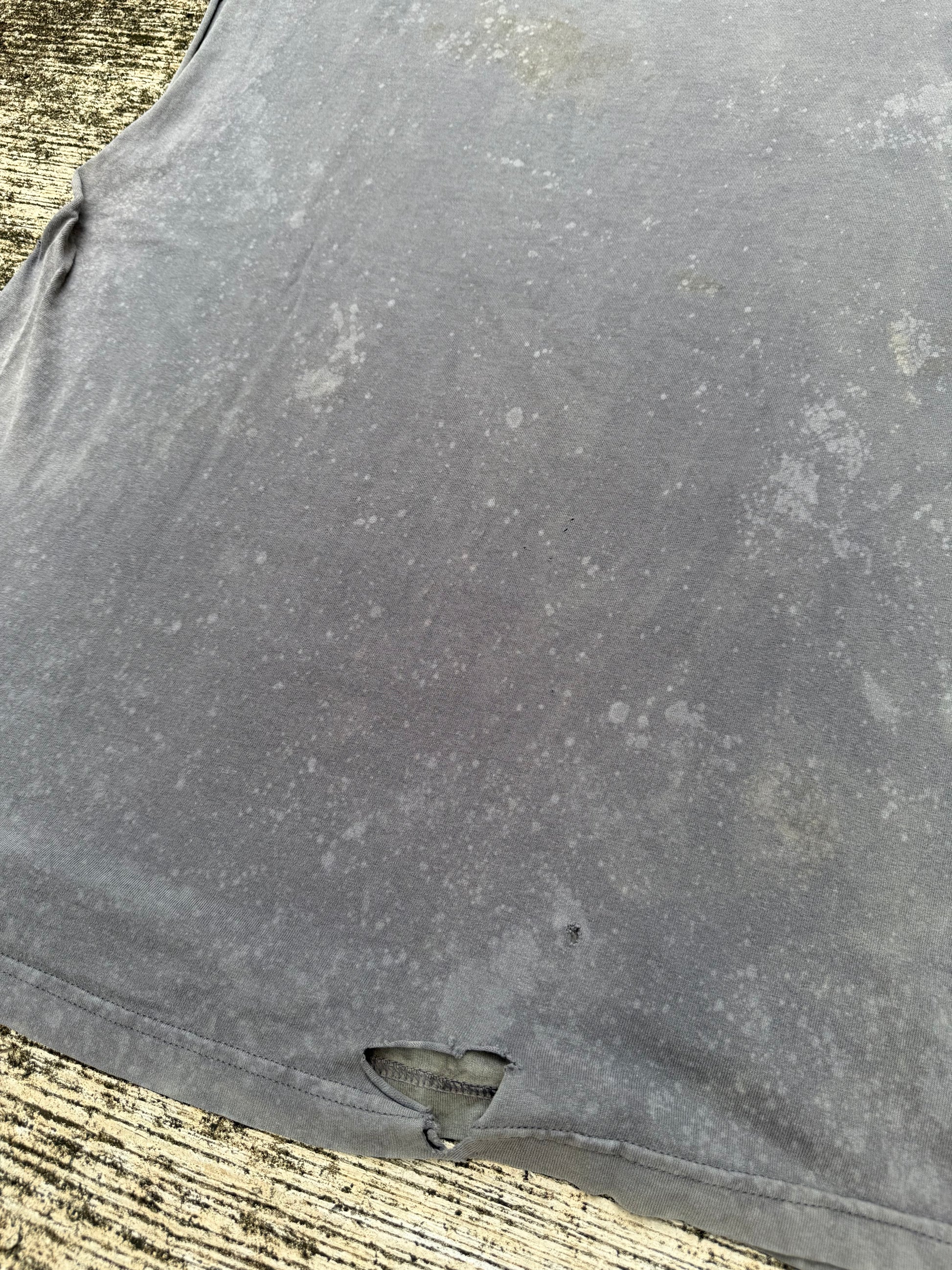 • Condition: Heavy vintage distressing – holes, bleach spotting, hem tear (all shown in photos). Still wearable with authentic patina.