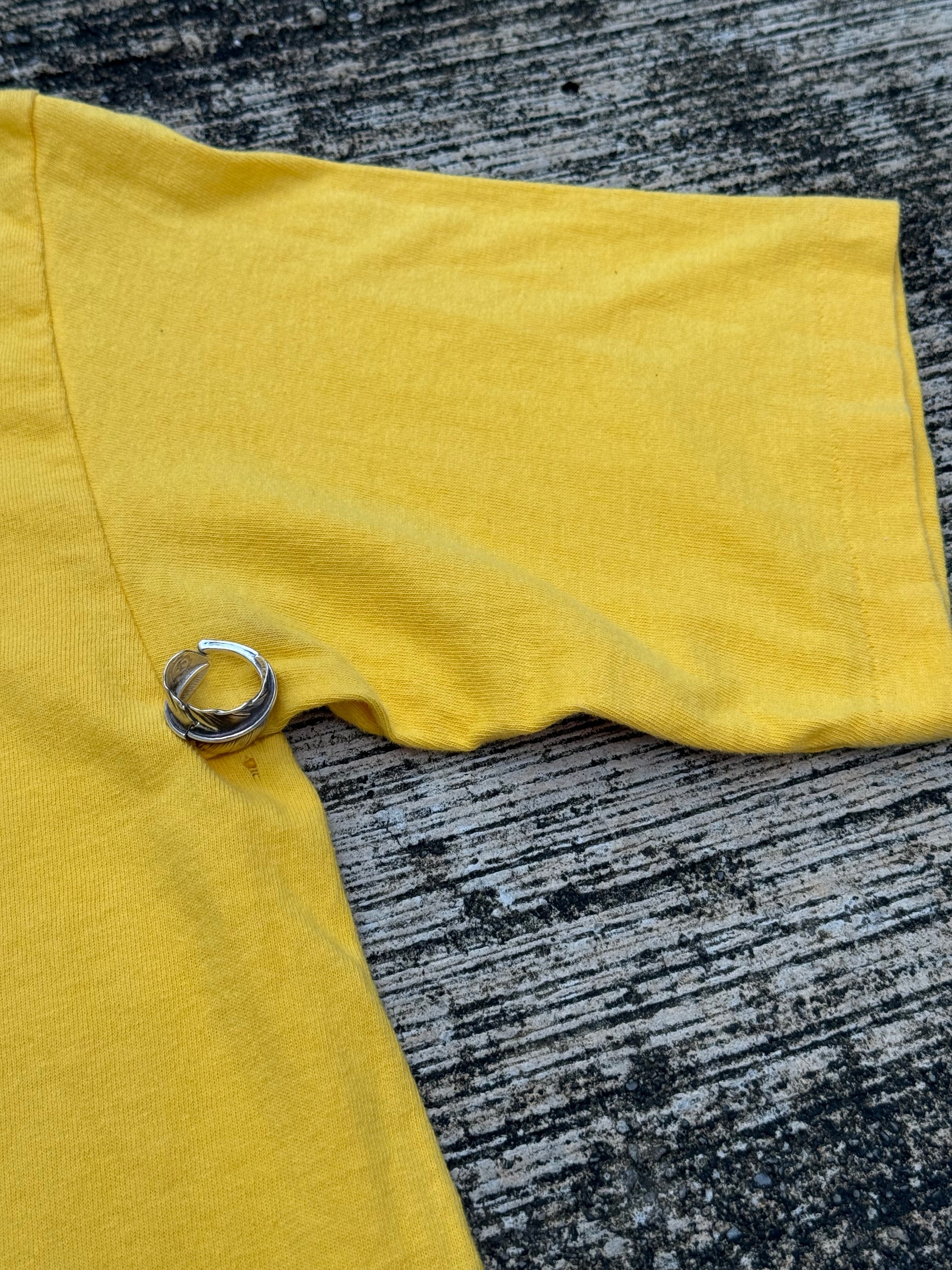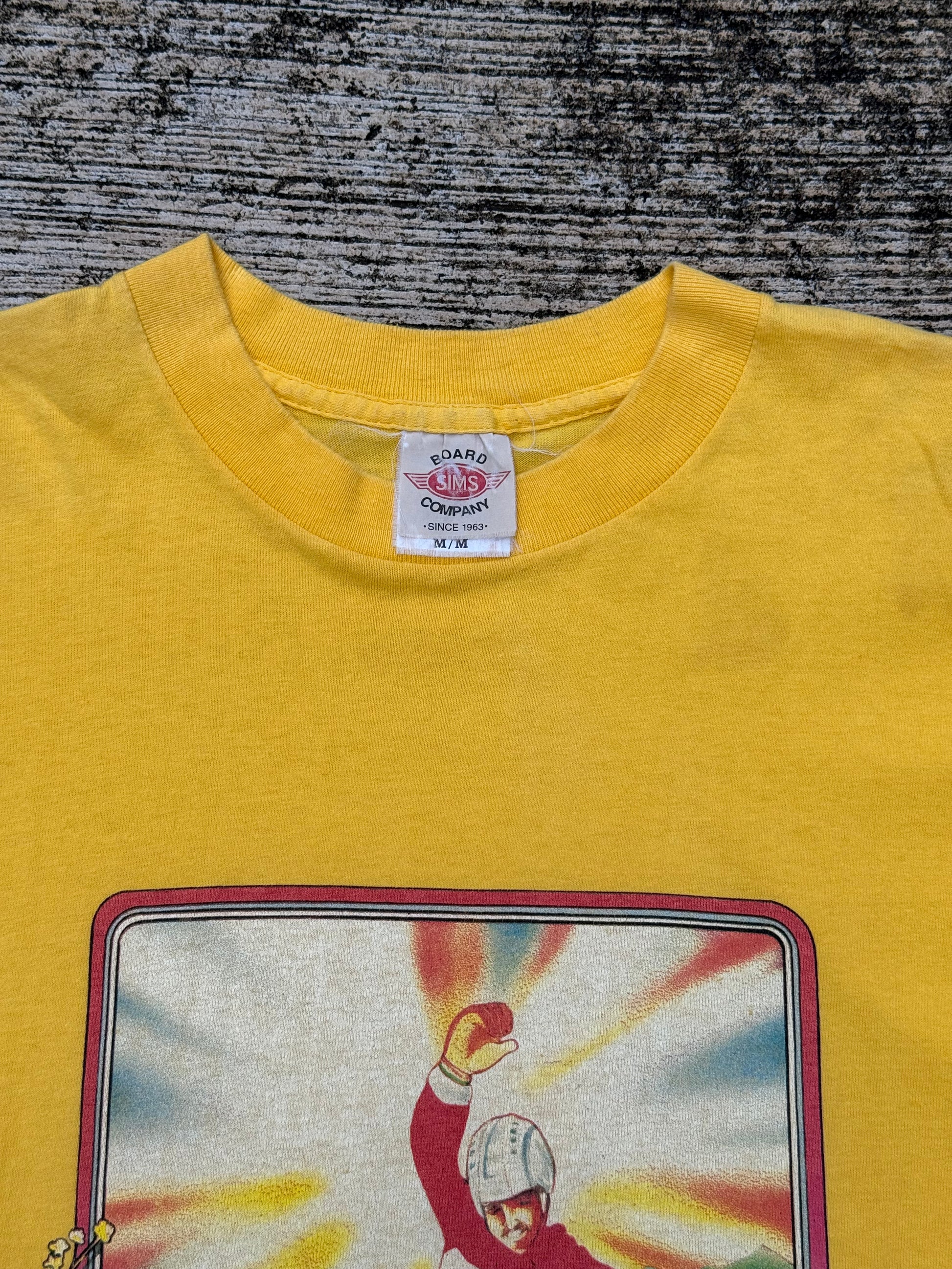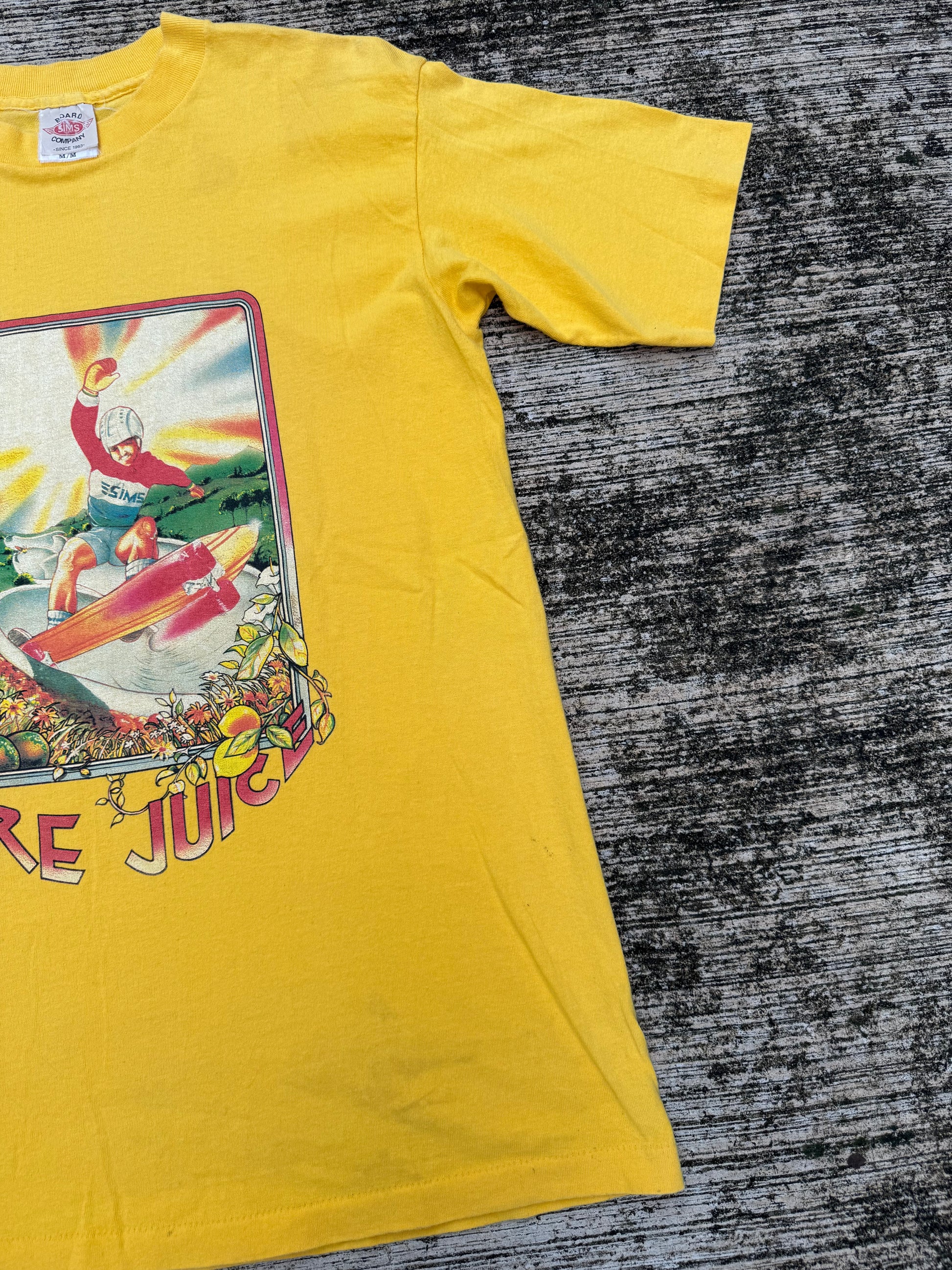 Original Sims Board Company tee in bright yellow with large front graphic featuring a retro cartoon skater launching out of a juice carton under the slogan “Pure Juice”.