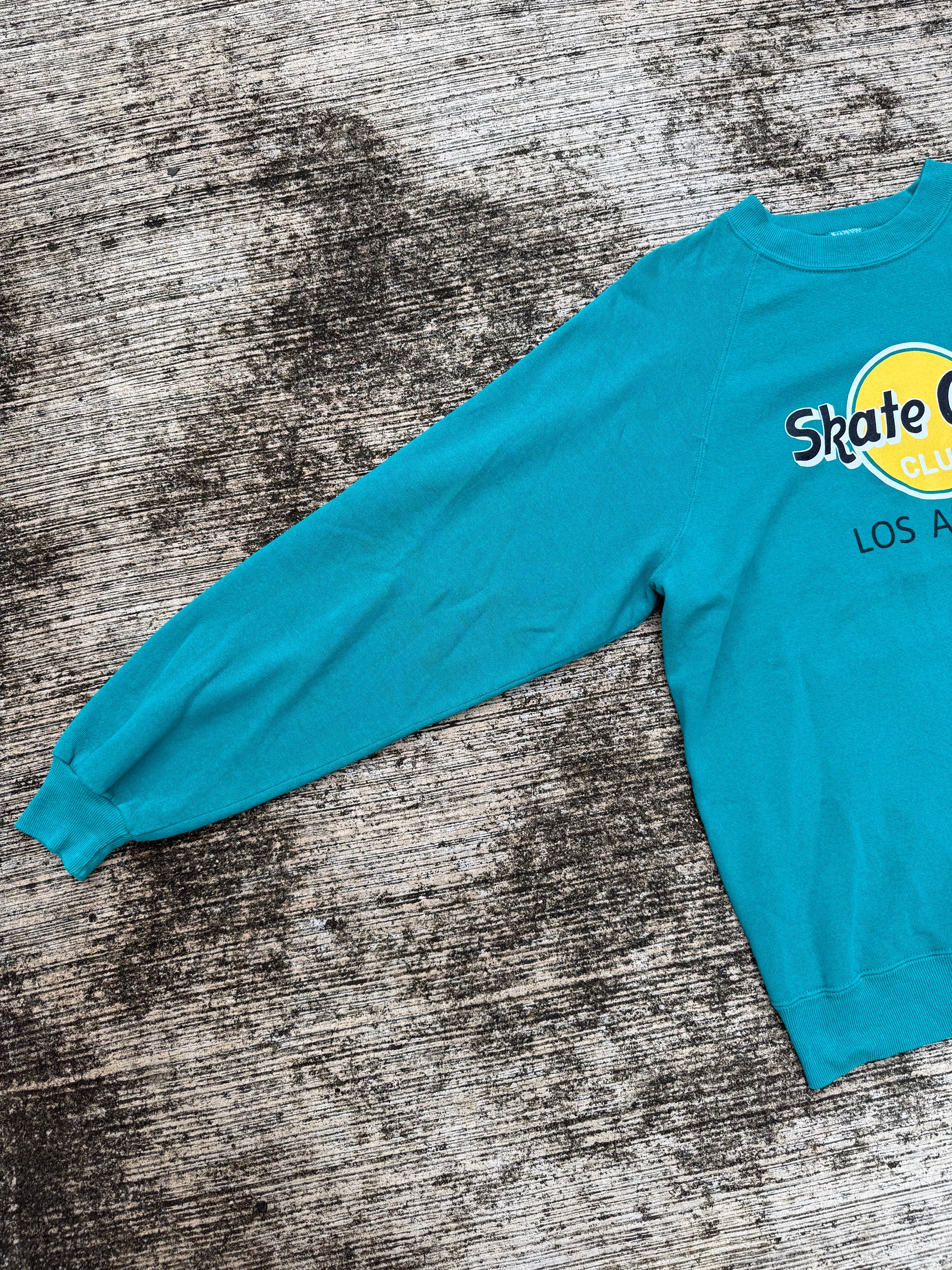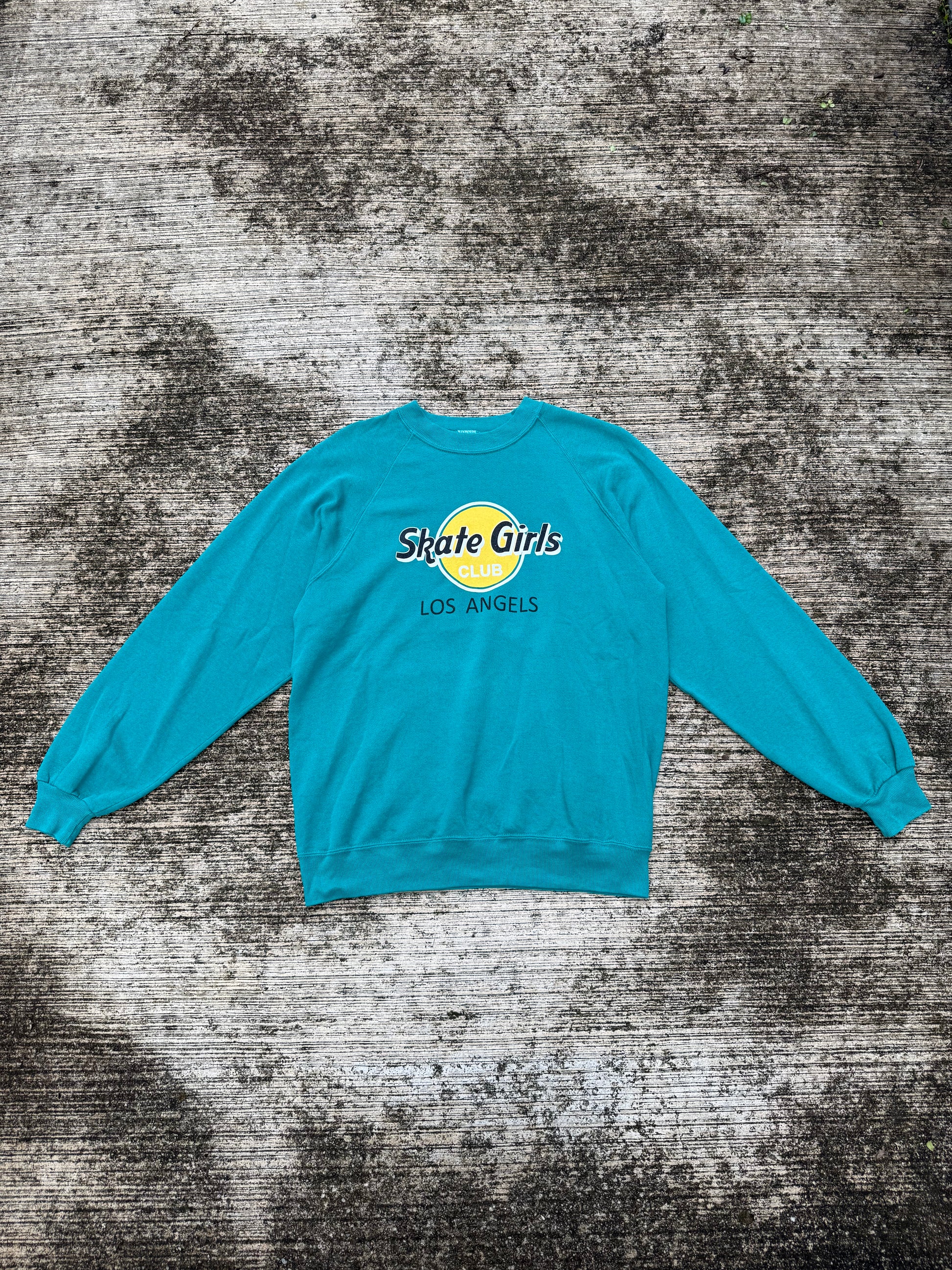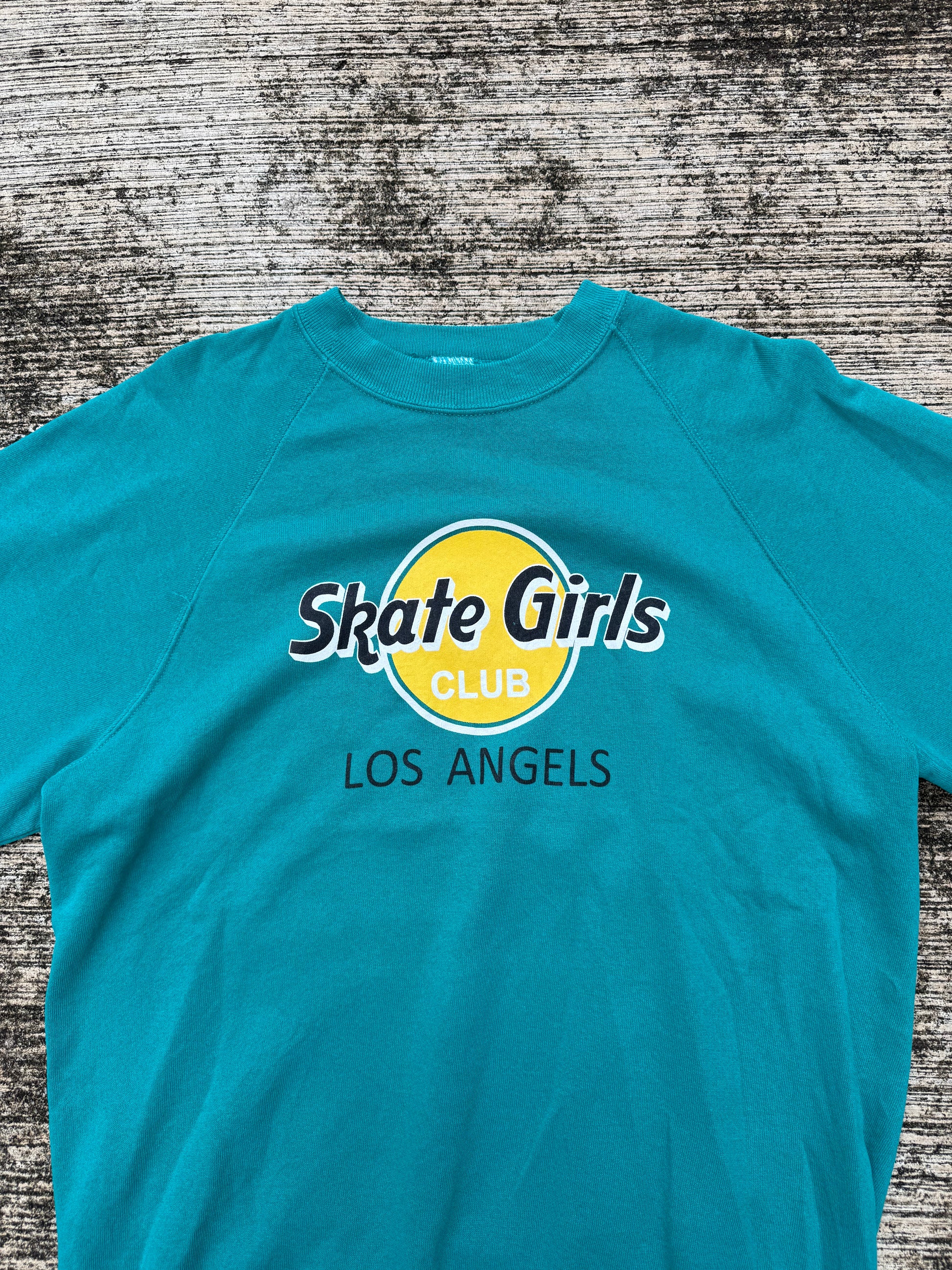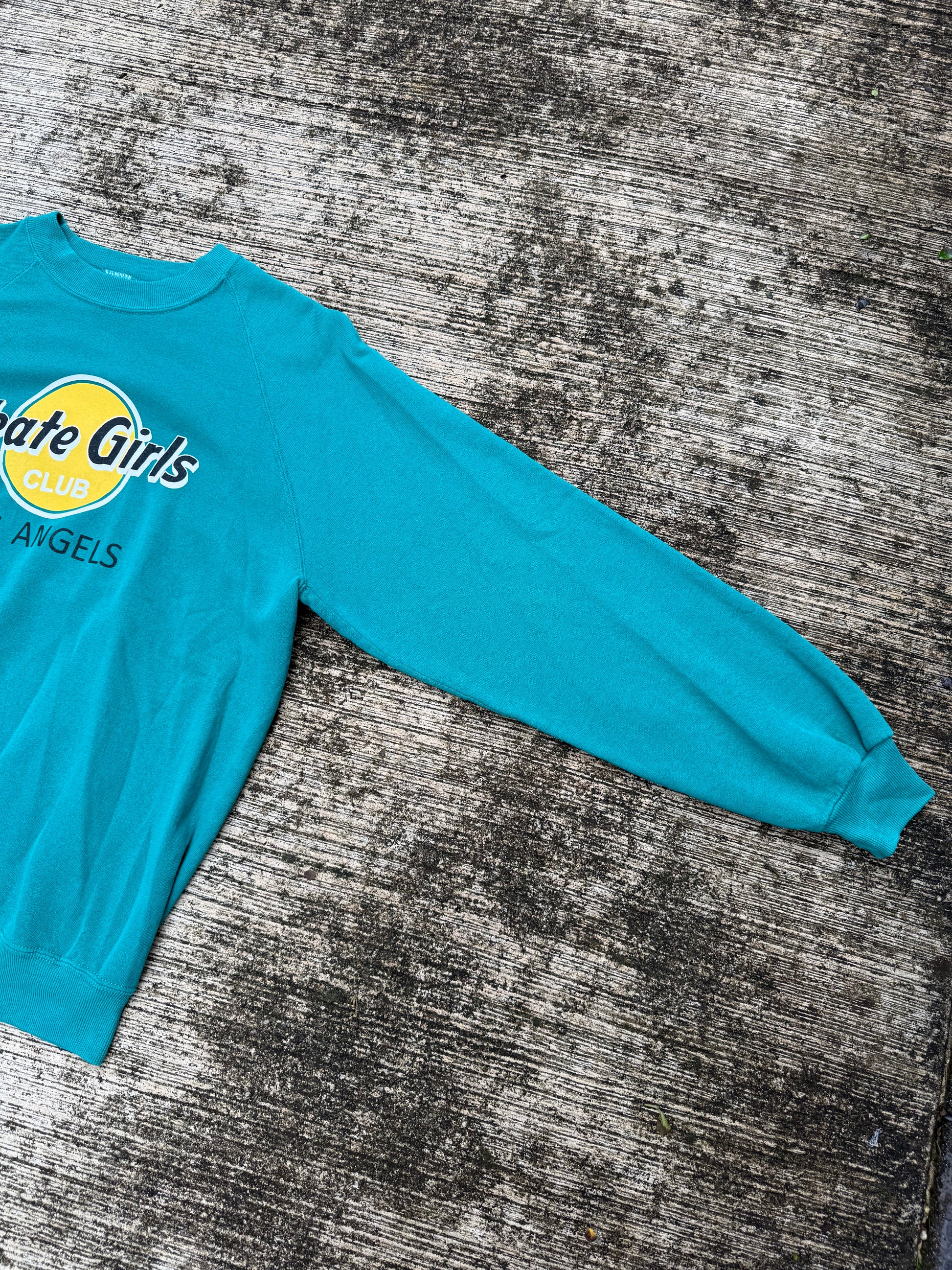 Original Skate Girls Club Los Angeles sweatshirt in teal blue with bold chest print featuring the circular yellow logo and “Skate Girls Club – Los Angels” text.