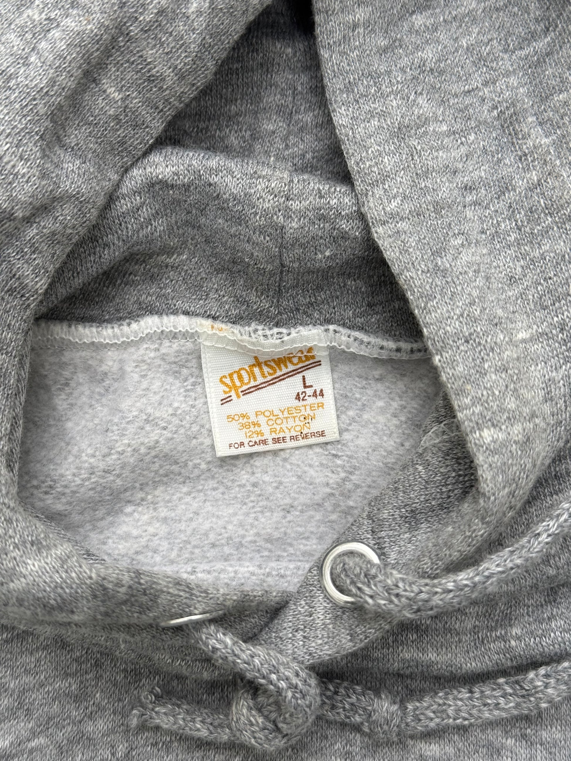 Original 70s–80s Sportswear hoodie in heather grey. Made in USA with soft tri-blend fabric (poly/cotton/rayon) for lightweight comfort and vintage drape. Features drawstring hood, front kangaroo pocket, and ribbed cuffs/hem. Classic essential with timeless style.