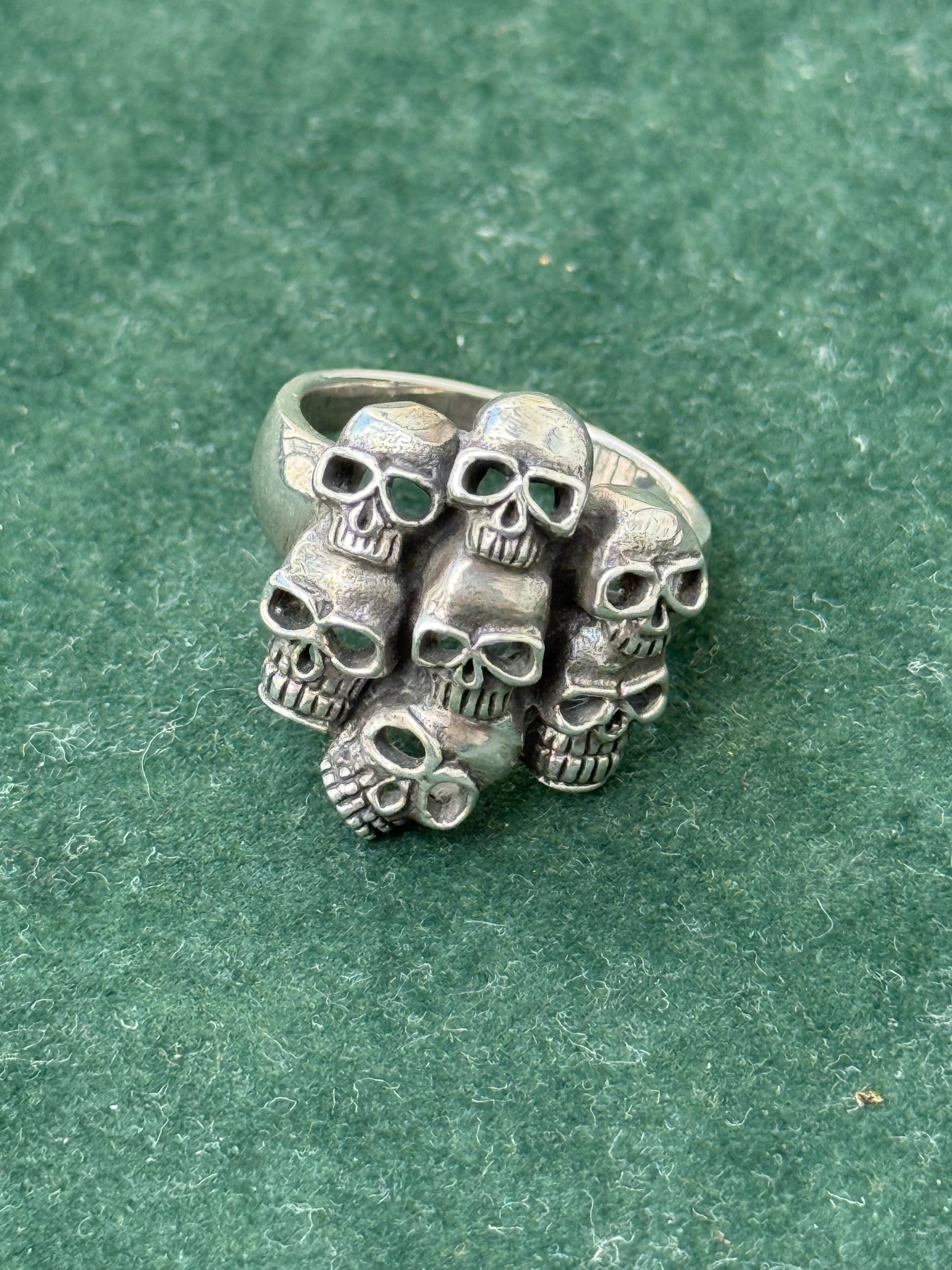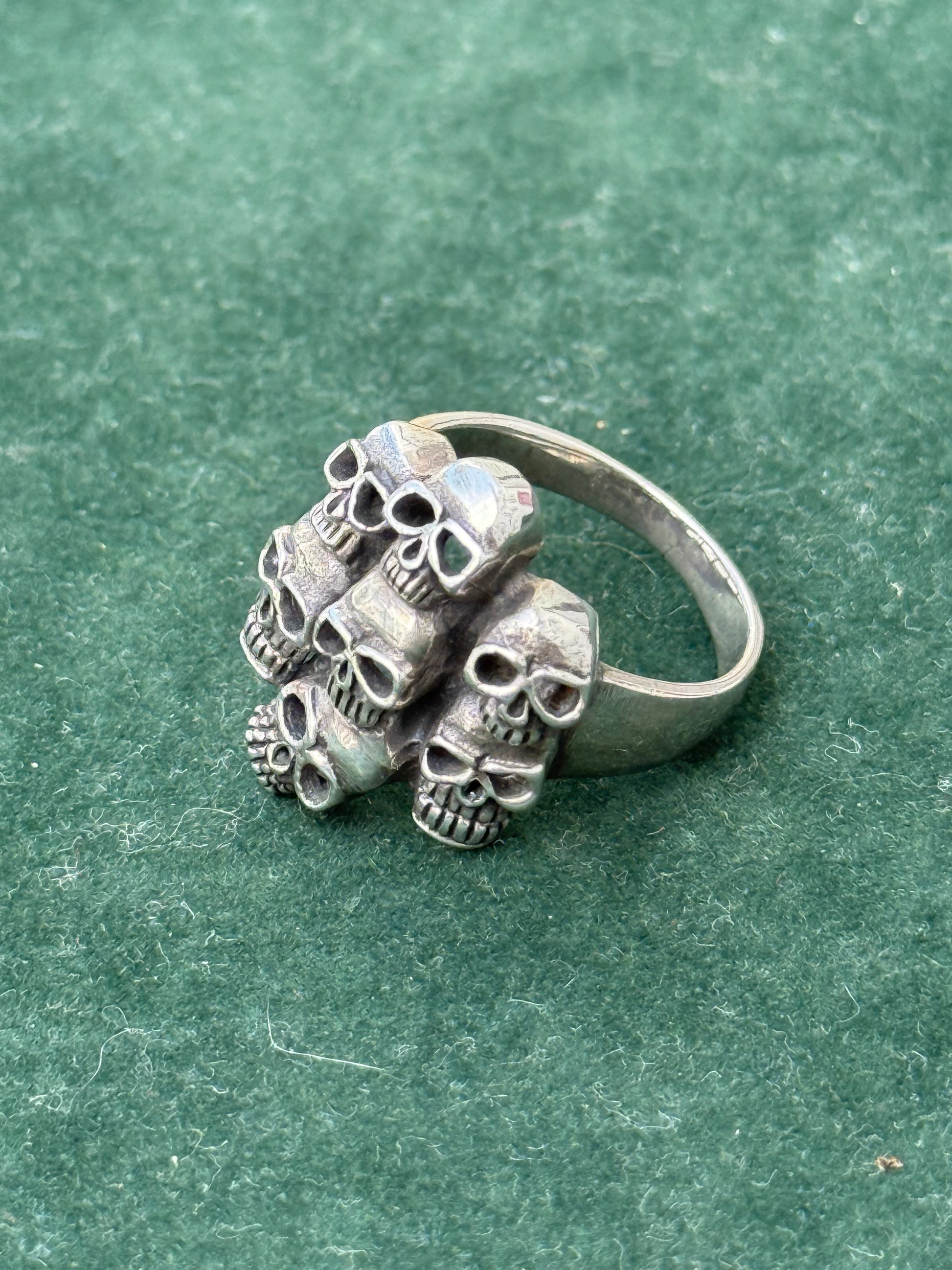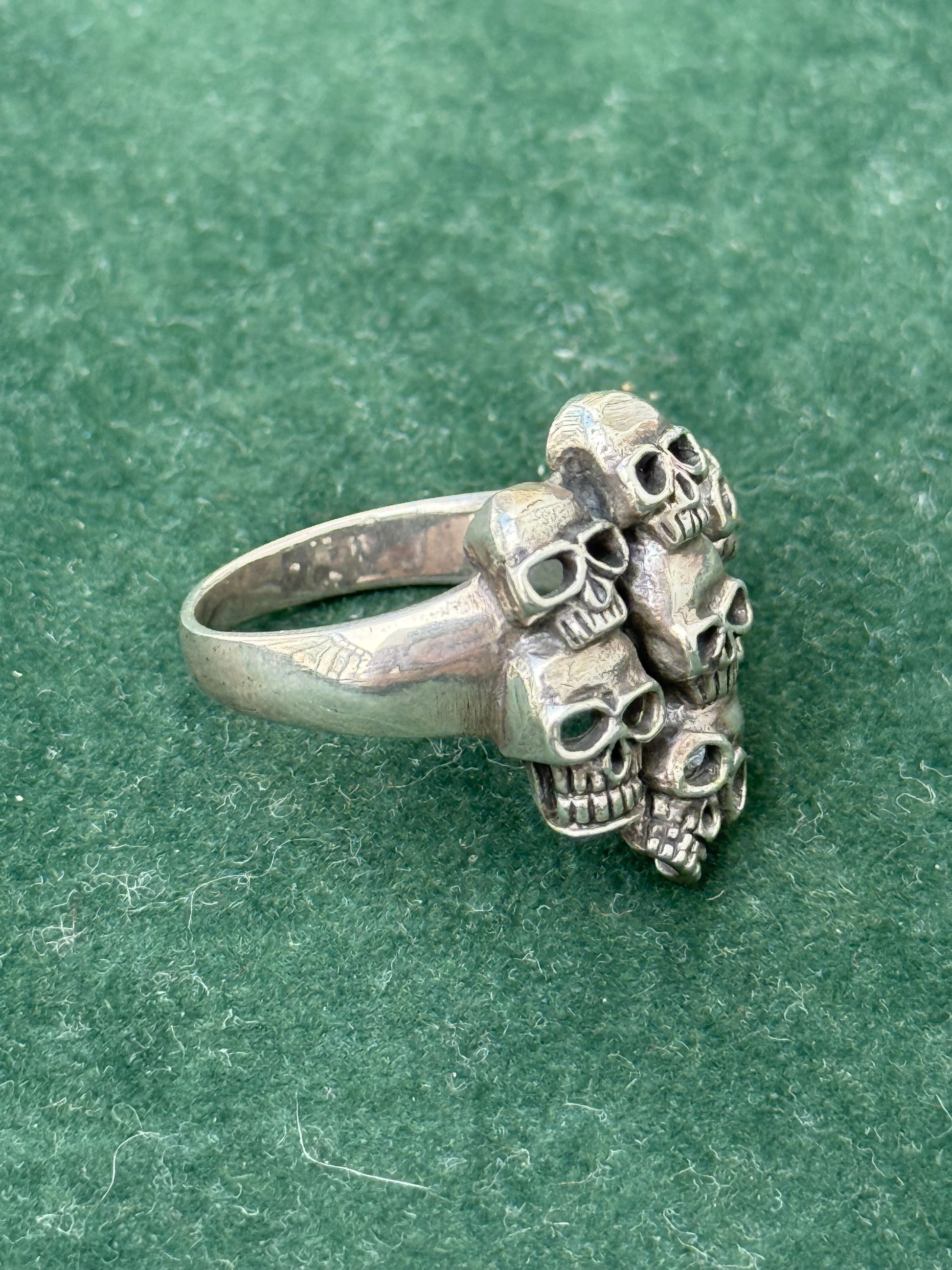 Bold vintage Sterling Silver 925 Skull Ring, featuring a unique cluster of detailed skull motifs stacked together in a striking design. Perfect for fans of biker, gothic, punk, or heavy-metal aesthetics. Crafted in solid silver with natural patina from age, giving it authentic vintage character.