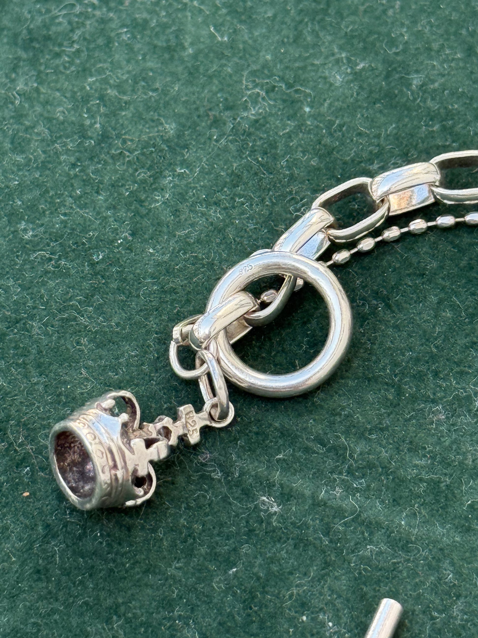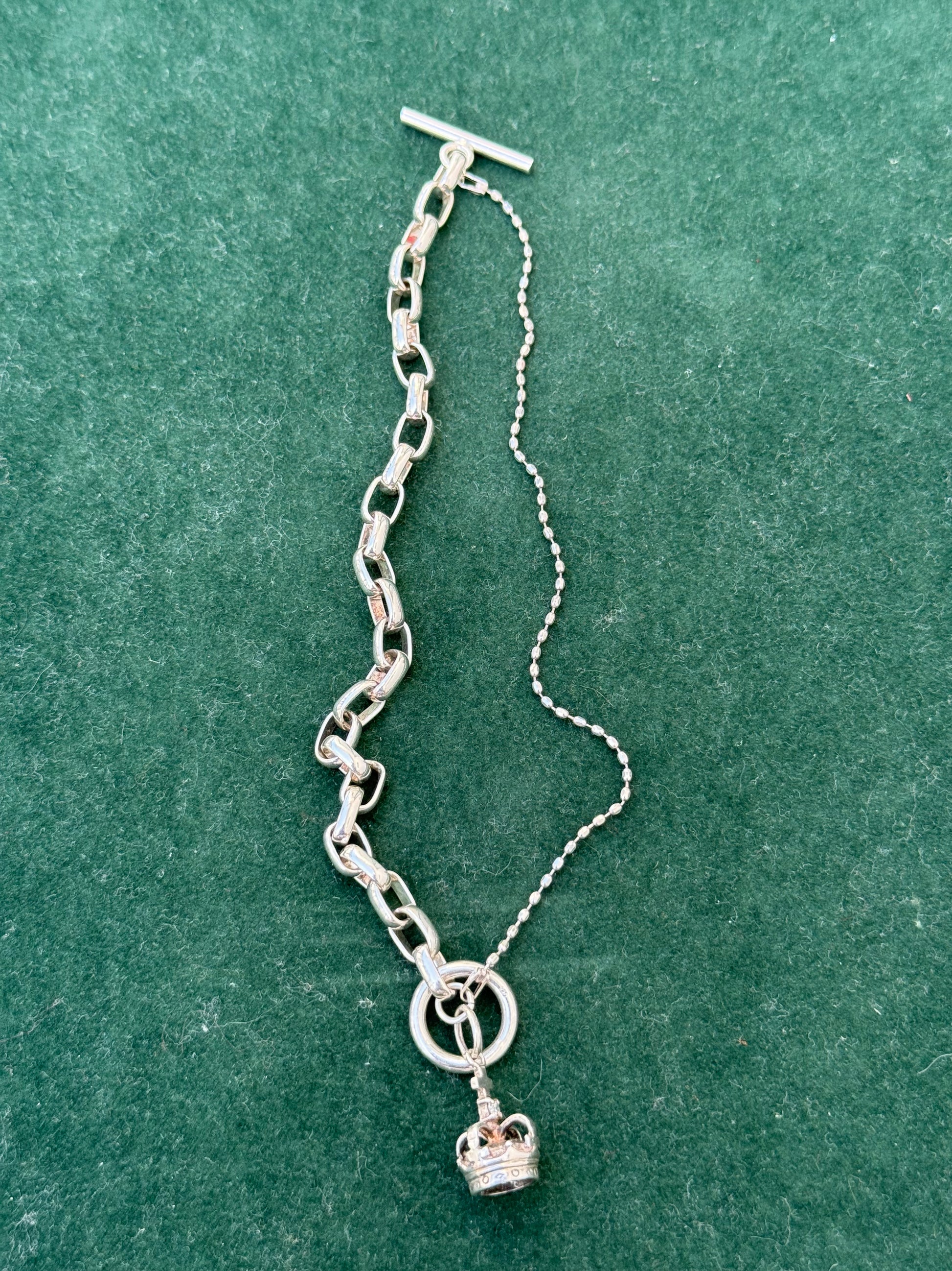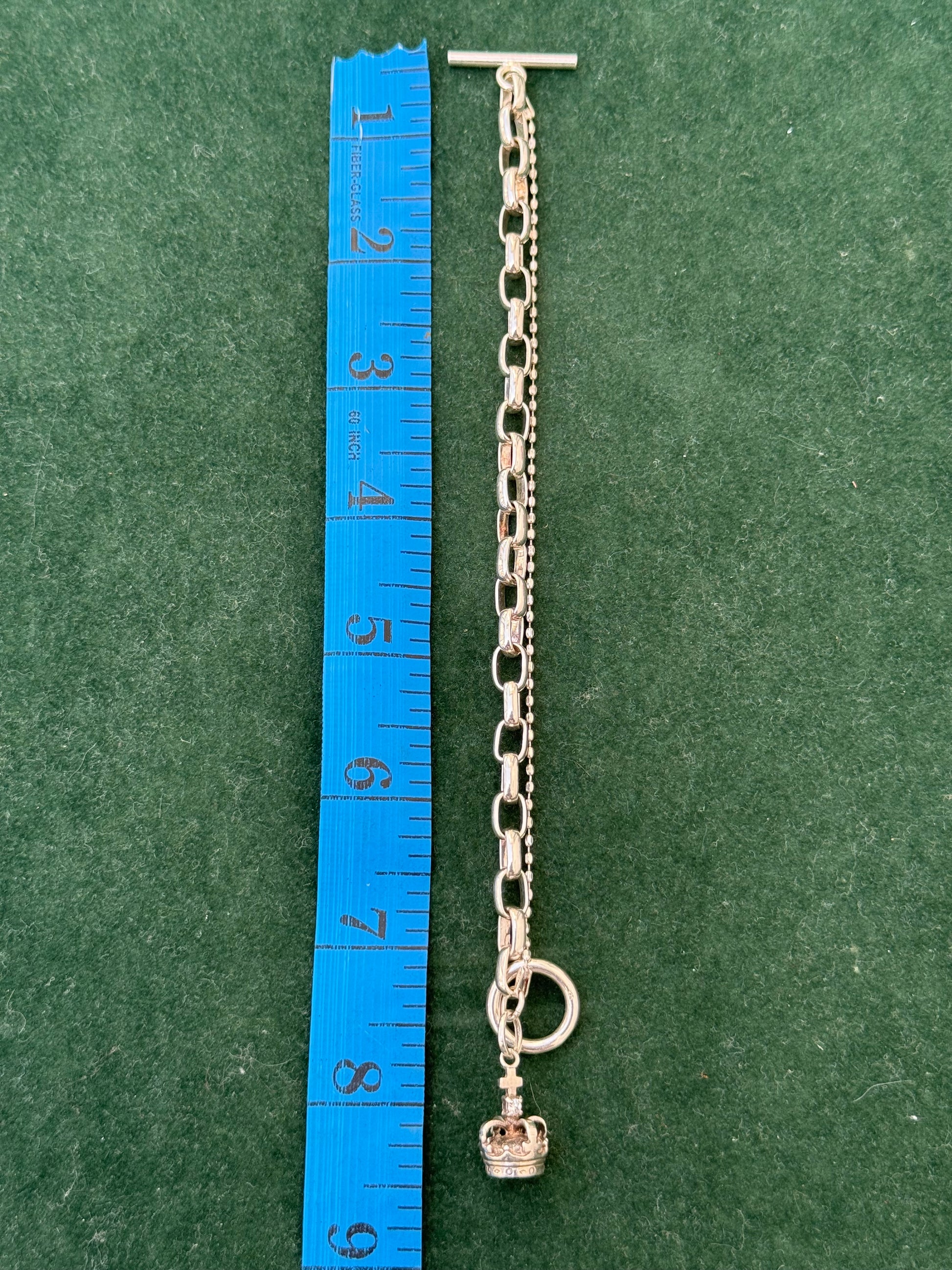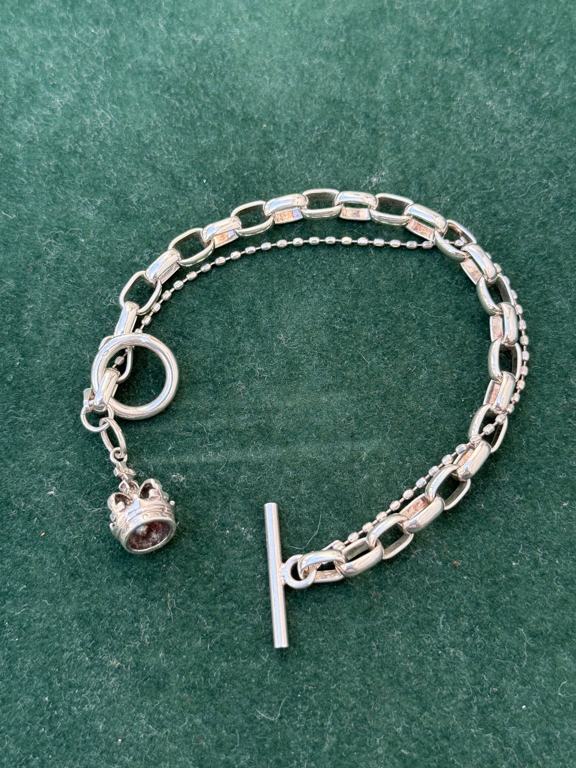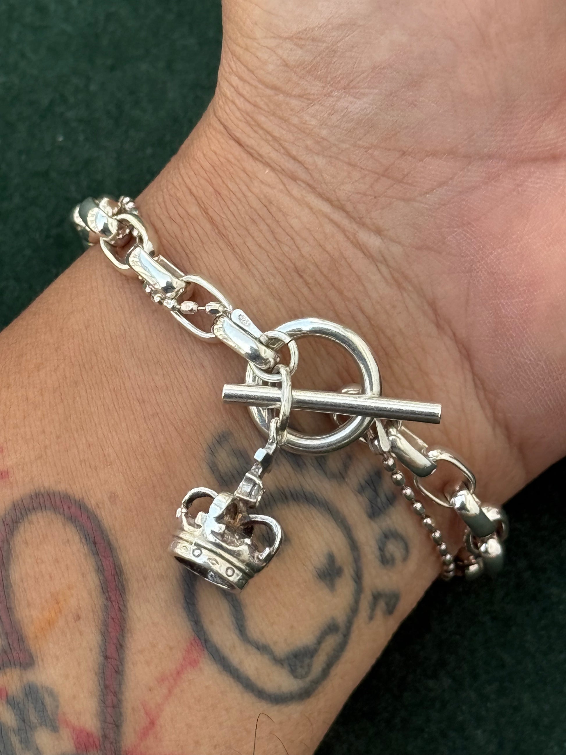 Stylish sterling silver bracelet featuring chunky chain links paired with a delicate beaded side chain, finished with a toggle clasp. Dangling crown charm adds a bold regal touch. Stamped 925 on clasp and charm. Statement piece that mixes elegance and edge, perfect for stacking or worn solo.