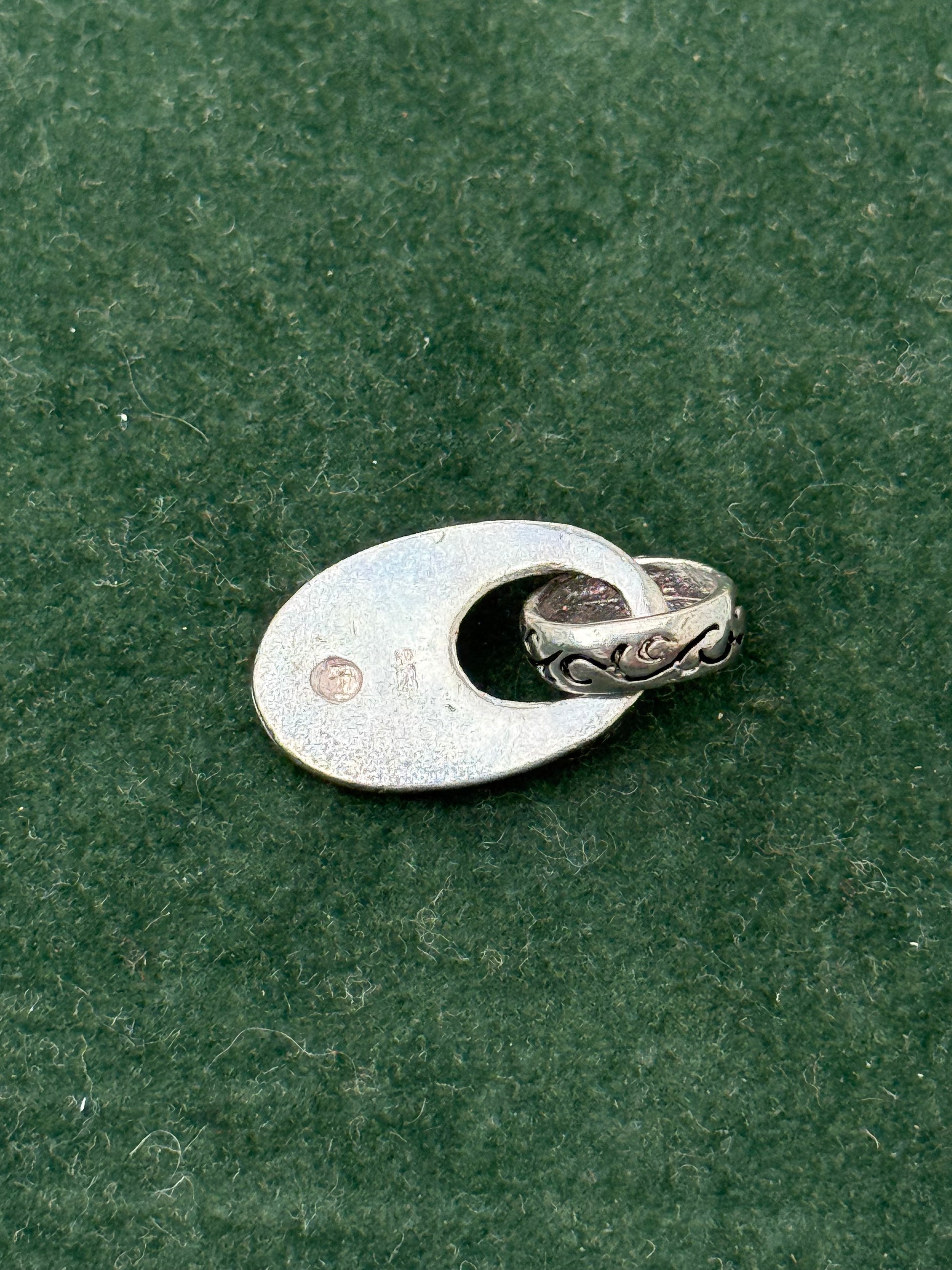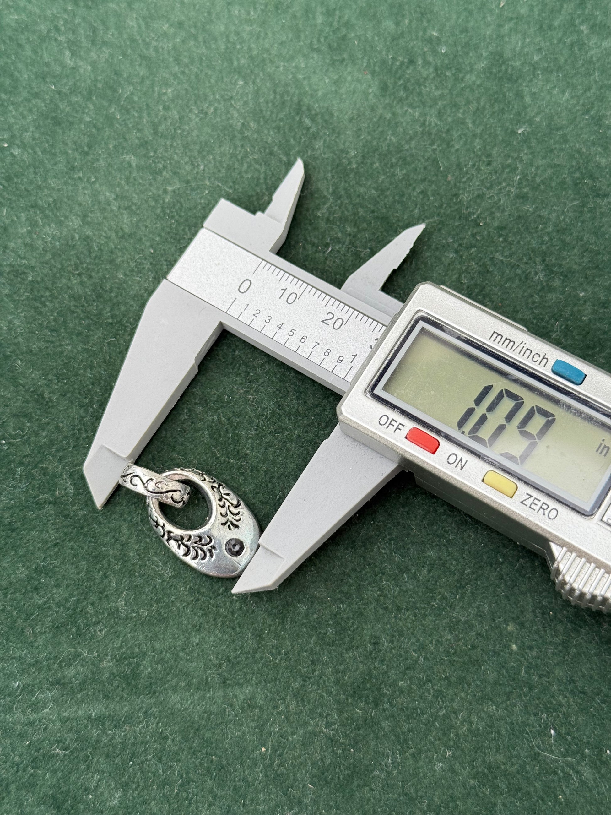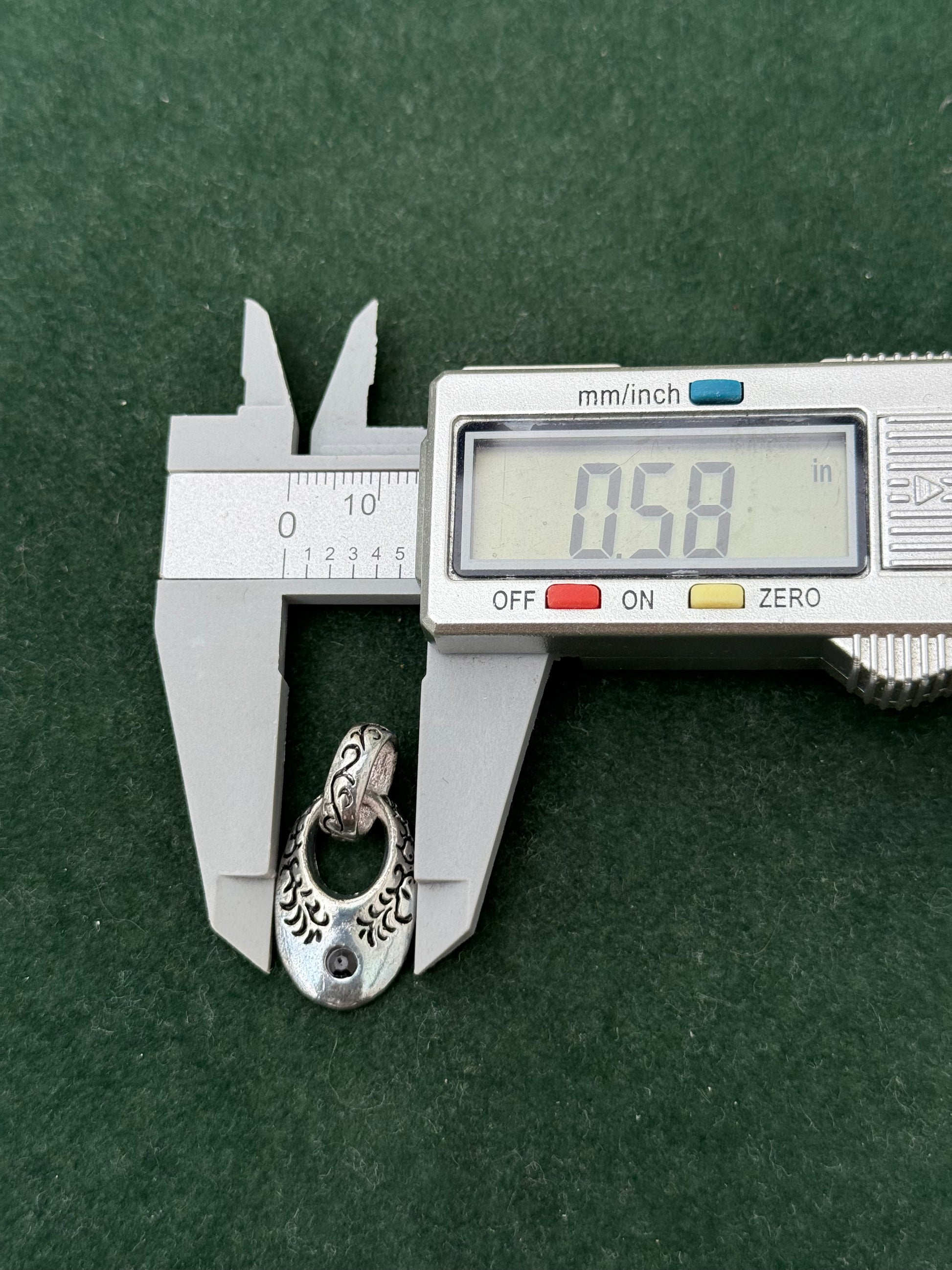 Unique vintage sterling silver pendant featuring delicate engraved floral motifs and a single dark stone accent at the base. The open teardrop design with ornate bail makes it a versatile piece, perfect for wearing on a chain or as part of a charm collection. A subtle patina adds to its vintage character.