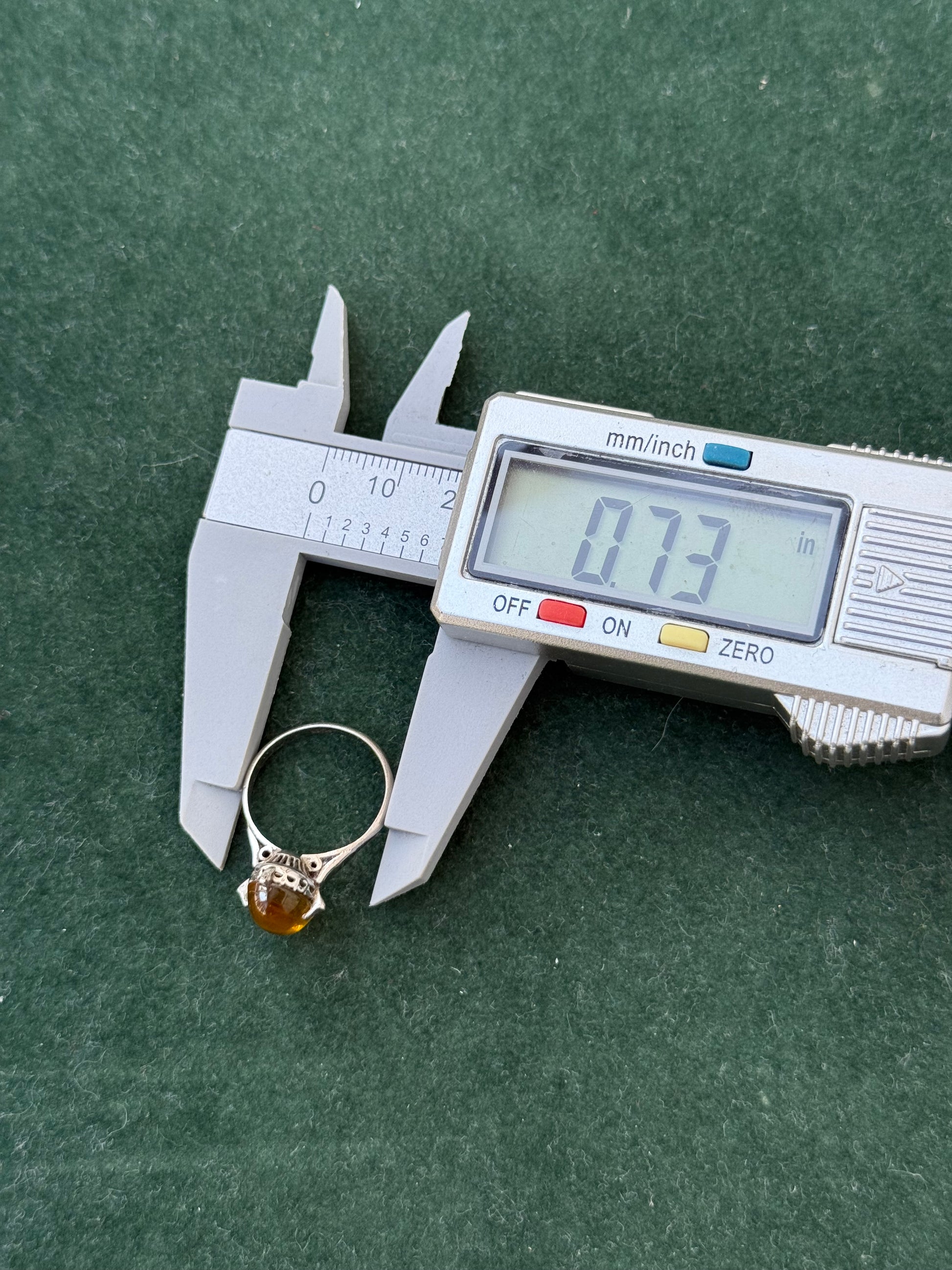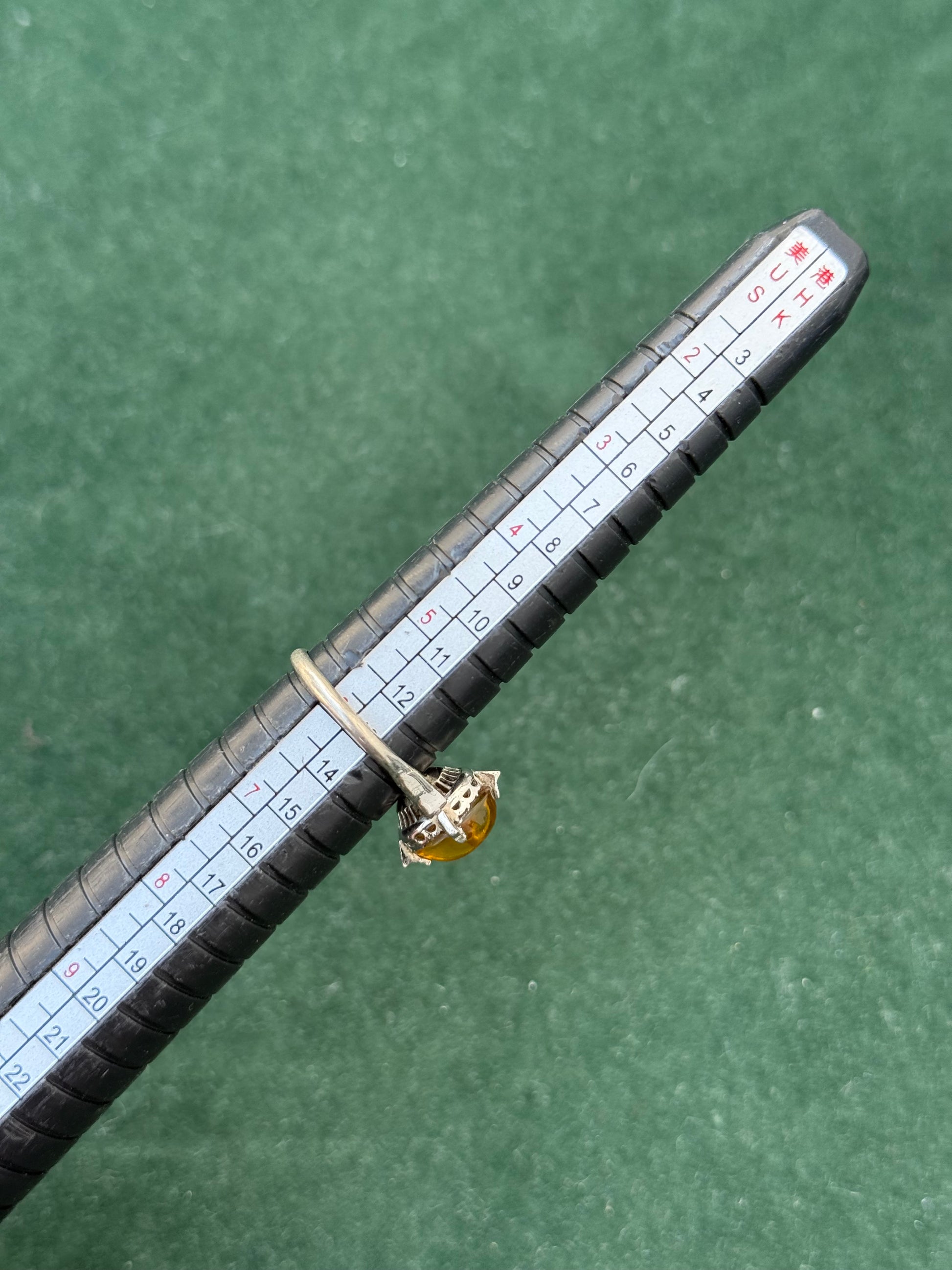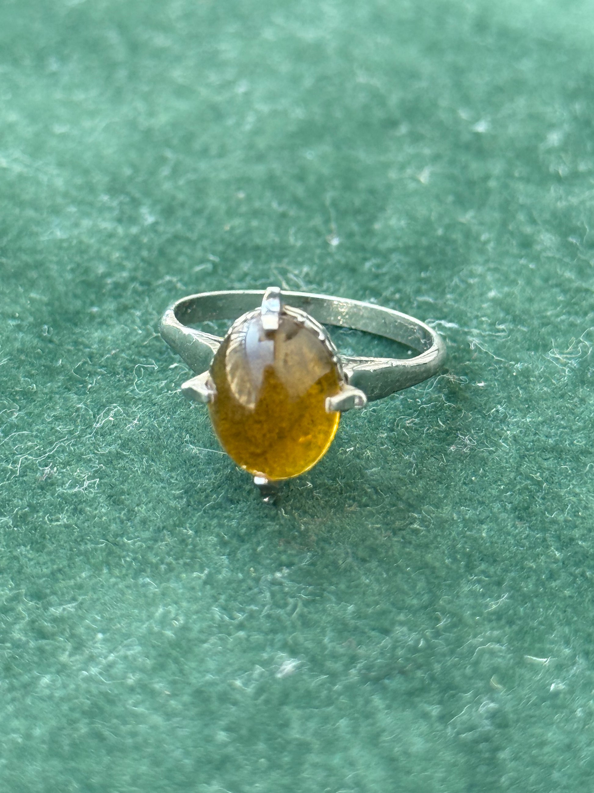 Charming vintage sterling silver ring set with a warm golden-yellow cabochon stone in a classic 4-prong solitaire setting.