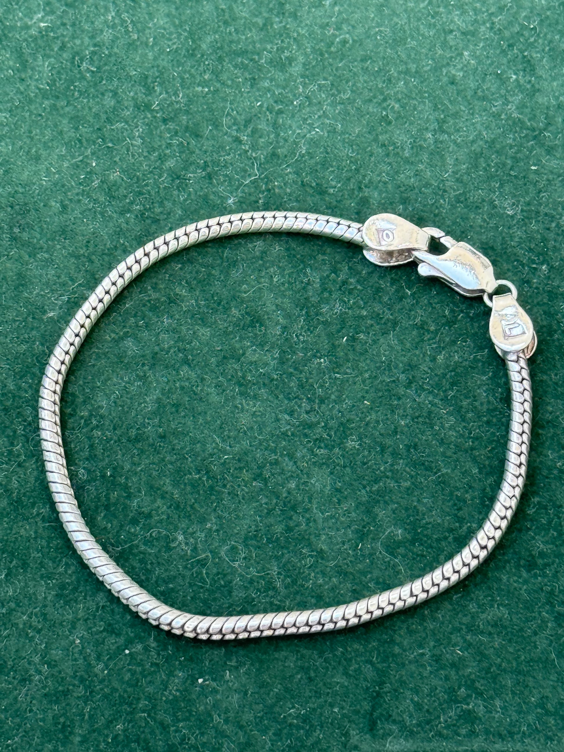 Timeless vintage sterling silver bracelet in a sleek snake chain design. Features a sturdy lobster clasp closure. The smooth and flexible construction makes it a versatile everyday piece that pairs well with both casual and formal wear.