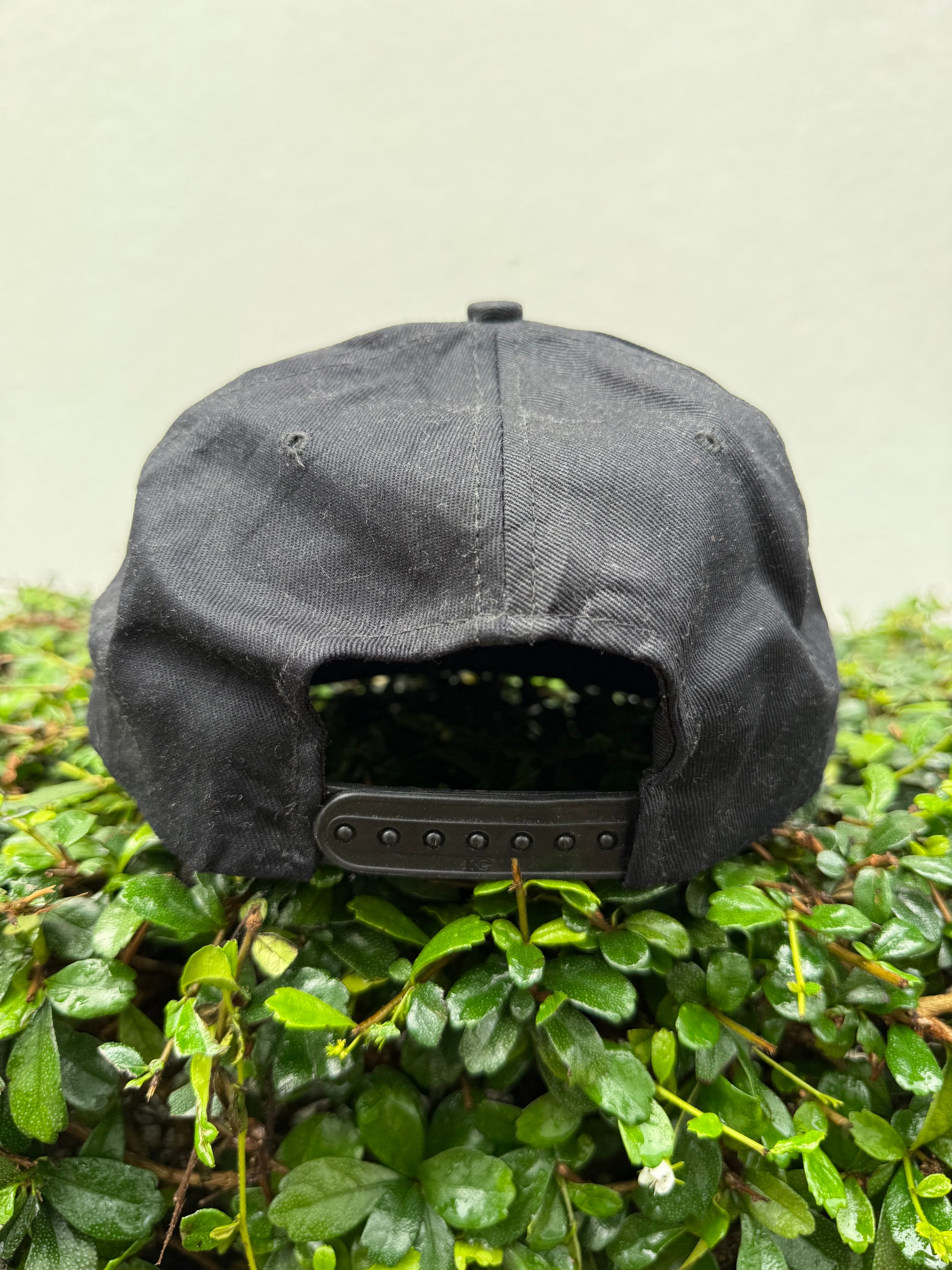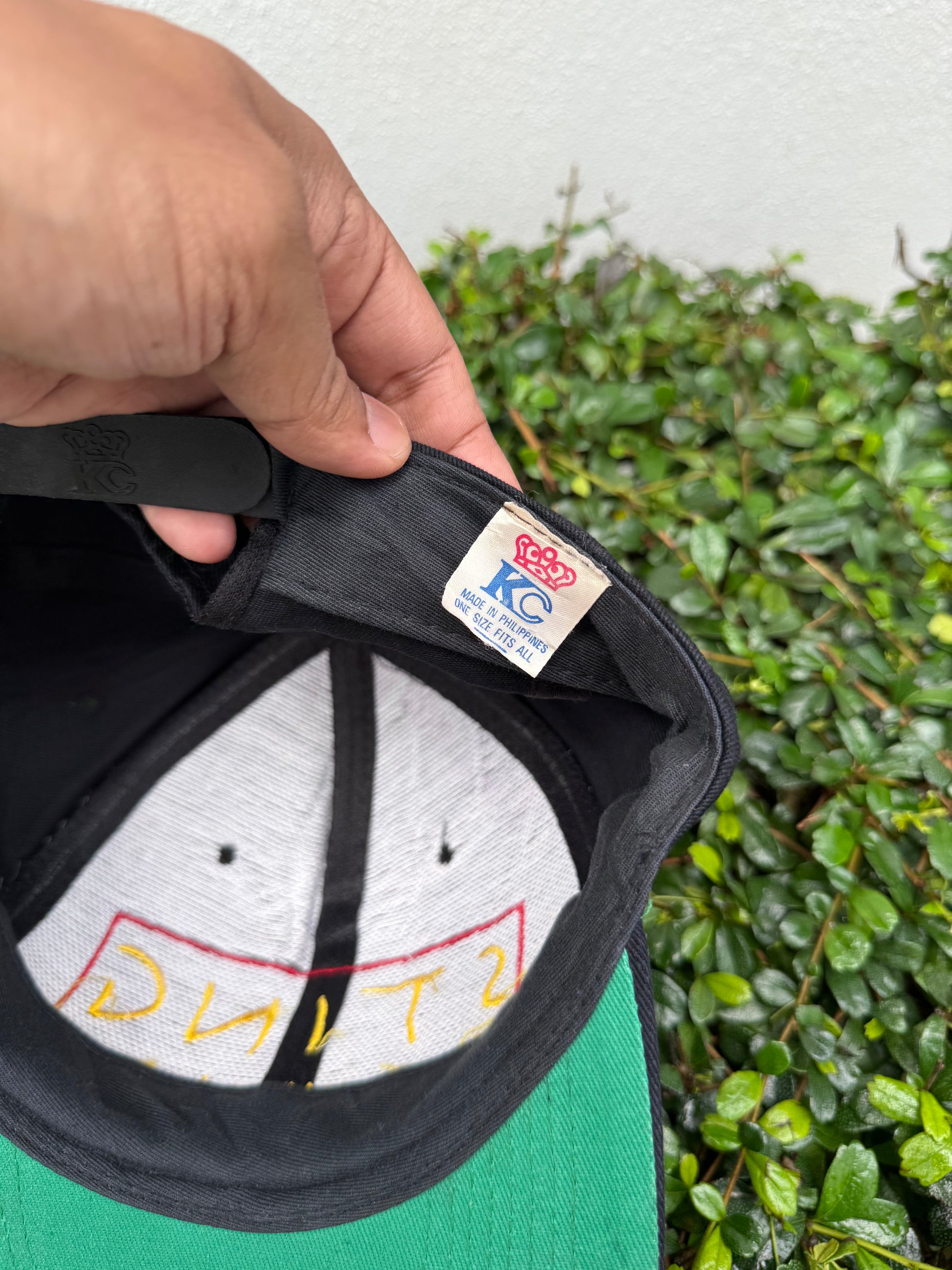 Original vintage Sting – Ten Summoner’s Tales promo cap from the early 1990s. Features bold embroidered yellow/red tour logo on black body. Produced by KC Brand, Made in Philippines, one size fits all with snapback closure. Classic green underbrim typical of 90s headwear.