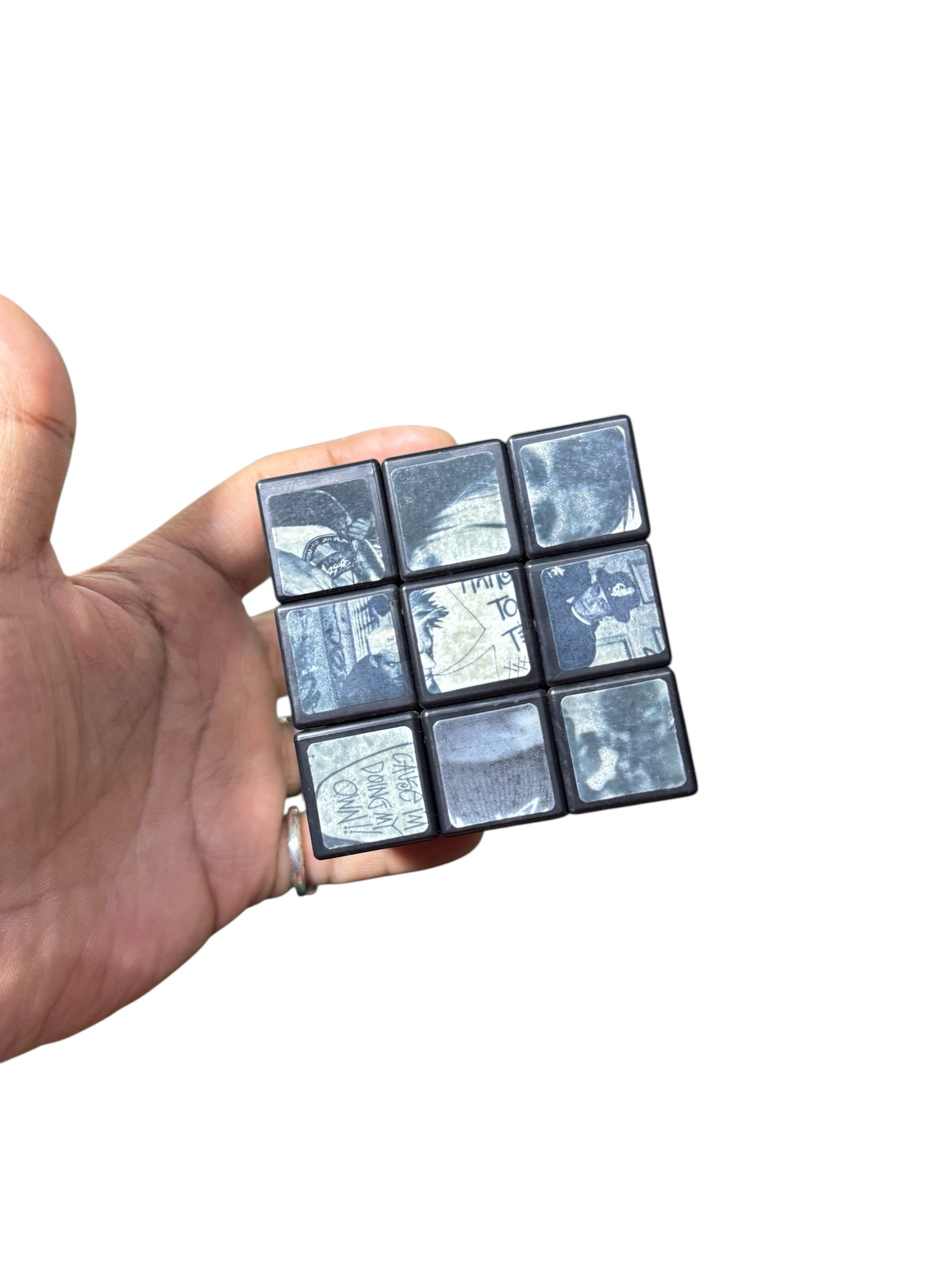 Original vintage Stüssy Rubik-style puzzle cube featuring grayscale graphic panels, photo collage artwork, and classic Stüssy script logos across multiple sides.