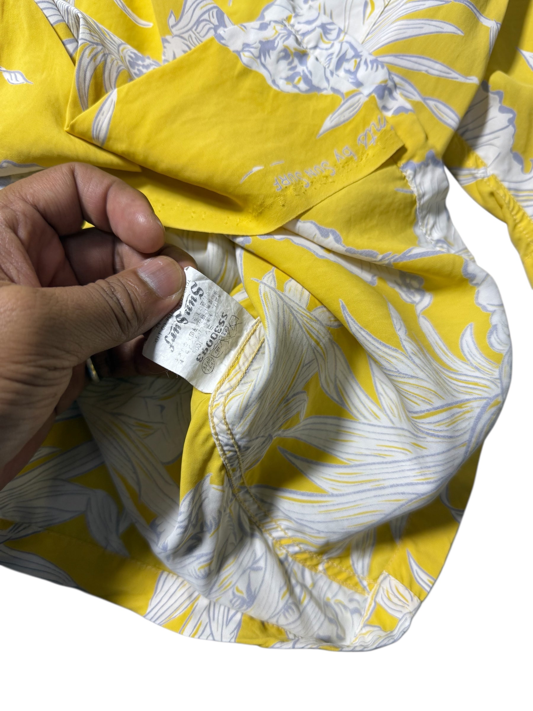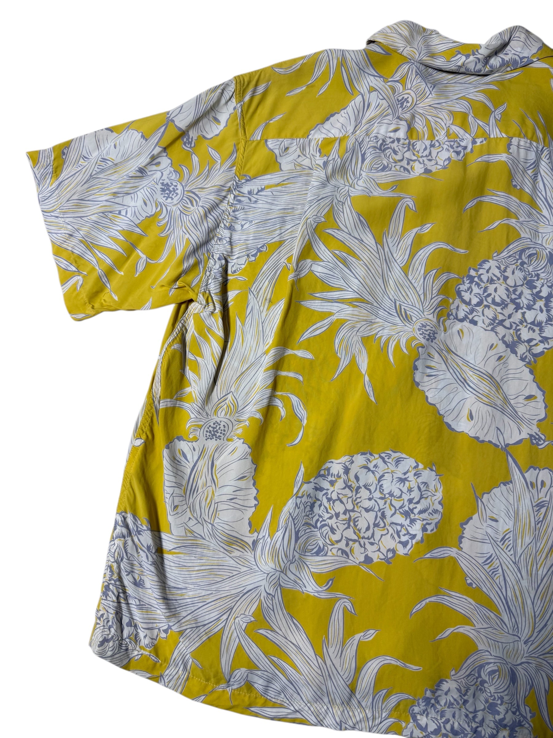 Sun Surf Hawaiian rayon shirt featuring a bold yellow base with soft white pineapple and tropical leaf artwork. Smooth, lightweight, and drapey, classic Sun Surf feel.