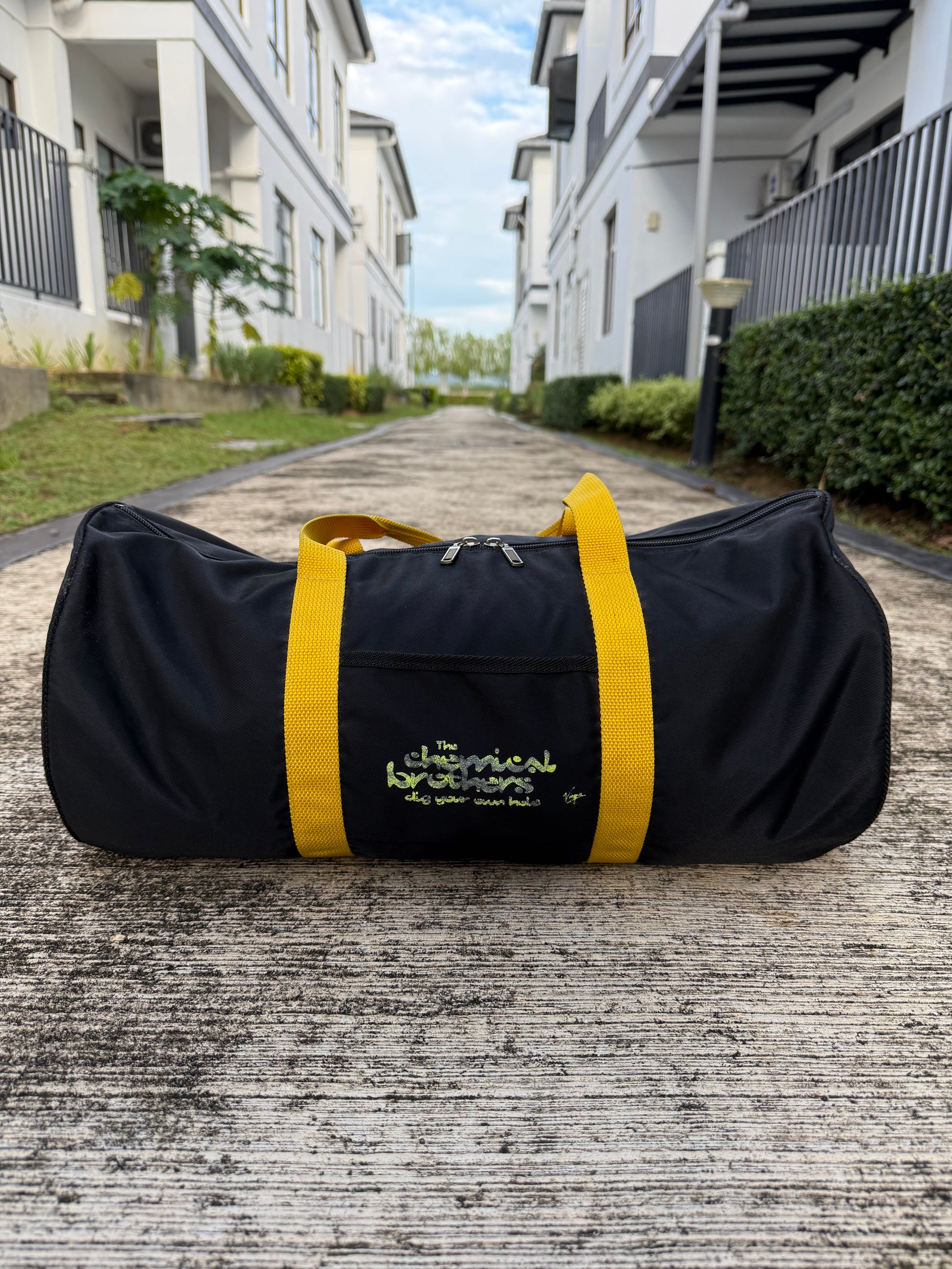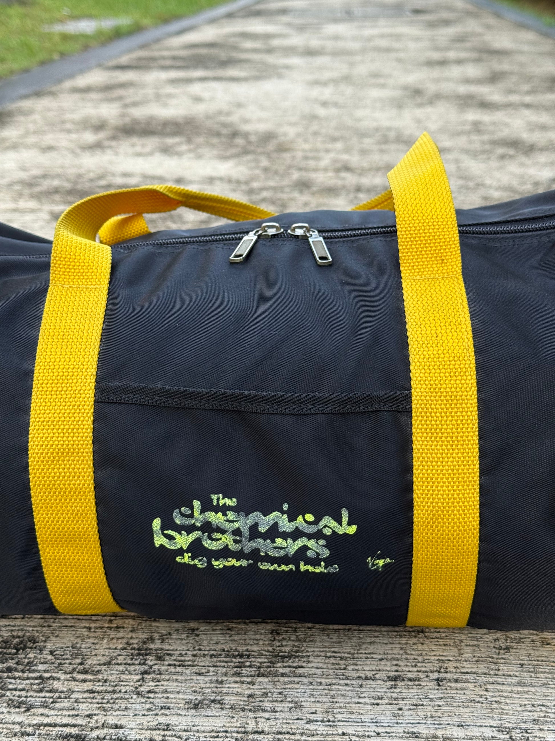 Rare promotional duffle bag from iconic electronic duo The Chemical Brothers, referencing their 1997 breakthrough album “Dig Your Own Hole.”