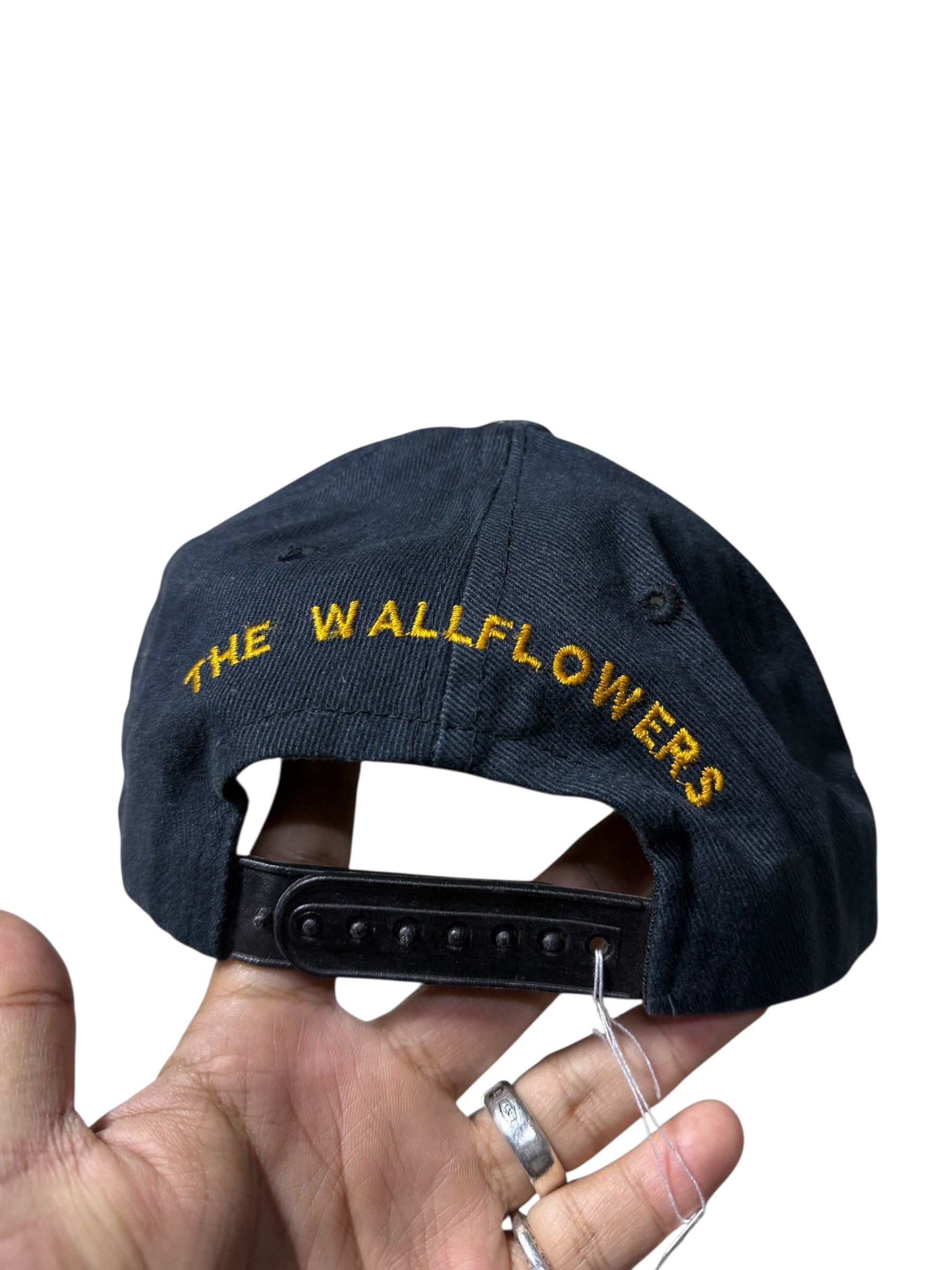 Vintage The Wallflowers band cap featuring embroidered logo on the front and band name on the back. Black cotton cap with adjustable snapback. Clean, minimal 90s alternative rock merchandise.