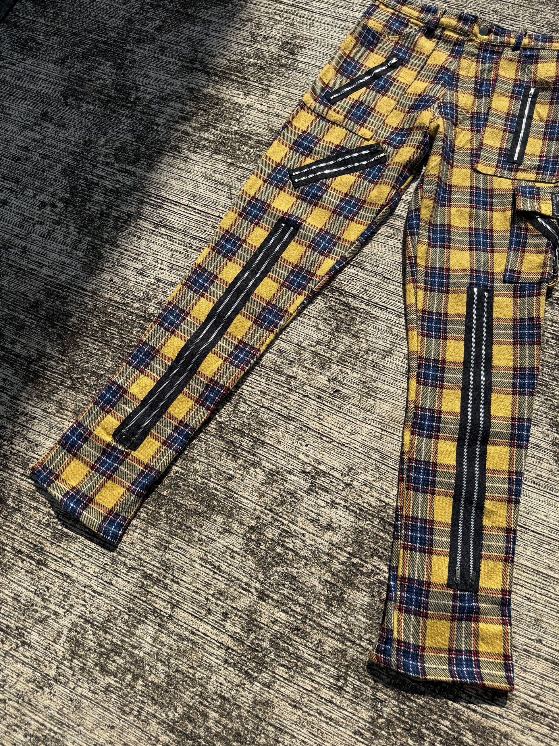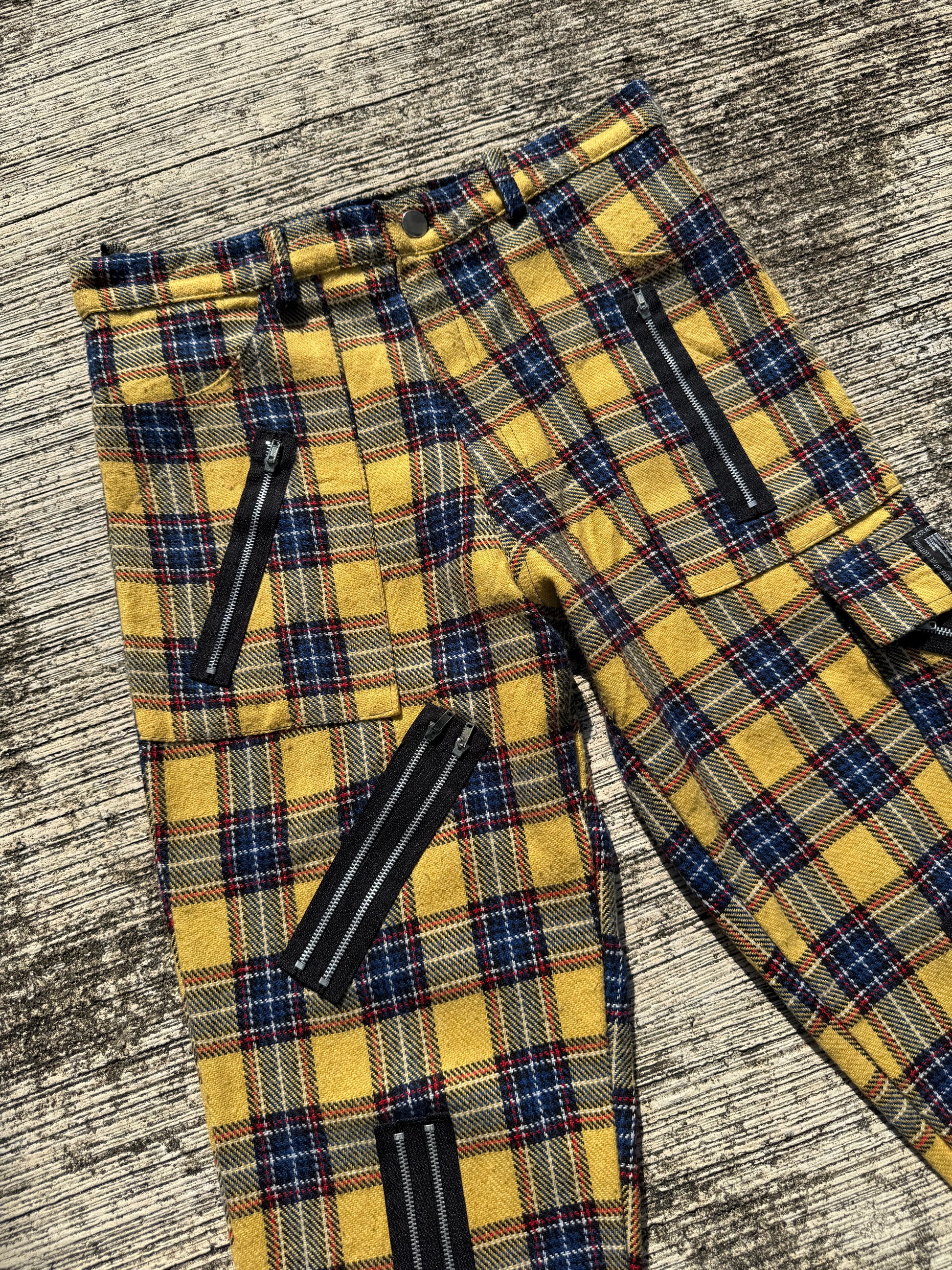 Bold vintage Tiger of London tartan pants featuring iconic punk styling with heavy zip details throughout. Yellow, navy, red check pattern with multiple functional and decorative zippers on the front, sides, and back. Straight fit cut, mid-weight cotton blend with great structure. Classic UK punk/alternative piece from one of the most recognized underground brands.