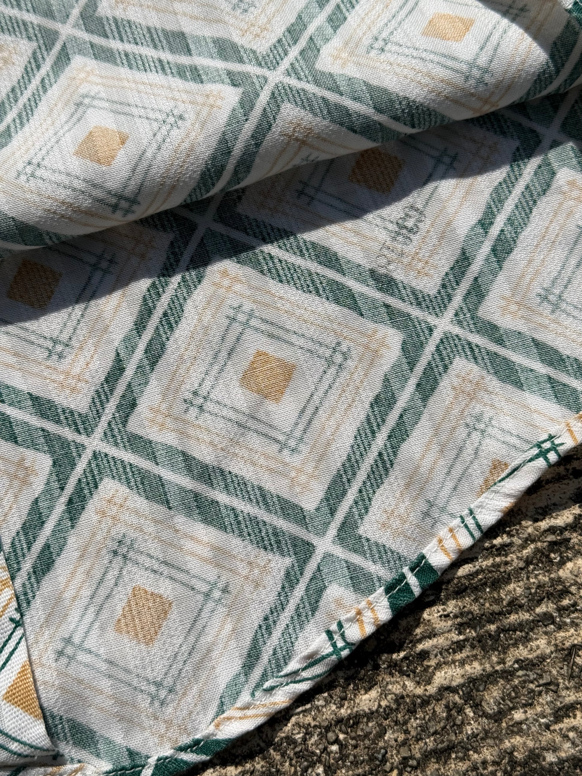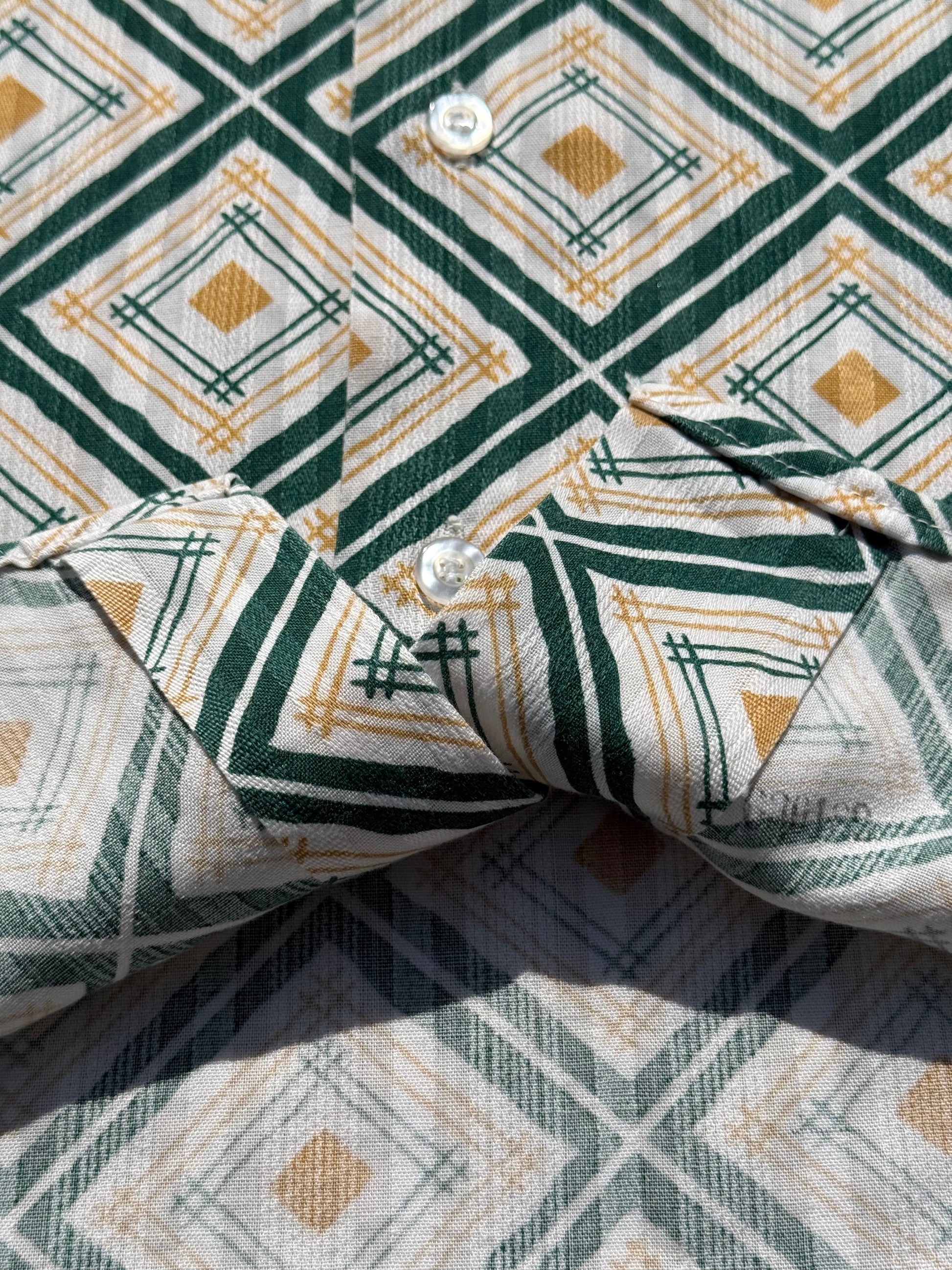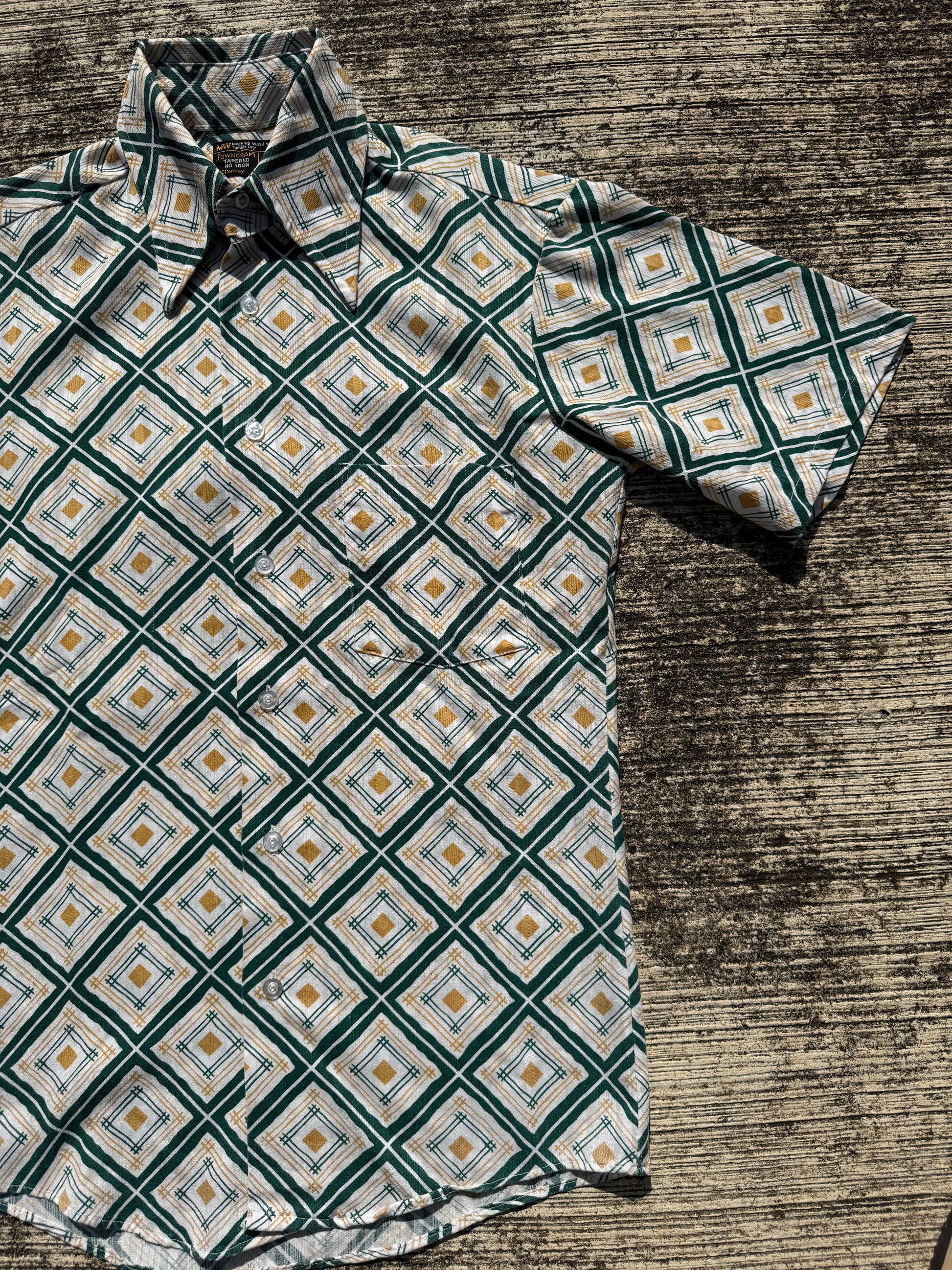 Vintage Towncraft Tapered No Iron short sleeve shirt by JCPenney, featuring bold green and mustard diamond geometric all-over print. Classic pointed collar with single chest pocket and button front. Early 1960s–1970s era Towncraft label (S size, 14–14½). Lightweight poly-cotton blend fabric with crisp finish. A true mid-century mod style shirt, collectible and wearable.