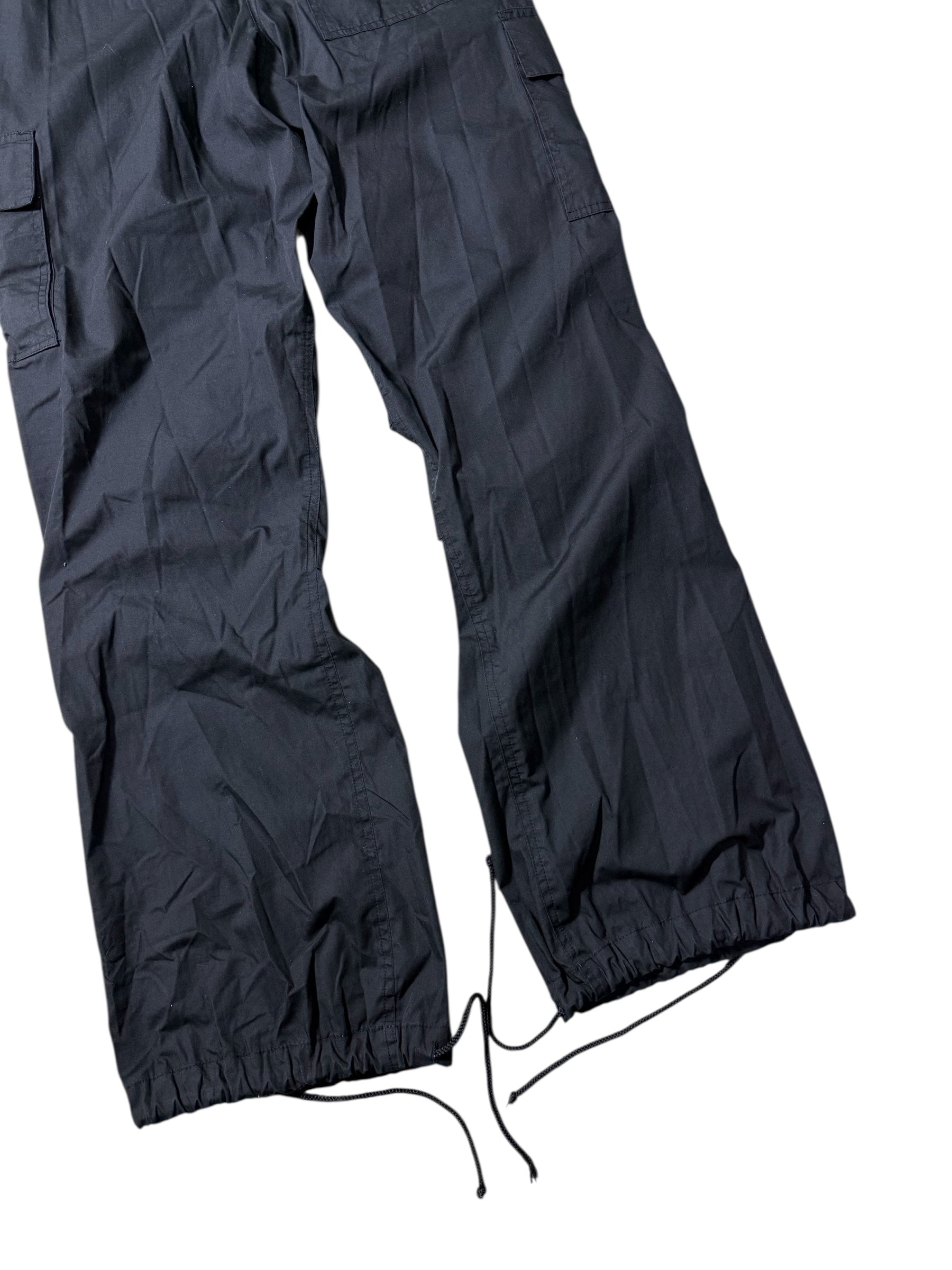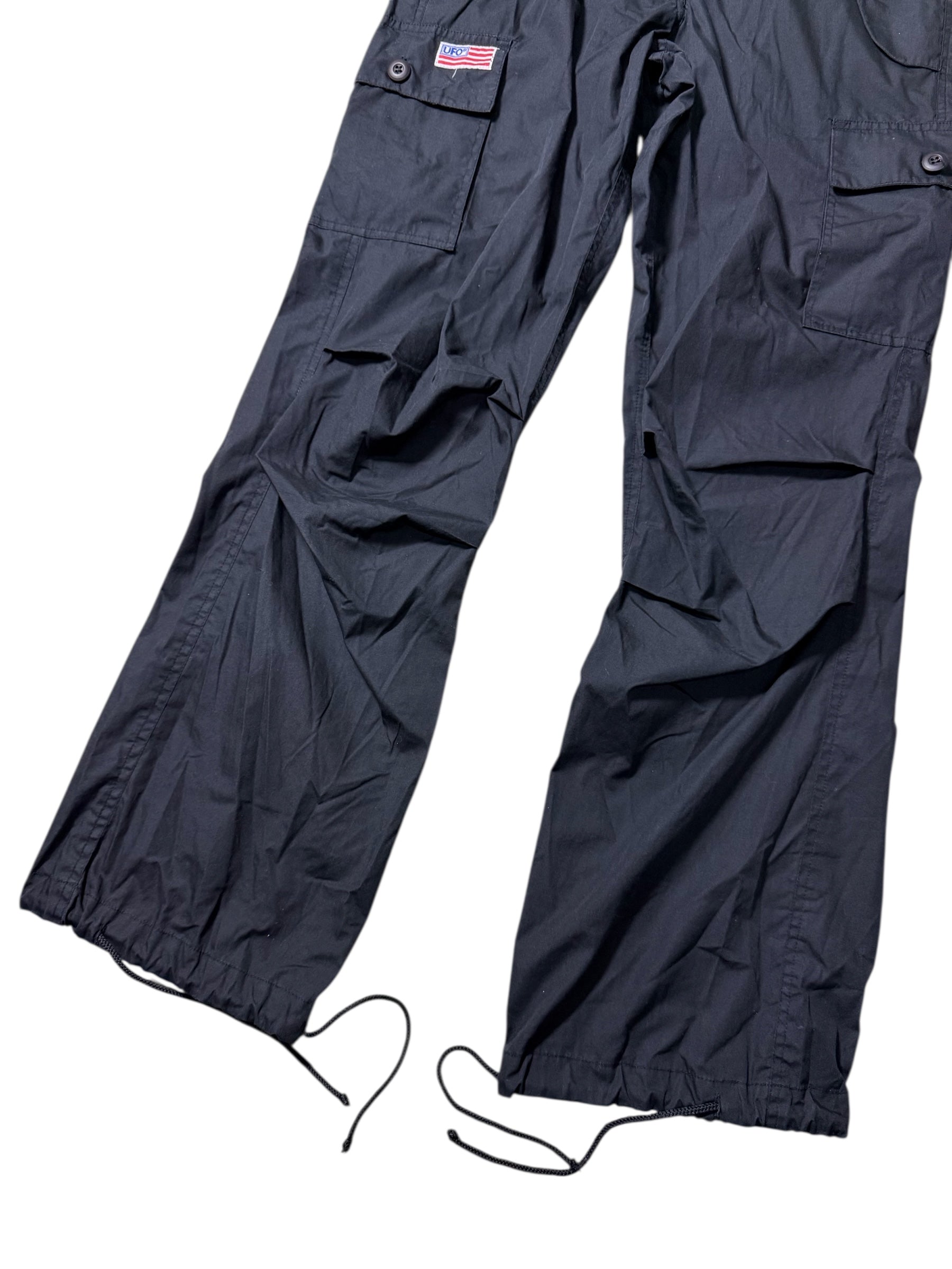 Black tactical-style cargo pants by UFO featuring a clean matte black base with multi functional flap pockets and embroidered USA flag patch detail. Early-2000s streetwear/military-inspired design with zip fly front, lightweight utilitarian fabric, adjustable drawstring hems, and wide cargo silhouette. Gives a strong techwear, Y2K, and urban military vibe.