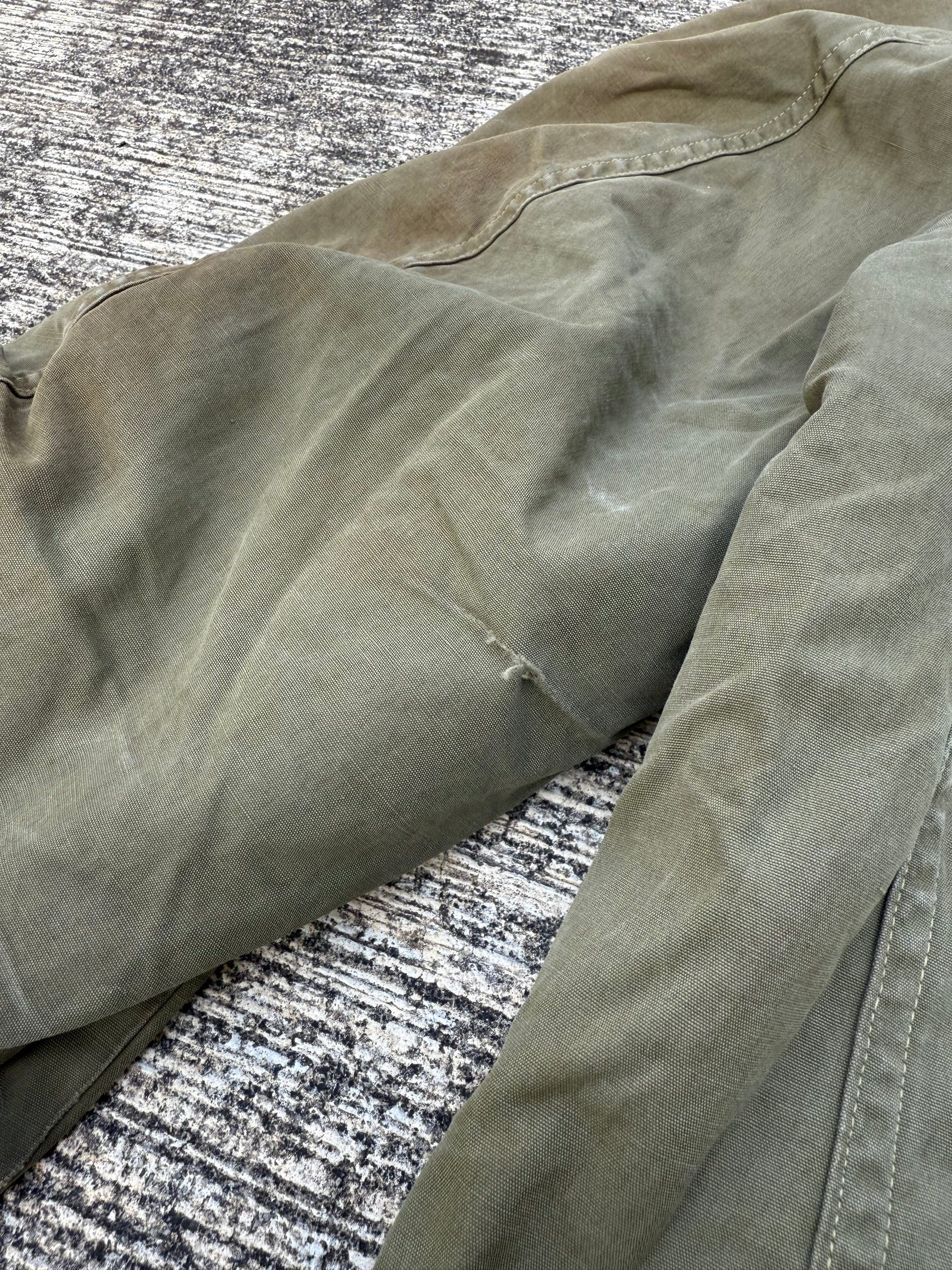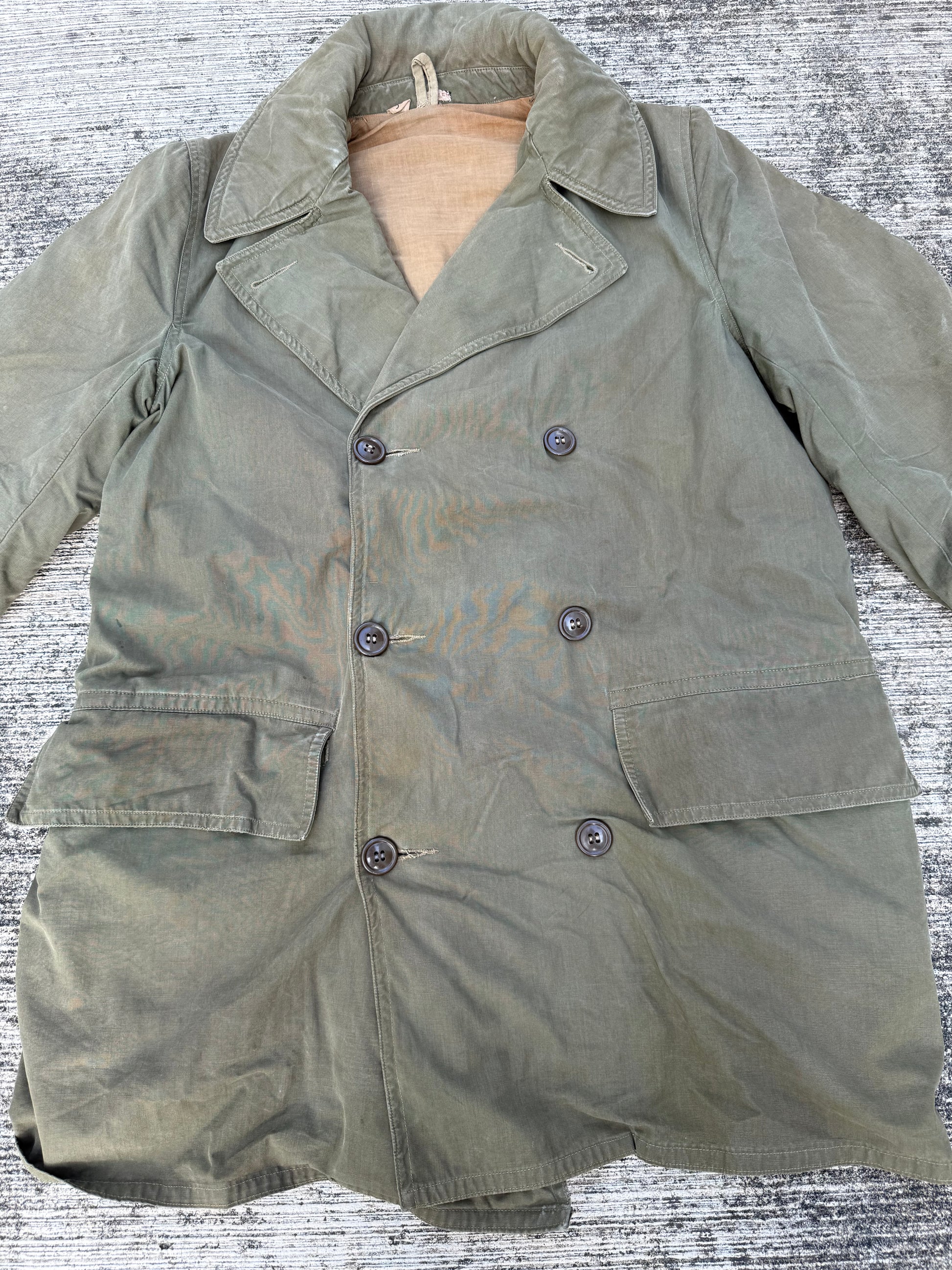 Authentic vintage WWII-era US Army M-43 field jacket in olive drab. Double-breasted front, large flap pockets, button cuffs, and wool lining for warmth. Classic military surplus piece with worn patina and small repairs, adding true character.
