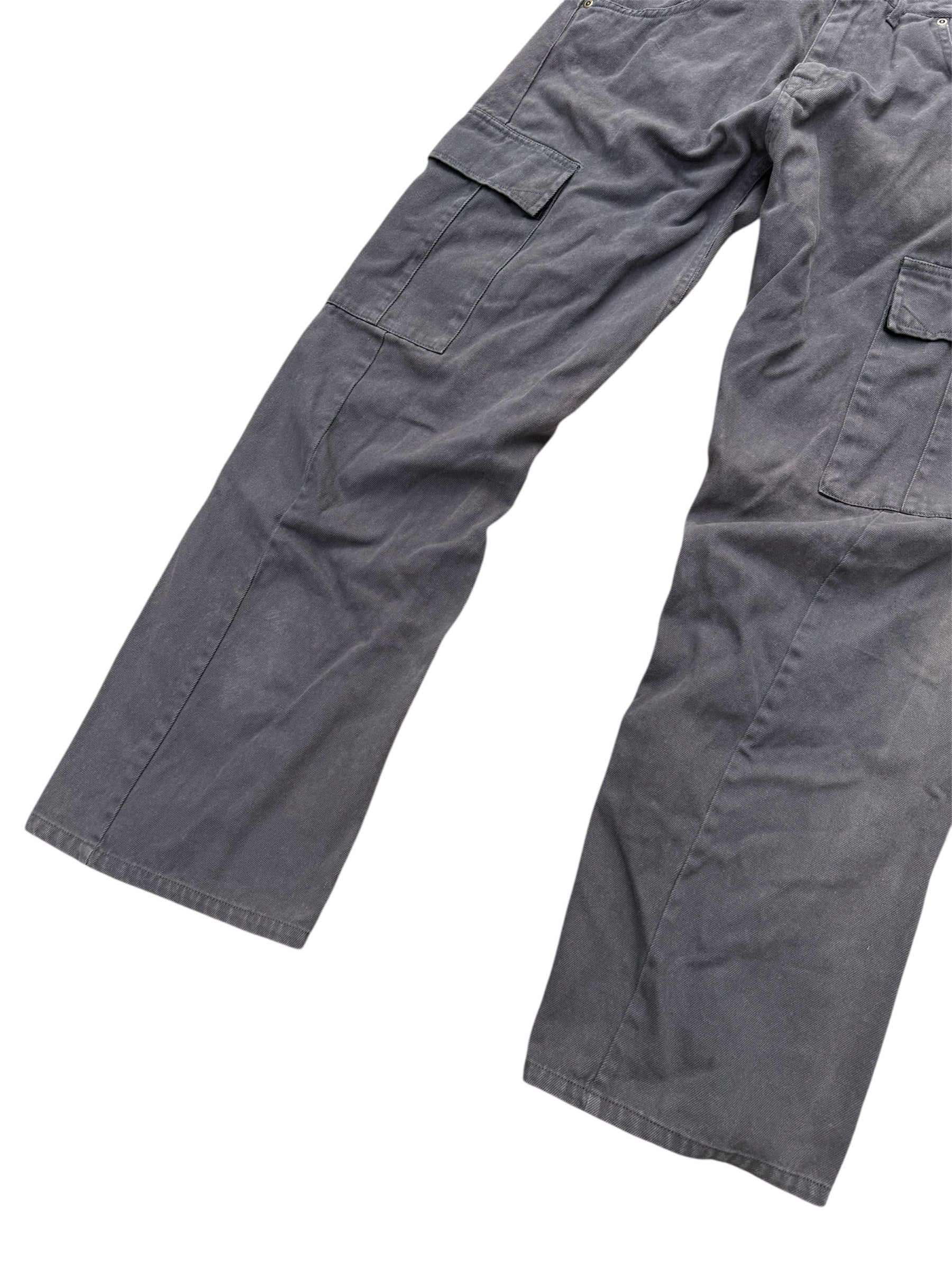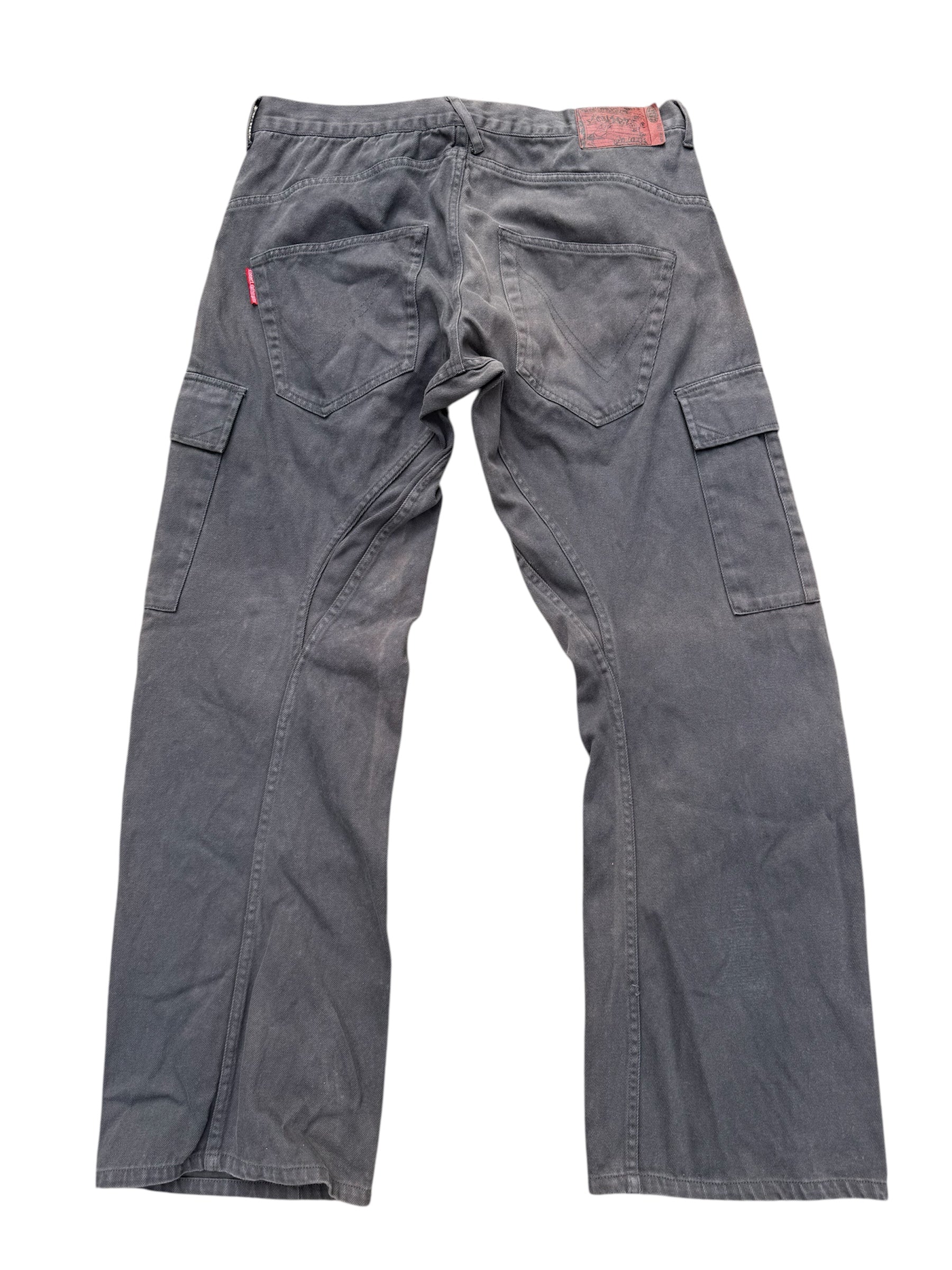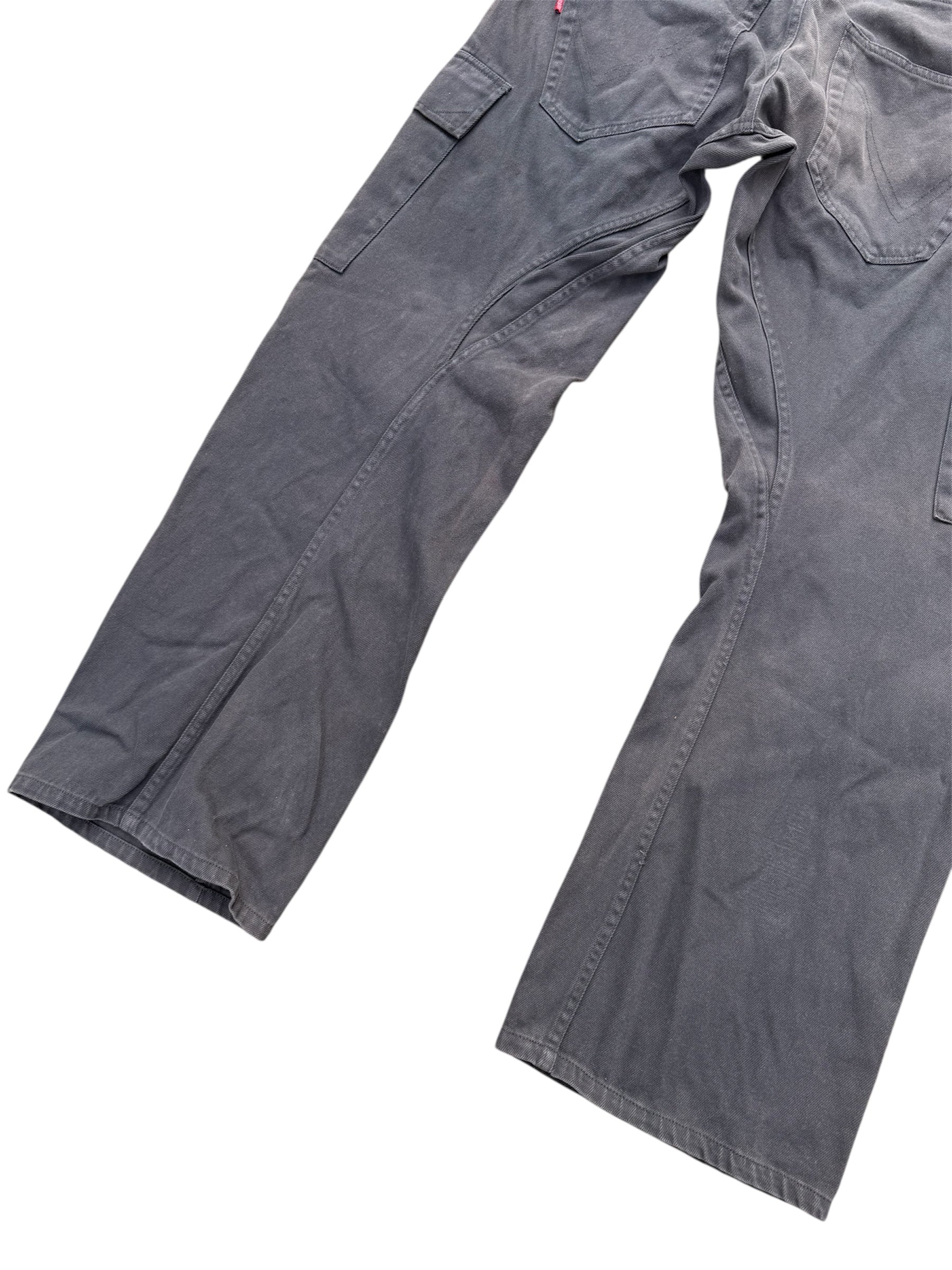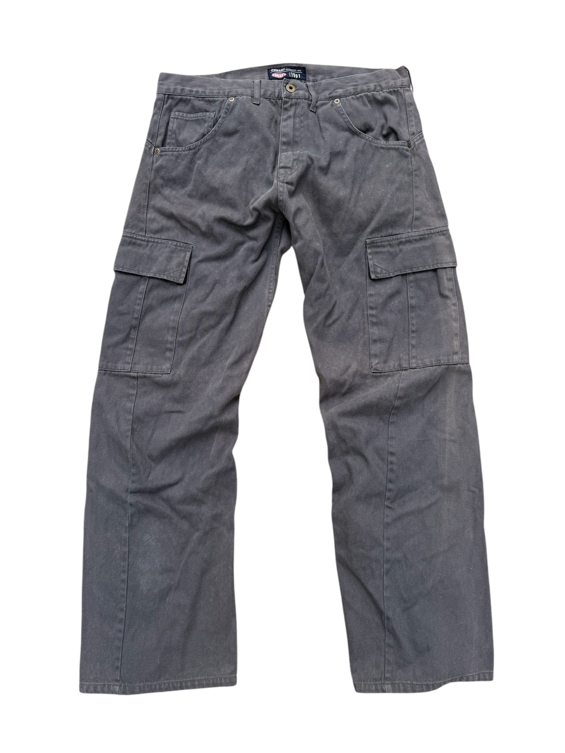 Classic CONART cargo pants from the 2000s streetwear era, known for its roots in Los Angeles graffiti and West Coast hip-hop culture. Features washed charcoal grey tone with utility pockets and relaxed straight fit, giving true old-school street look. Constructed from 100% cotton heavy twill with metal hardware, classic 6-pocket cargo layout, back V-stitch pockets, and CONART branded leather patch at rear waistband.