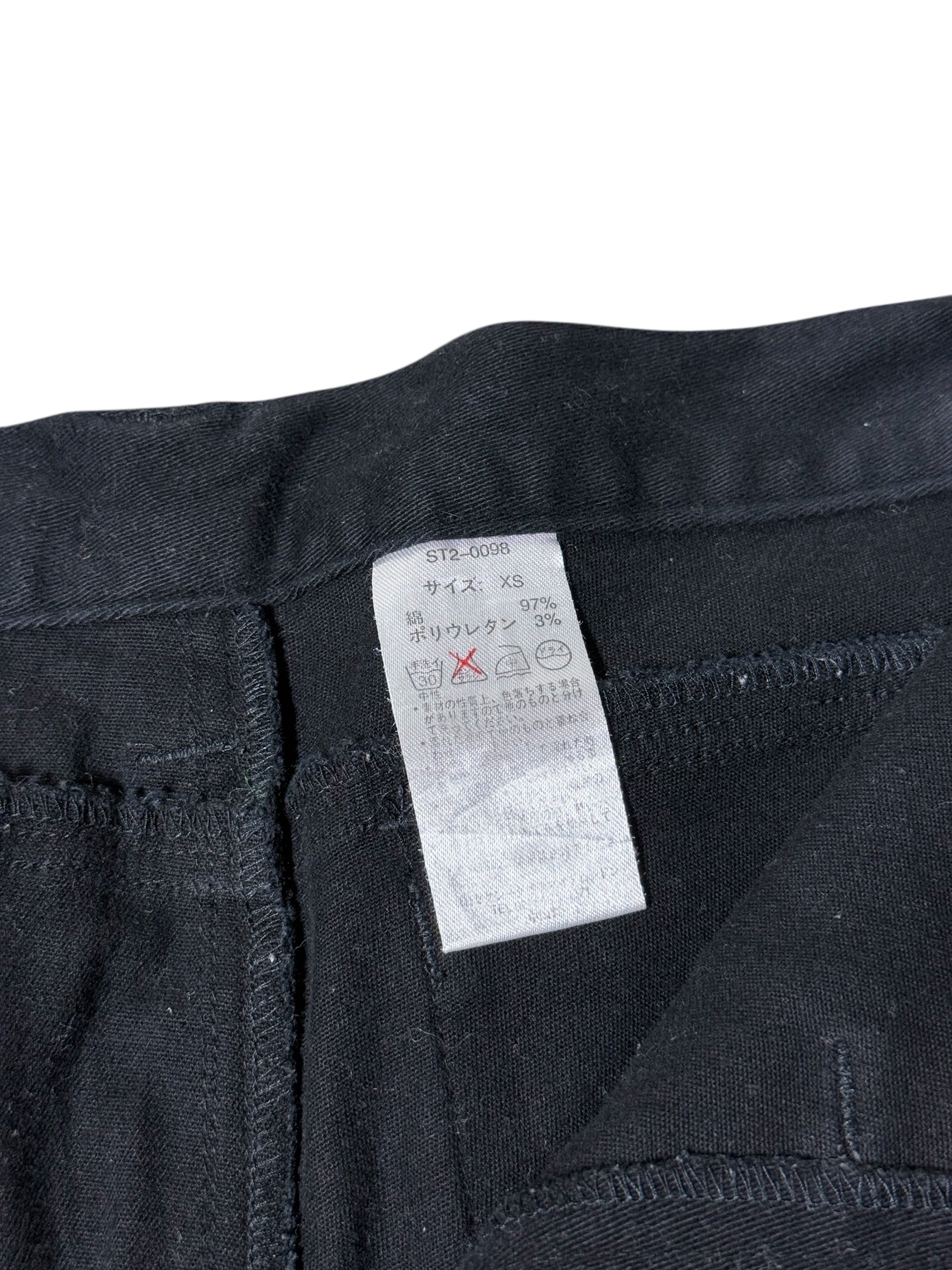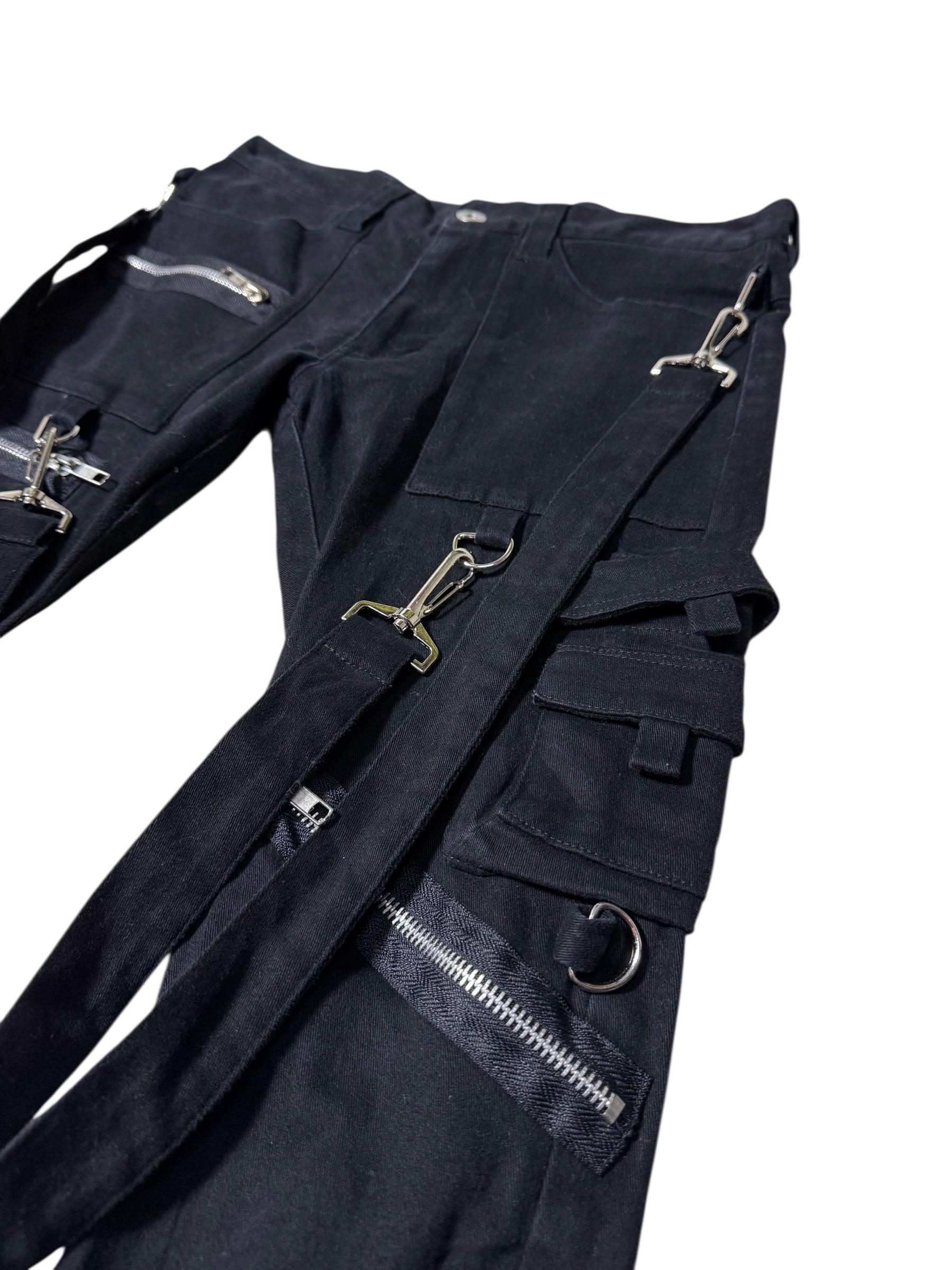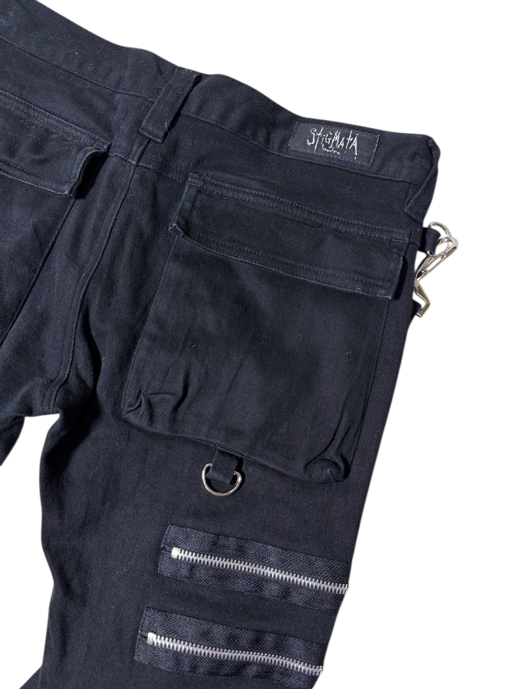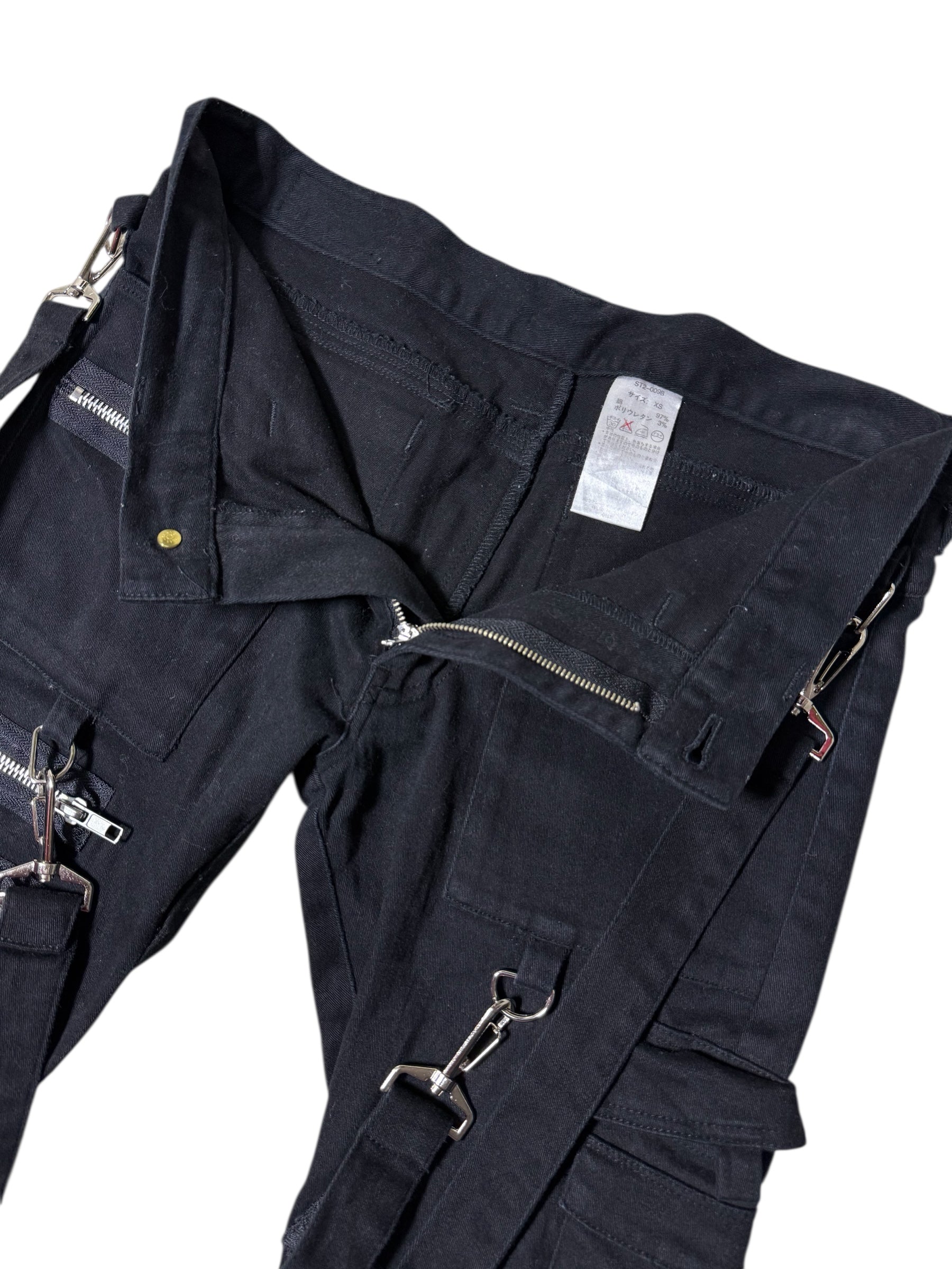 Early 2000s Stigmata / Sexy Dynamite London punk pants loaded with signature industrial straps, heavy metal hardware, and bold multi-zip detailing. Classic Harajuku / Visual Kei era design, slim fit, cargo pockets, and detachable straps for that true 2000s Japanese alt look.